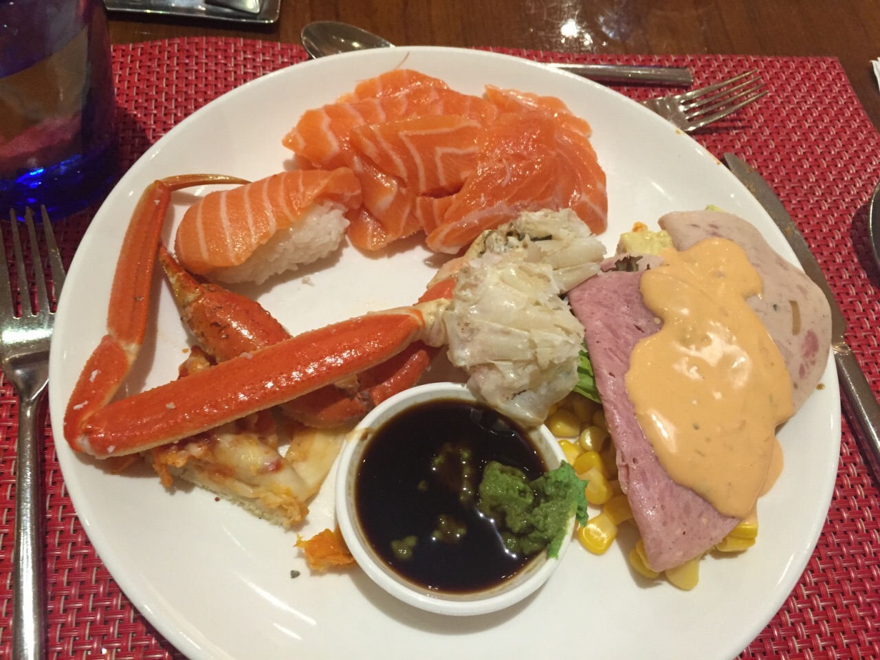 去东荟城购物,晚上在这里一层的自助餐厅吃的晚餐。两个人一共花了不到五百港币。餐厅很大,菜品非常多。三文鱼刺身和蟹腿很不错。烤肠的味道可以和我在英国吃的媲美。各式香港的粥、面、烧腊味道都很赞。服务员收盘子还算及时。整体感觉不错。