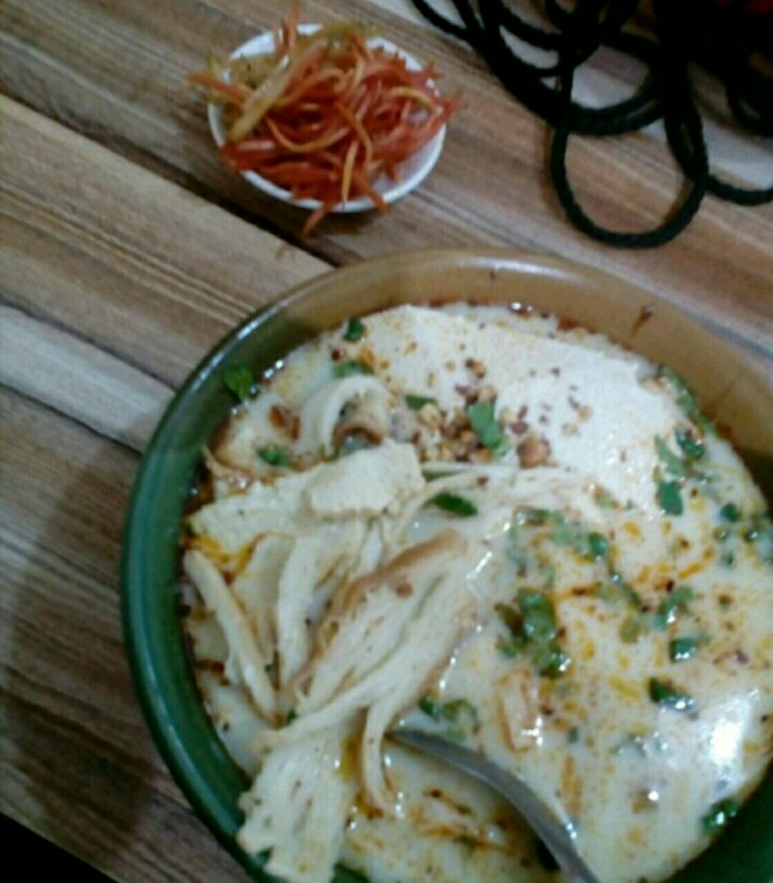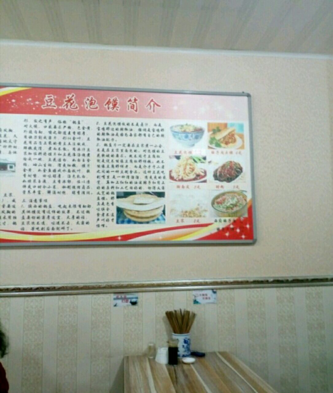一,口味: 豆花泡馍:小碗,也是蛮大的一份。豆香浓郁,还放了花生碎,香菜,馍也煮得好。另外,有赠送小菜,是红萝卜丝与咸菜丝。 另外,店里还有凉皮,醋粉等,希望有机会再吃。 豆浆,有糖,可以自己加。 二,环境: 店里收拾得蛮干净的。虽然店不是很大,桌上配有调料。 三,服务: 老板与端饭的阿姨都很好,朴实。不错的店。