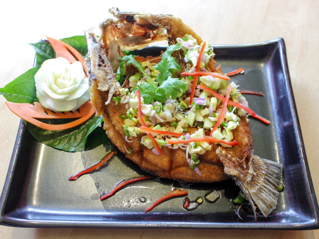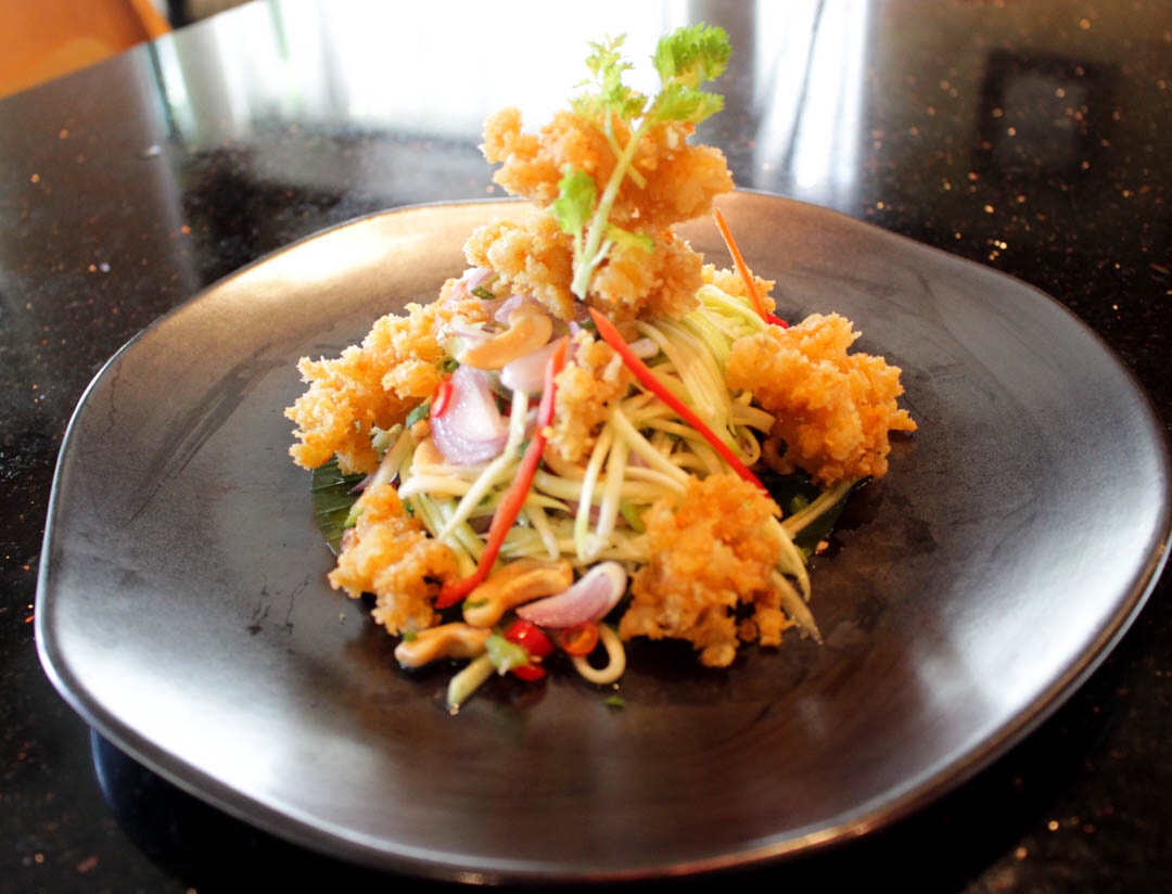 Lotus Court 贵为这家一岛一酒店的全天开放餐厅,从本地的泰国菜以致国际佳肴,菜单的种类应有尽有。 Goong Fu Yam Mamueang传统来说这个菜由于成本的关系都是用一般鲶鱼来做主角,剁碎再炸,配搭着酸芒果和汁一起吃。可是这里用上的新鲜的虾,整个菜就马上升价十倍。 Geng Phed Brad Yang Lychee 这个鸭肉咖喱特别之处在于餐厅会按着时令加入不同的水果,例如是菠萝、荔枝或是木瓜等。各式水果可以中和咖喱和香料本身的辣味,十分独特。 传统意大利甜点Panna Cotta把牛奶、奶油和新鲜的香草籽凝固。绕上橘子汁和新鲜橘子,焗干的橙片用作点缀,把先前吃过的所有主菜味道做完美的平衡。 传统泰式甜点Tub Tim Krob 内有荸荠 Pla Tord Samun Phai 泰式草药炸鱼 Gai Tom Cumin 泰国人相信姜黄可以帮助消化和排毒,这个鸡汤没有冬阴功的激情,就是单纯而有益的一个泰国补汤。 客人要到这家餐厅要么走猴子山径,要么坐酒店的私人快艇。