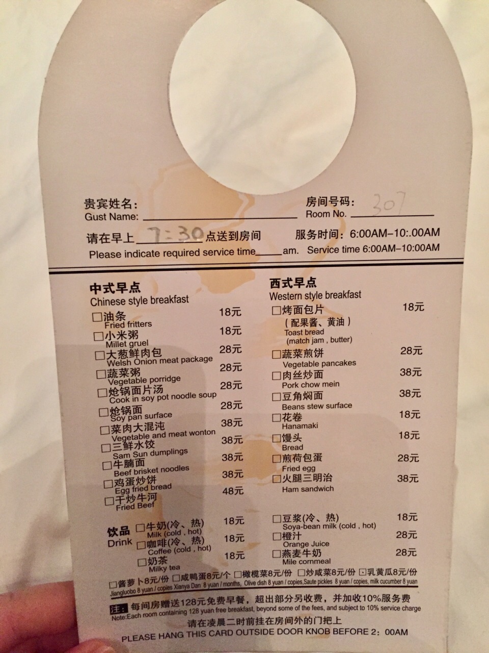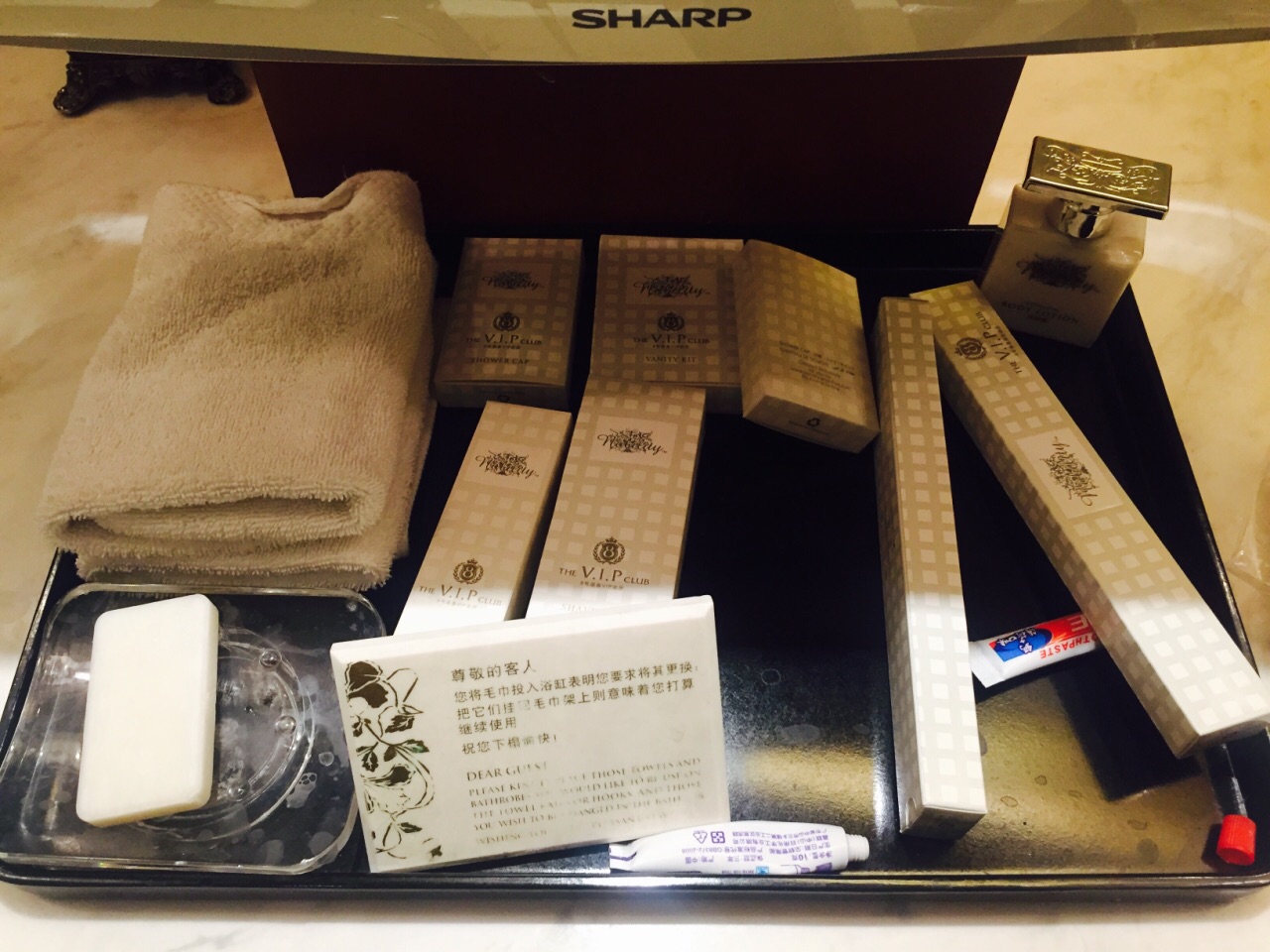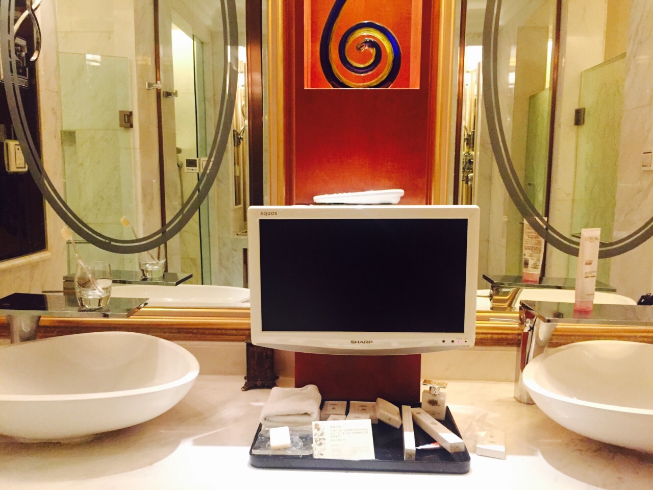 朝阳公园附近的8号公馆绝对堪称高端大气上档次,从气派的大楼外部装修,到房间里的金碧辉煌无不透露出一种贵气。苹果电脑、室内圆形浴缸、双人洗漱操作台、舒适的床品、早餐送到房间服务以及阳台超大的露台,服务员很有眼力见儿,热情负责,早上到露台上呼吸下新鲜空气,如果不是雾霾与刚下过雨的潮气,风景应该会更美!整体还是比较满意的!