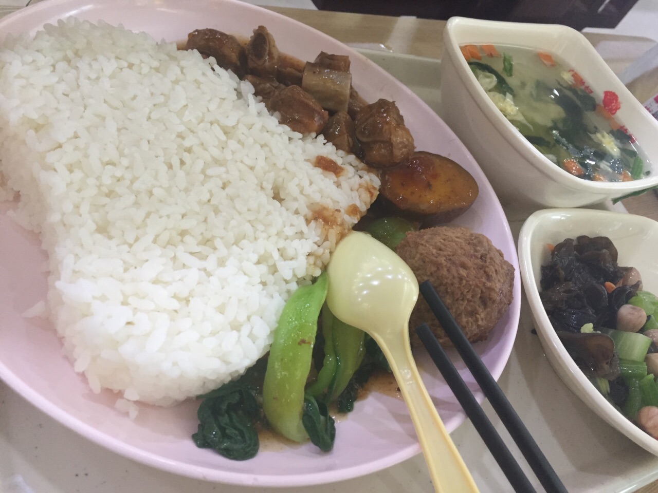 太原南站有家店,除了特色肉食,像酱肉、肥肠、猪肚之类的,还有快餐:牛肉面、排骨饭等。排骨饭套餐26元一份,单点的丸子4元一个,味道在快餐里算比较好的。套餐里配的汤是速溶的,调料味重;又加了瓶沙棘果汁,5元,不贵。
