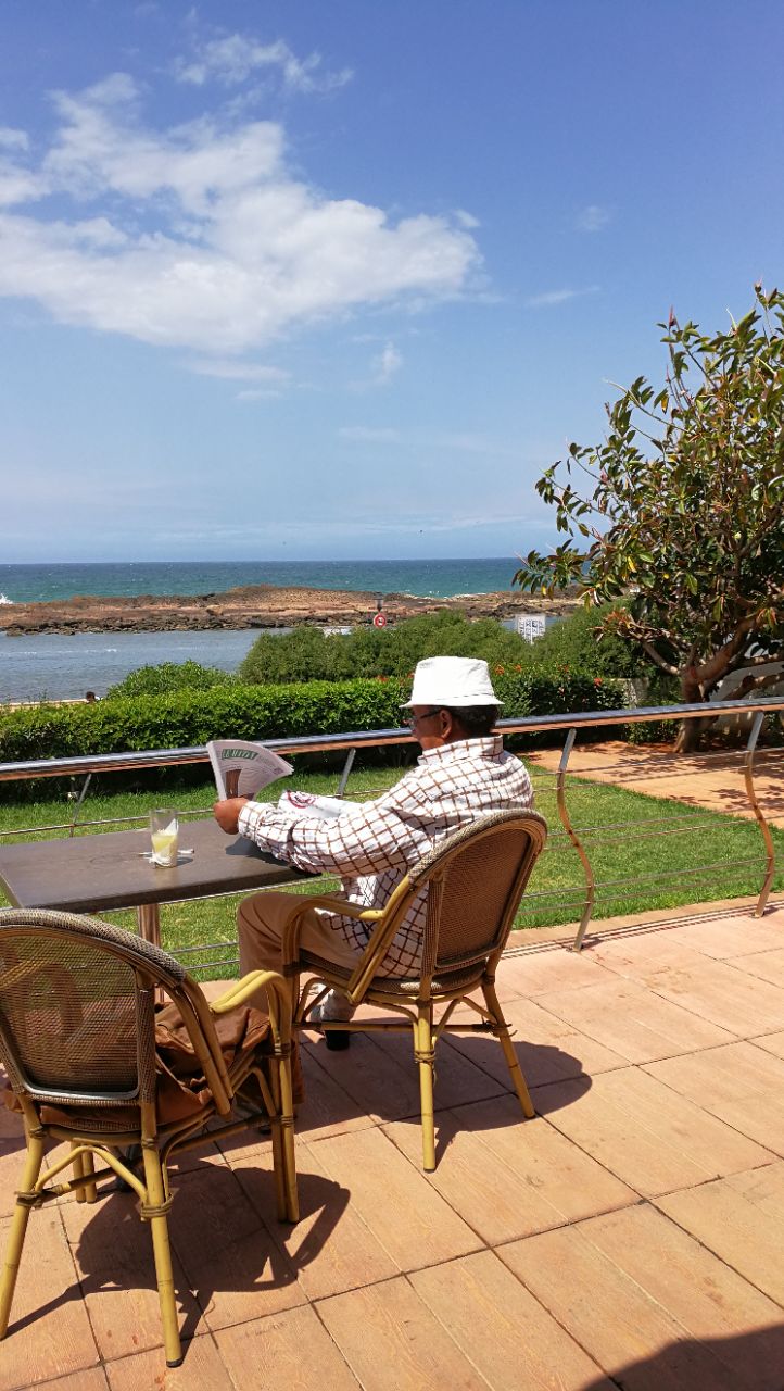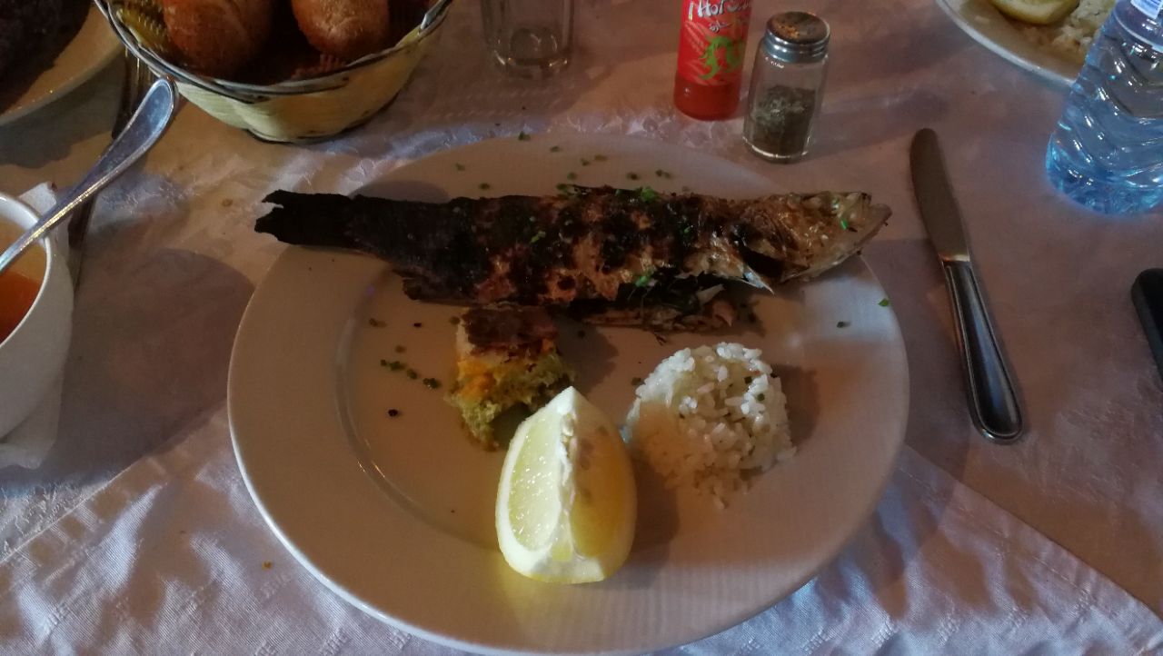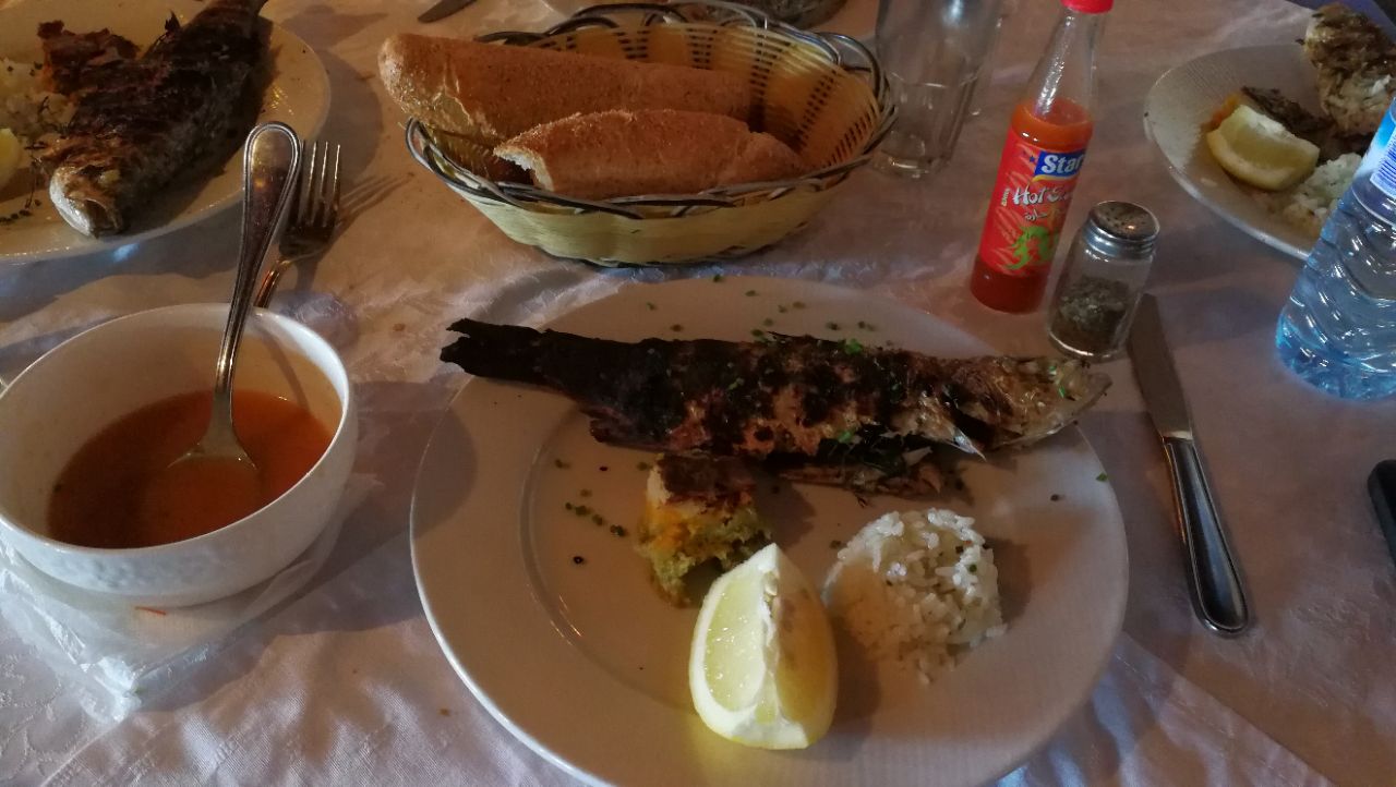 Golden Fish____位于海边的一家吃鱼的饭店,景色很美,坐在餐厅可以看见大海,我们吃的烤鱼套餐,第一次在摩洛哥吃鱼,味道还不错,鱼新鲜而清单,挤上柠檬汁,一股清香的味道,这里用餐很简洁,基本就是三道式,一道汤/二道蔬菜沙拉/三就是主菜,水果收尾,很健康.