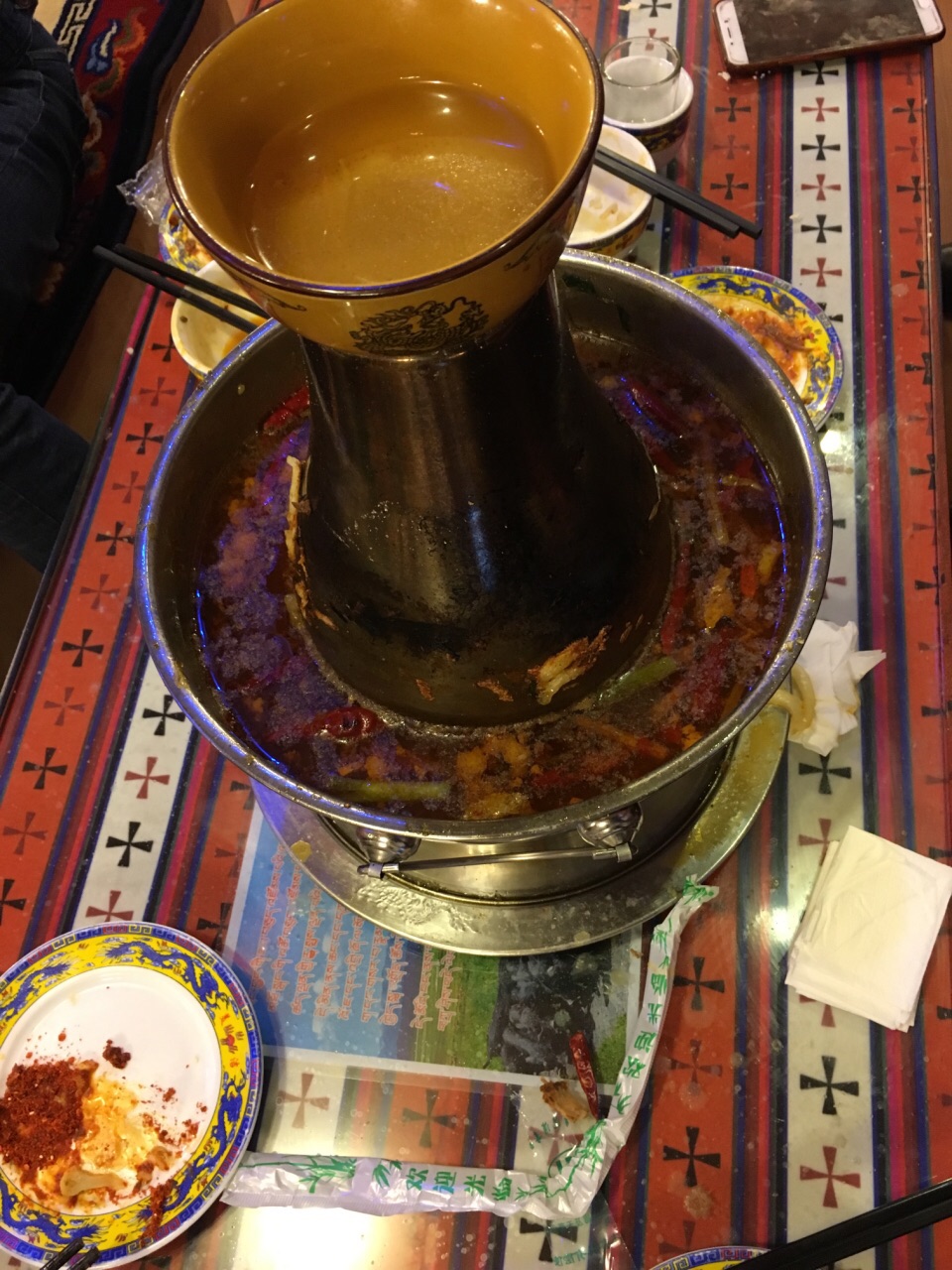 先来了一壶酥油茶,嘿起来很有藏区百姓家的那种味道,老板给我们介绍说酥油是100斤牛奶浓缩出一斤酥油,在藏区很珍贵也是必喝的一种茶饮,还有缓解高原反应的作用,还叫了一盘手抓肉,味道很独特,没有什么膻味,占着四川辣椒吃的,很不错