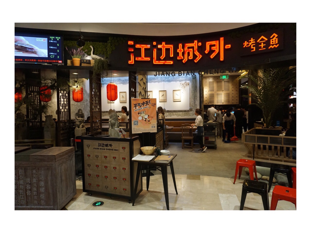 江边城外一直以来 个人非常钟爱的一家烤鱼店 从南京的第一家开业时就爱上了,会常常去吃 这家店开在景枫的4楼,门口的电子屏就可以看到等位桌数 有专门等位区,店铺装潢非常有特色,红色灯笼高高挂起 茶水自助,店员的服务贴心周到,上次速度也挺快哒,稍等片刻就可 川北凉粉,凉粉质细柔嫩,明而不透,筋力绵软,调料配味 山楂树之恋,酸甜开胃,怪味清江鱼,味道有点甜,鱼无刺,肉质细嫩且入味 川西遇香鸭,鸭子香气诱人,外酥里嫩,麻酱油麦菜,绿色健康,解油腻, 金丝豆沙饼,丝丝入扣,香酥可口,豆沙口感清甜,很喜欢 鲜奶龟苓膏,甜度刚好,口感Q弹,好满足的一顿