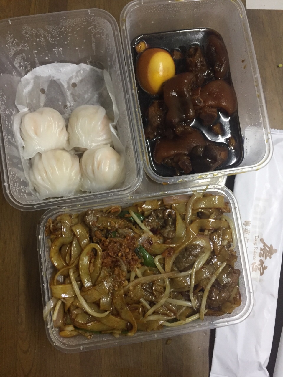 饿了么吃货节活动,满120减50,于是叫了外卖。大品牌就是值得信赖!避风塘炒牛河满满一大盒,足够两人吃;猪脚姜也比预期的量大,而且味道很好,软烂入味;虾饺皇个头大,馅里至少有两只大虾,比虾饺的性价比其实要高。送货速度也很快,来的时候都还很烫。大品牌就是质量有保障,不像一些餐馆,价格虽然优惠了,量也减少了,送的都跟小样似的!