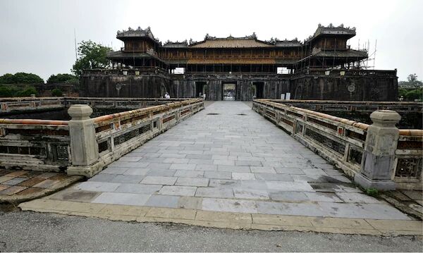 在顺化的皇城也有一个午门,而且外观和北京紫禁城的午门很相似,只是建筑规制规模低一些在顺化的皇城也有一个午门,而且外观和北京紫禁城的午门很相似,只是建筑规制规模低一些。午门由称五凤楼。凹型建筑。是宫城的正门。这个门呢,有点太沧桑了。
