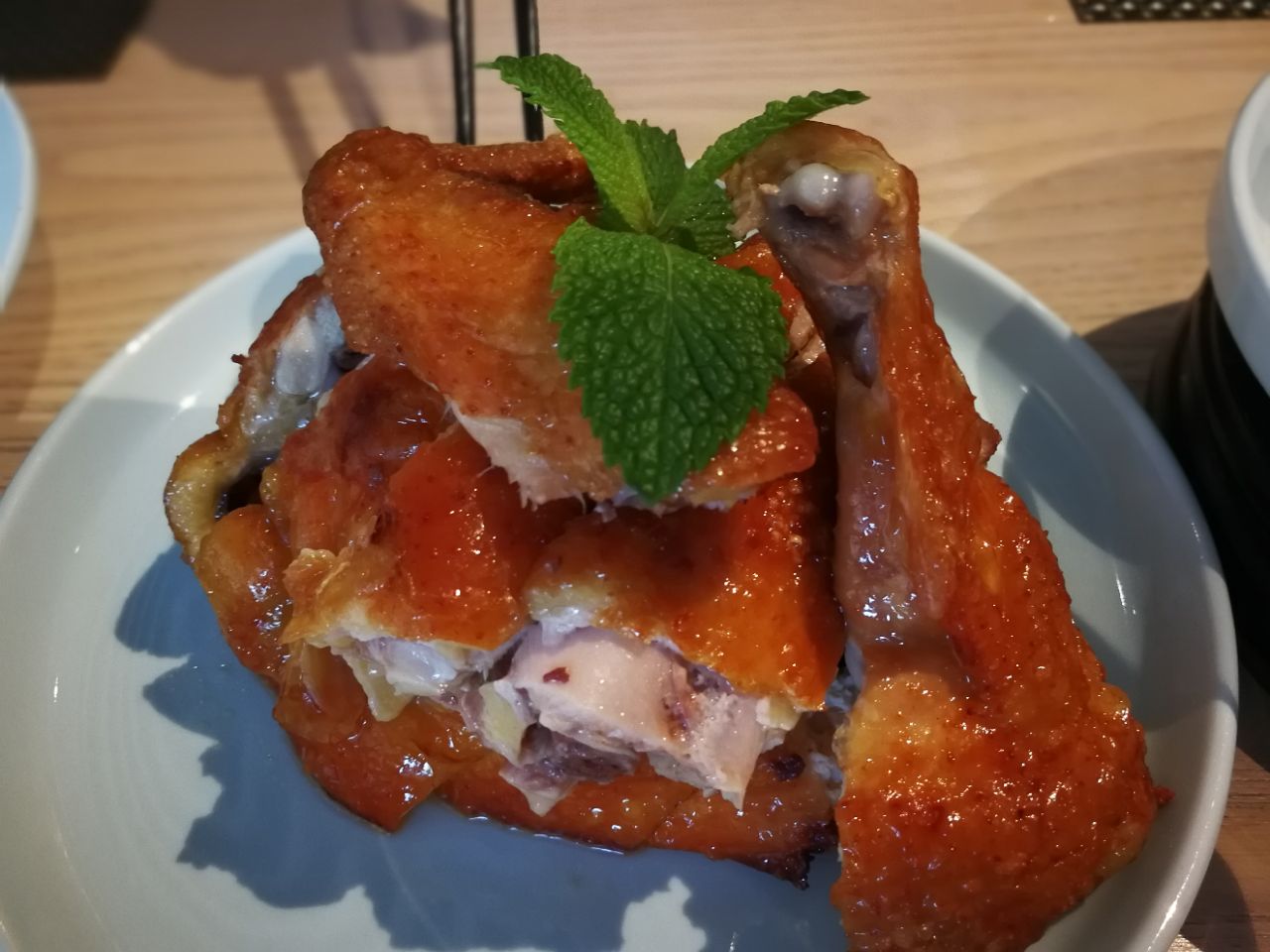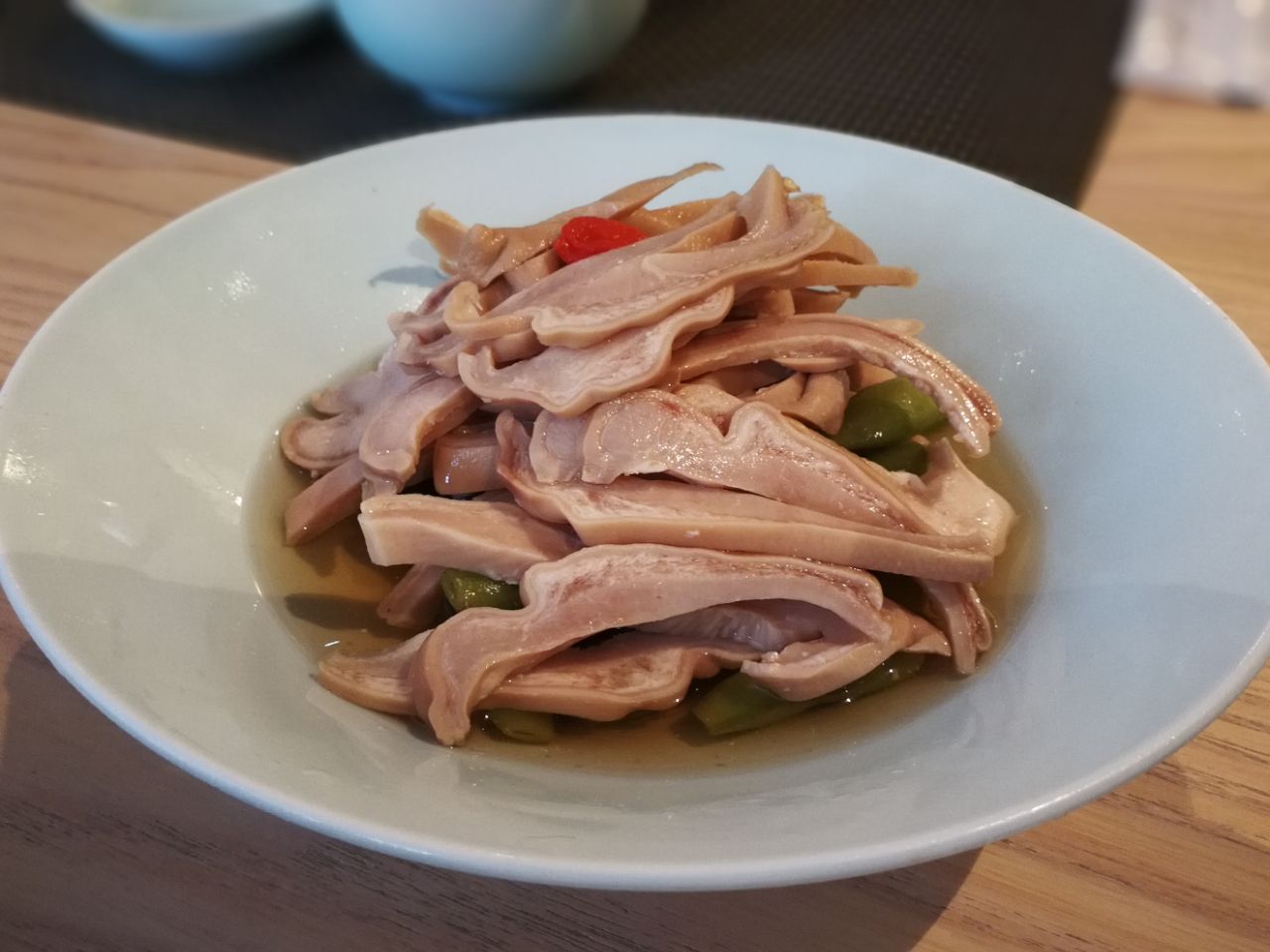 知味观旗下一家有格调有品味的店。 环境相当的雅致,青瓷餐具,竹木桌椅,中国风,又不乏时尚之感。 别样的阳光厨房,用竹编隔开,透过小孔可以看到面点师傅们的匠心。 餐厅提供G20峰会菜品,每日限量供应。 菜价较高,菜量较少,但装盘精致,味道可口。 糟肚尖糟的很入味,酒香味刚刚好。下面是毛豆。所以量还是少。 脆皮鸡是类似泰式的做法,不过不蘸酱吃也可以,本来就有点咸味。 惊艳的应该是龙井茶酥之类的点心,价格实在是高,一份2-3个。有机会下次再去尝试吧。 服务生长的都挺清秀,服务态度很好。