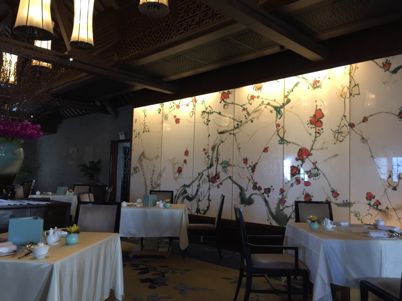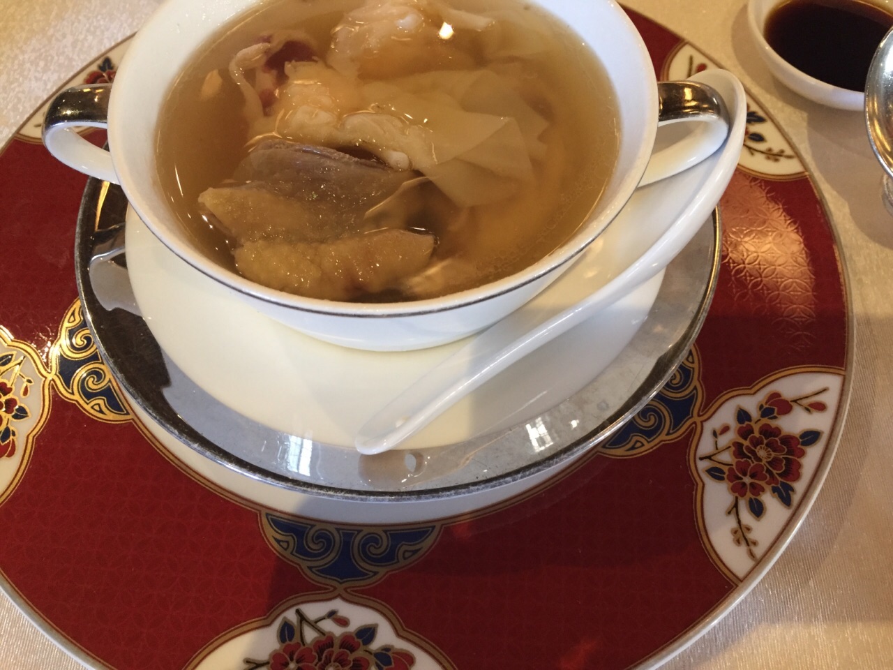 我喜欢上海外滩华尔道夫酒店五楼的中餐厅蔚景阁的用餐环境和那份怀旧情怀。华尔道夫的餐饮在上海也是名声在外的,百味园的西餐,蔚景阁的中餐和廊吧的法餐。我们就餐的蔚景阁环境古雅舒适,中式装修风格很大气,老虎格子窗、屏风、中式摆设等,让人回想起老上海时代。 推荐他家的脆皮烧肉,外皮酥脆,里面的肉也很嫩,很好吃。金腿云吞鸡汤我喜欢,汤头清澈诱人,薄皮的燕皮云吞里面内有爽脆的冬笋粒,鲜美的虾仁,一口下去,回味有金华火腿的独特香味。点心鳕鱼锅贴口味很好,鳕鱼经过调味没有腥味。 餐厅有商务宴请的氛围,服务生服务周到有礼貌,是一个适合商务宴请、朋友聚餐的好地方。
