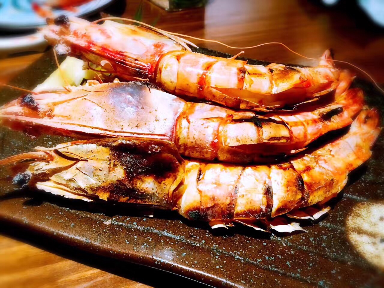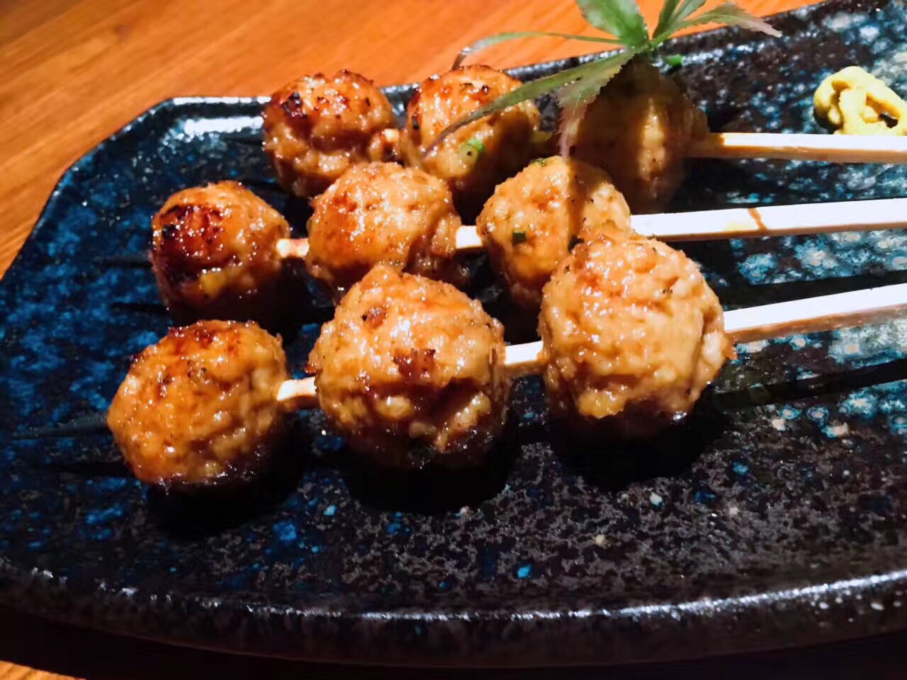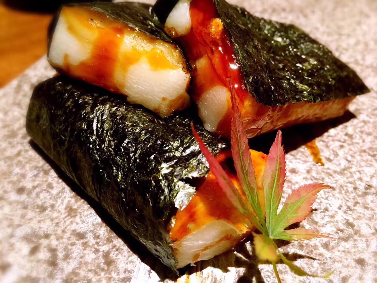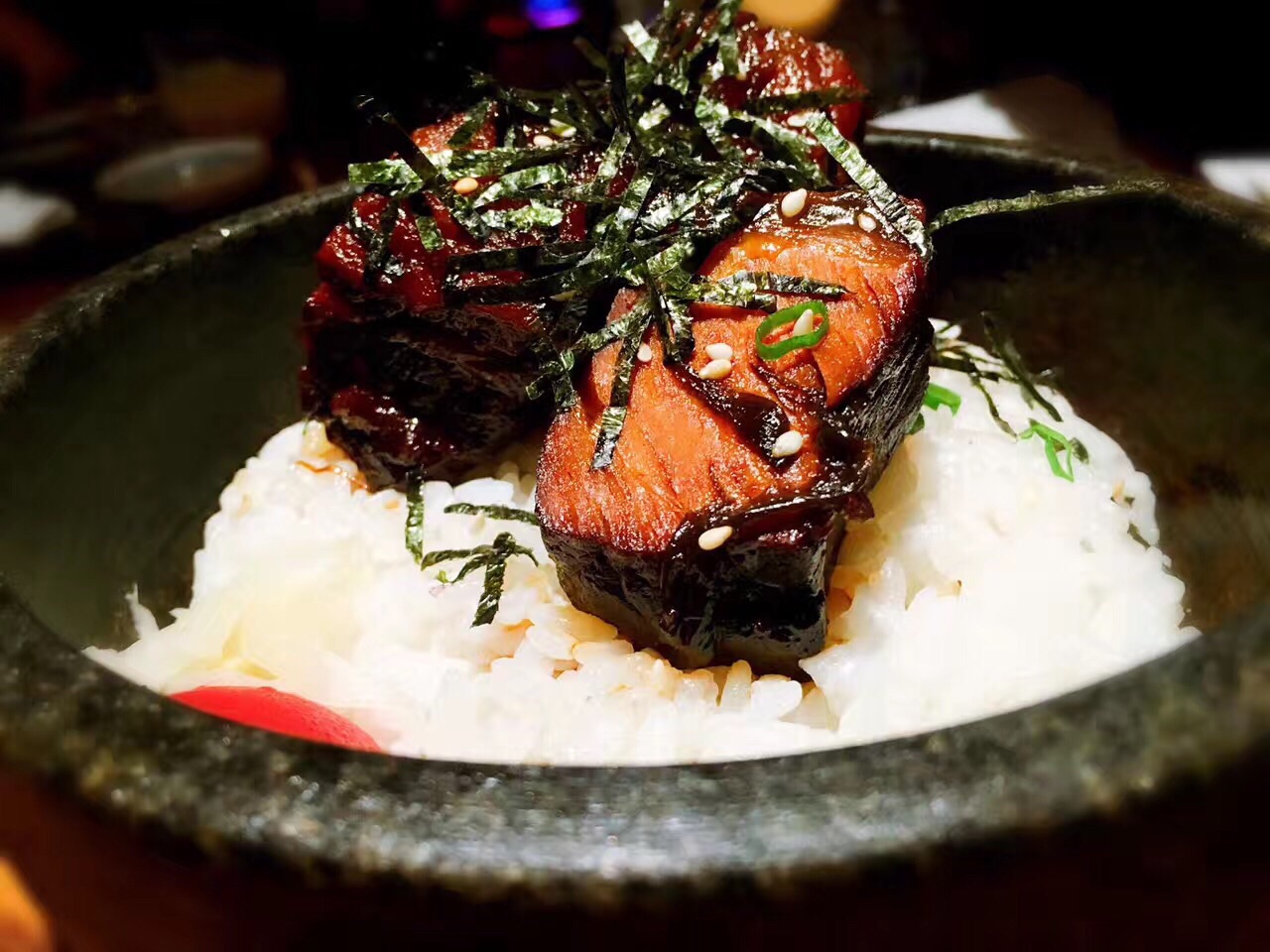 与日料店普遍的高冷调性不同。步入这家夜酌,伴随着服务生和炉端烧匠人们热情的齐声招呼,店内辐射出来的热量瞬间将我包裹。相比于看惯的各种川味烧烤,韩国烧烤,日式烧烤给予我另一种温馨而大气的感觉。 海钓金吉鱼:在炉端烧中,最有名的菜莫过于金吉鱼,这种炭火烤制最至贵的鱼,鱼的油脂含量十分均匀。烤的时候为了使鱼身受热均匀而被拗成了“S”型,以清酒和纯天然海盐调味。鱼头朝下,保证了外皮的干酥香脆,鱼肉的肥腴多汁。 炭烤大明虾:个头大过手掌的大明虾,表皮被烤至金黄微焦,以海盐调味。断开大虾身体和头部,很容易剥开虾壳,粉嫩饱满的虾肉瞬间展露,虾肉紧实爽脆,清甜的肉质还带有少许海边的气息,一个下肚后,满足感爆棚。 金牌石锅饭:看到顶上的三块红烧肉,减肥的妹纸大概已经吓跑了吧。然而错过这道菜绝对是遗憾。其实经过经过煮、烤、蒸煮三道工序,红烧肉的油脂早已顺着汤汁流出。酱香浓郁的红烧肉,拌开石锅中的白米饭,沥出的汤汁裹着米粒,忍不住让我把整碗米饭都吃了。 三文鱼蒸笼饭:竹香芬芳的蒸笼上桌,打开它,就像打开一道宝藏。暖光灯光下,这道色泽明丽的蒸笼饭格外撩动我的味蕾。顶上覆着满满蛋皮丝和熟三文鱼肉,加以点点紫菜和葱花小缀,飘入鼻孔的香气已令我们食指大动。 和牛串:选用肋骨上最柔嫩的和牛肉,精心腌制后搭配各色蔬菜一起串上,烤至八成熟,mix的滋味十分丰富,入口微化,肉质鲜嫩,有一些醇香的脂肪的满足感,却没有肥肉油腻的感觉,肉质柔韧又不失软嫩,口感极佳。 烤鸡肉丸:蜜烤多汁的鸡肉丸,现烤出炉,高温有效锁住肉汁,让口感紧实,肉质喷香。个头很大,一串三个,肉质鲜嫩,淋上表面咸甜可口的日式照烧汁,除了鸡肉本身的鲜甜之外,更有一种独特的醇香,美味升级相得益彰。 日本年糕:纯手工打制的年糕,经过精选的糯米原料,经过高温烤制后香味十足。淋上美味地道的照烧酱汁,包裹着酥脆的紫菜,一口咬下去黏而不粘、糯软香甜。 烤芦笋:很本来芦笋就是特别健康的食物,还有”蔬菜之王“的外号。烤的火候刚好,嫩滑又清脆,既可以吃到芦笋最原本的鲜味又不会失了烧烤的特色,木鱼花一洒,连西洋食材也颇具和风。