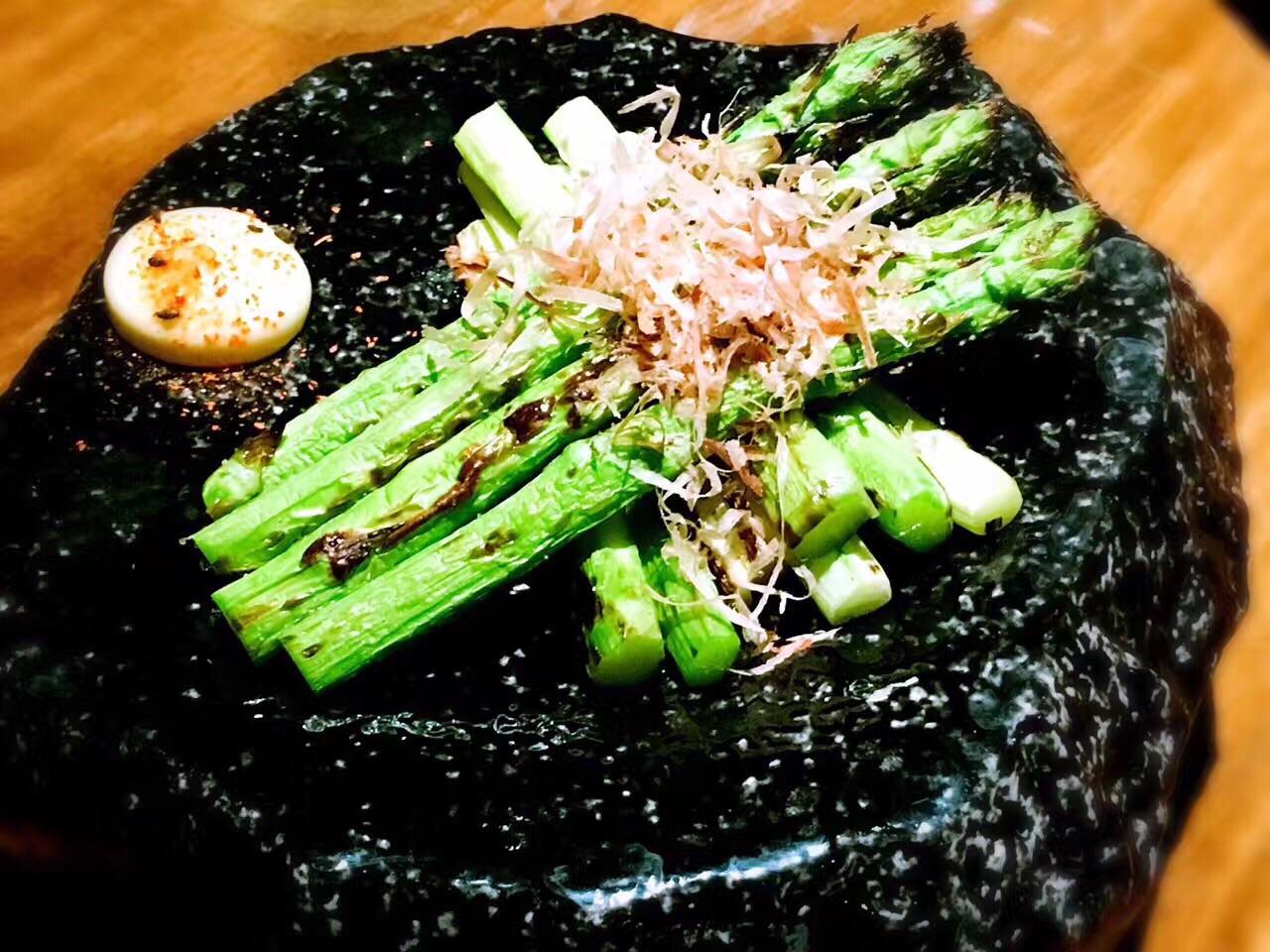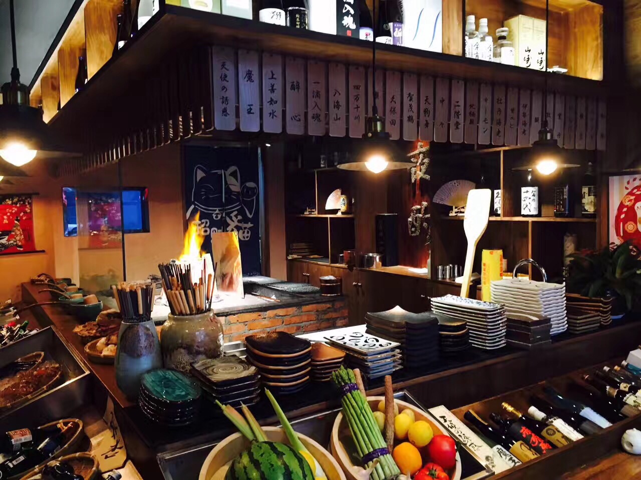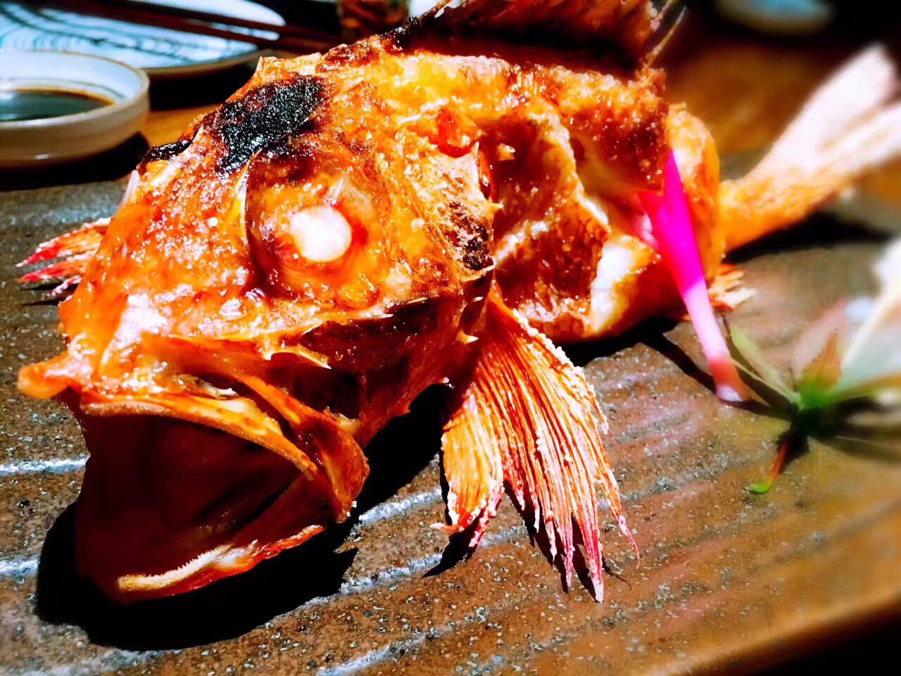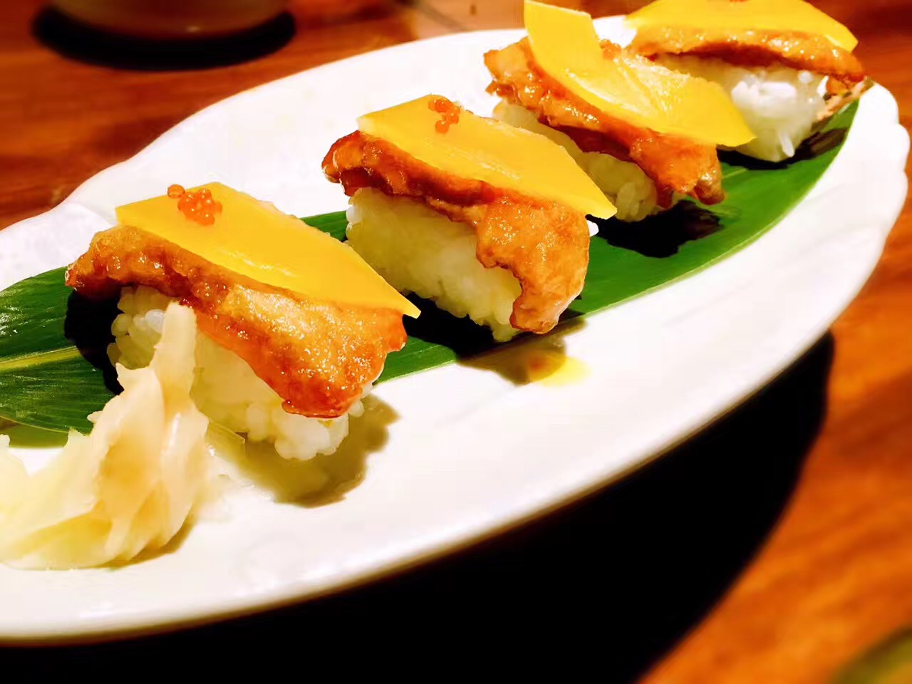 与日料店普遍的高冷调性不同。步入这家夜酌,伴随着服务生和炉端烧匠人们热情的齐声招呼,店内辐射出来的热量瞬间将我包裹。相比于看惯的各种川味烧烤,韩国烧烤,日式烧烤给予我另一种温馨而大气的感觉。 海钓金吉鱼:在炉端烧中,最有名的菜莫过于金吉鱼,这种炭火烤制最至贵的鱼,鱼的油脂含量十分均匀。烤的时候为了使鱼身受热均匀而被拗成了“S”型,以清酒和纯天然海盐调味。鱼头朝下,保证了外皮的干酥香脆,鱼肉的肥腴多汁。 炭烤大明虾:个头大过手掌的大明虾,表皮被烤至金黄微焦,以海盐调味。断开大虾身体和头部,很容易剥开虾壳,粉嫩饱满的虾肉瞬间展露,虾肉紧实爽脆,清甜的肉质还带有少许海边的气息,一个下肚后,满足感爆棚。 金牌石锅饭:看到顶上的三块红烧肉,减肥的妹纸大概已经吓跑了吧。然而错过这道菜绝对是遗憾。其实经过经过煮、烤、蒸煮三道工序,红烧肉的油脂早已顺着汤汁流出。酱香浓郁的红烧肉,拌开石锅中的白米饭,沥出的汤汁裹着米粒,忍不住让我把整碗米饭都吃了。 三文鱼蒸笼饭:竹香芬芳的蒸笼上桌,打开它,就像打开一道宝藏。暖光灯光下,这道色泽明丽的蒸笼饭格外撩动我的味蕾。顶上覆着满满蛋皮丝和熟三文鱼肉,加以点点紫菜和葱花小缀,飘入鼻孔的香气已令我们食指大动。 和牛串:选用肋骨上最柔嫩的和牛肉,精心腌制后搭配各色蔬菜一起串上,烤至八成熟,mix的滋味十分丰富,入口微化,肉质鲜嫩,有一些醇香的脂肪的满足感,却没有肥肉油腻的感觉,肉质柔韧又不失软嫩,口感极佳。 烤鸡肉丸:蜜烤多汁的鸡肉丸,现烤出炉,高温有效锁住肉汁,让口感紧实,肉质喷香。个头很大,一串三个,肉质鲜嫩,淋上表面咸甜可口的日式照烧汁,除了鸡肉本身的鲜甜之外,更有一种独特的醇香,美味升级相得益彰。 日本年糕:纯手工打制的年糕,经过精选的糯米原料,经过高温烤制后香味十足。淋上美味地道的照烧酱汁,包裹着酥脆的紫菜,一口咬下去黏而不粘、糯软香甜。 烤芦笋:很本来芦笋就是特别健康的食物,还有”蔬菜之王“的外号。烤的火候刚好,嫩滑又清脆,既可以吃到芦笋最原本的鲜味又不会失了烧烤的特色,木鱼花一洒,连西洋食材也颇具和风。