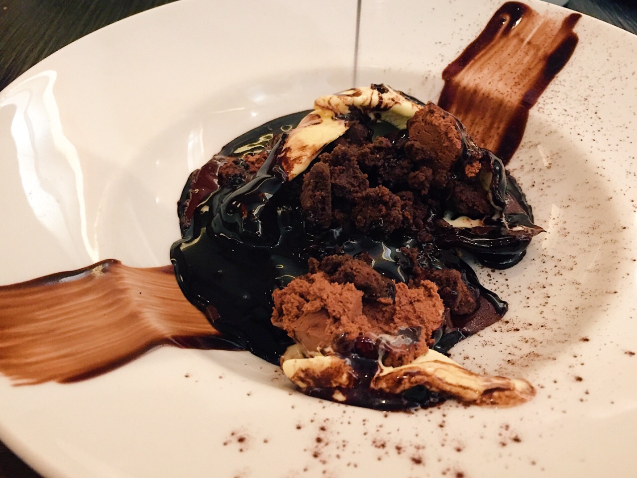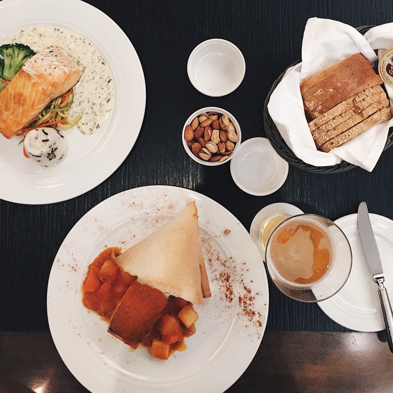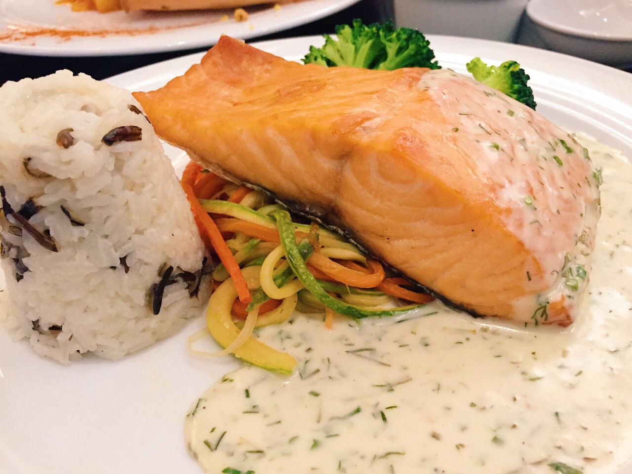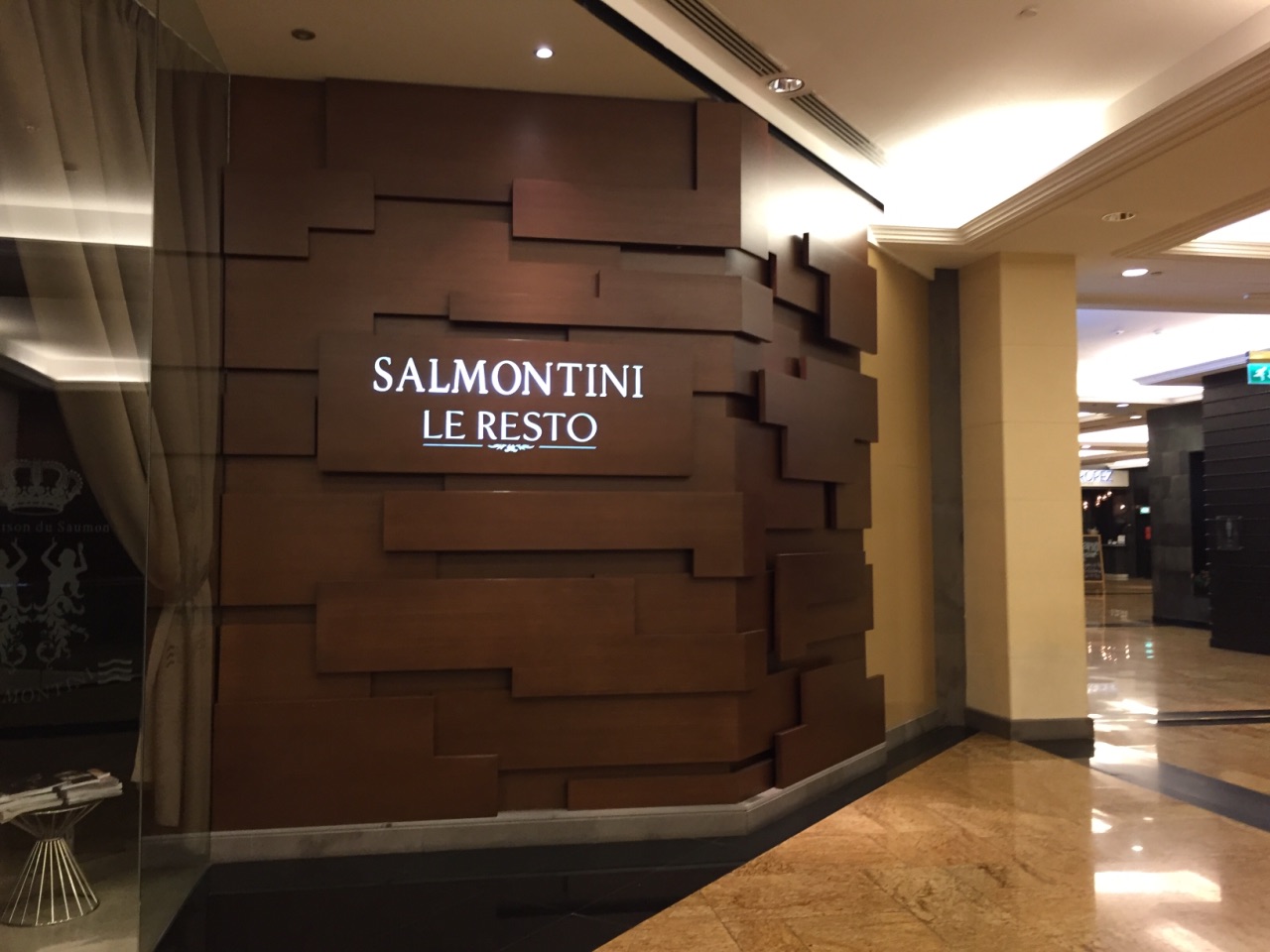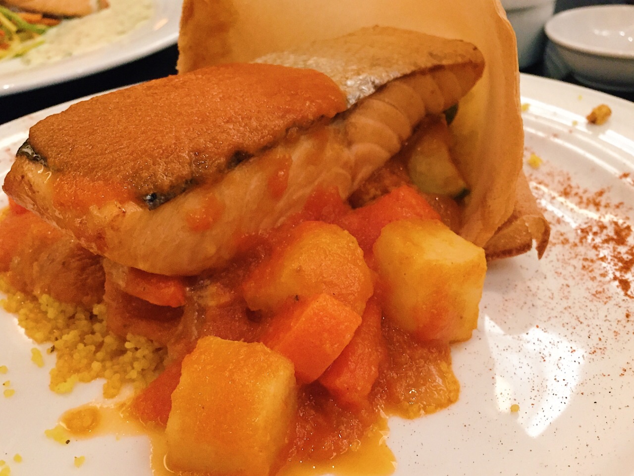 主打三文鱼料理,三文鱼的处理中上水平。微辣的哈里萨辣酱配上三文鱼和古斯米有印度菜的风味,香草汁三文鱼配野米比较一般。巧克力圆顶在淋上热巧克力时瞬间融化,视觉享受大于味觉享受。餐厅正对着室内滑雪场,用餐时能欣赏雪地景色。
