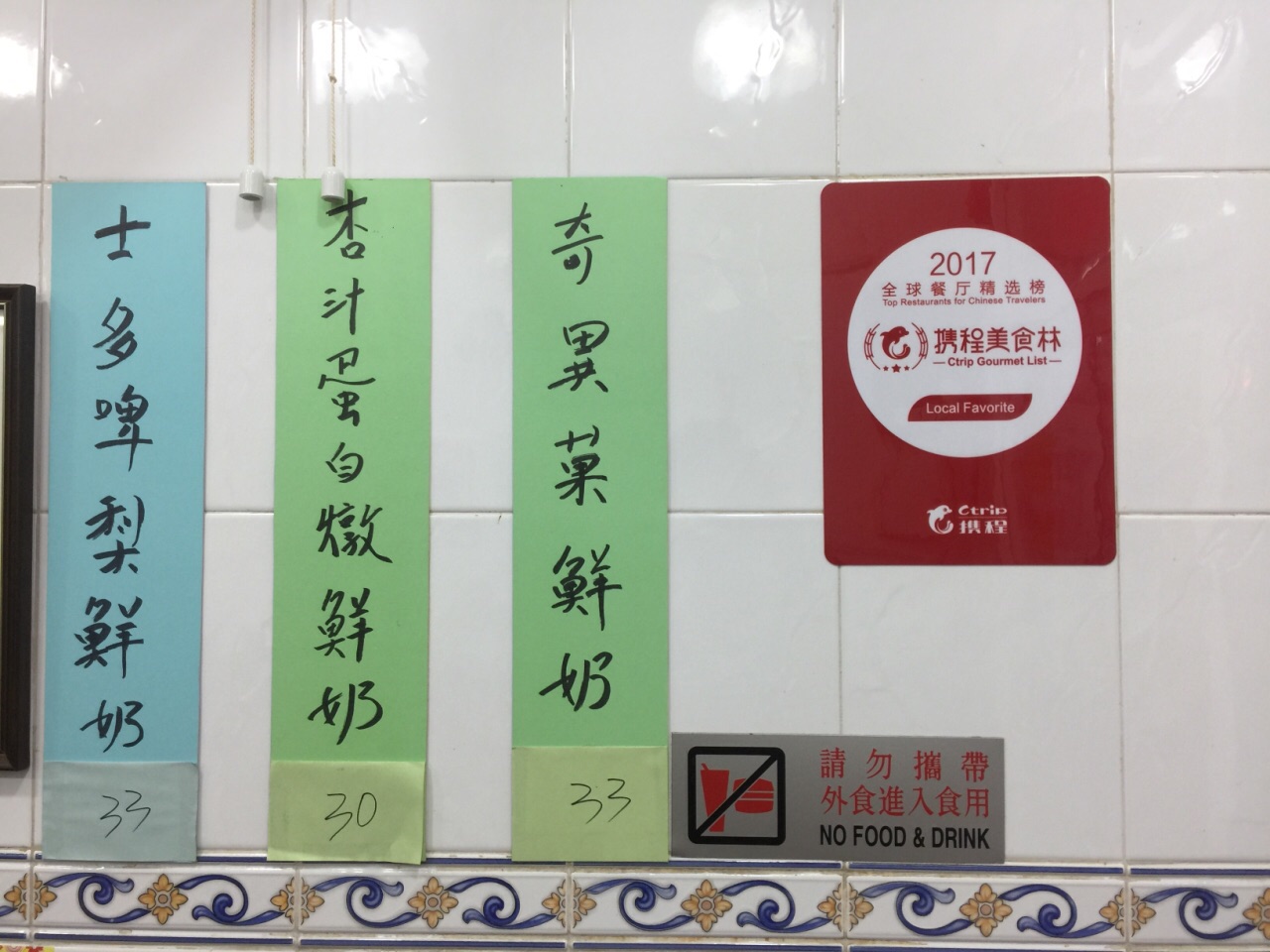 在福隆新街里的一家小店,点了四碗糖水:驰名姜汁撞奶、凤城双皮奶、芝麻糊、杨枝甘露。份量很小,价钱比香港贵一半,而且出品非常一般,不值得专门去品尝。姜汁撞奶虽然姜味浓郁,但是稀得像水一样,完全没有撞奶的感觉;双皮奶不滑嫩,但是味道还行;芝麻糊则是特甜,而且一点也不浓稠,比粤港澳地区路边小摊卖的还差,吃了一口就完全没欲望吃下去,结账时,老板娘特意问我芝麻糊出什么事情了,这点做得挺不错;杨枝甘露的柚子并没有挑选好的品种,吃下去之后非常苦涩,不推荐。
