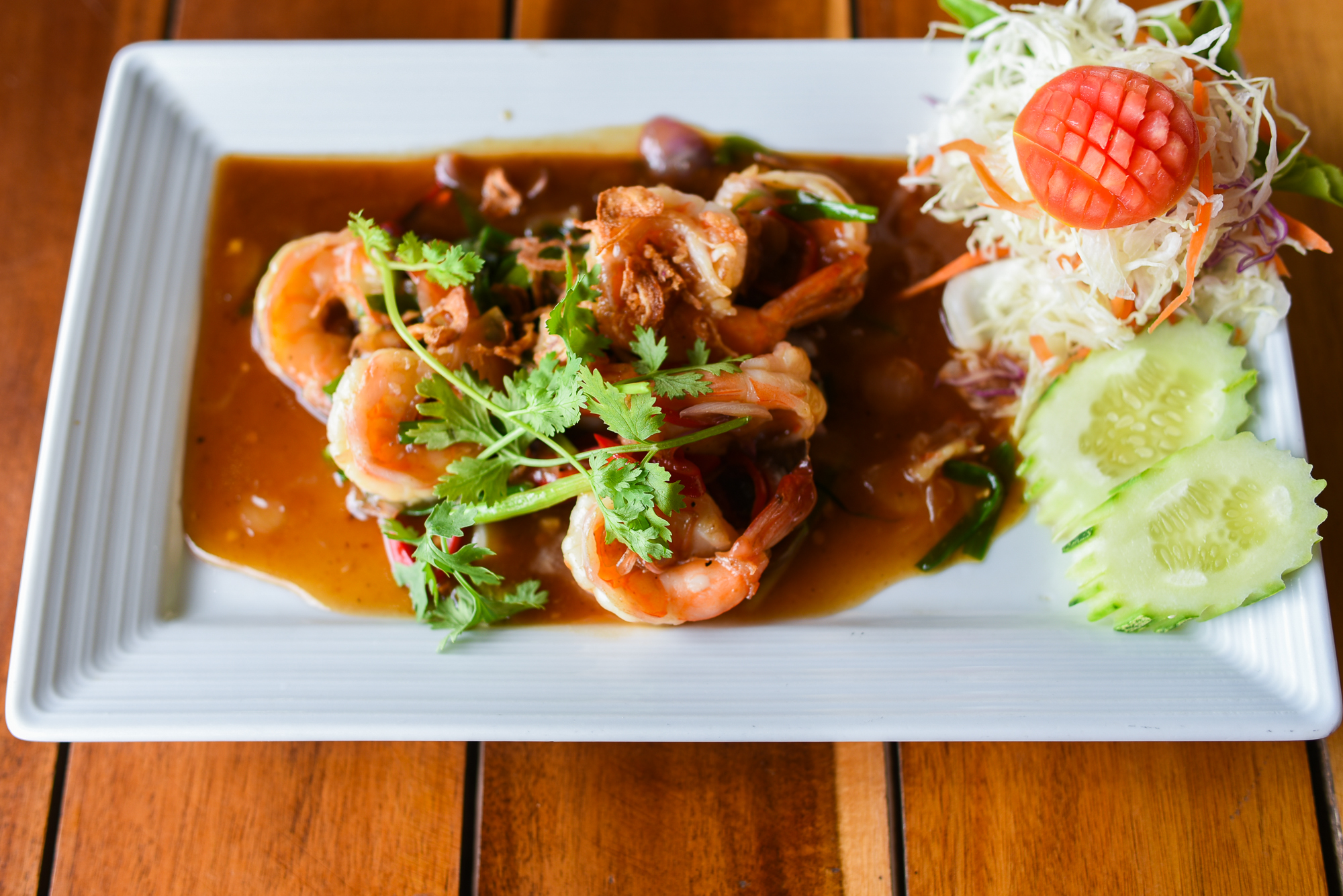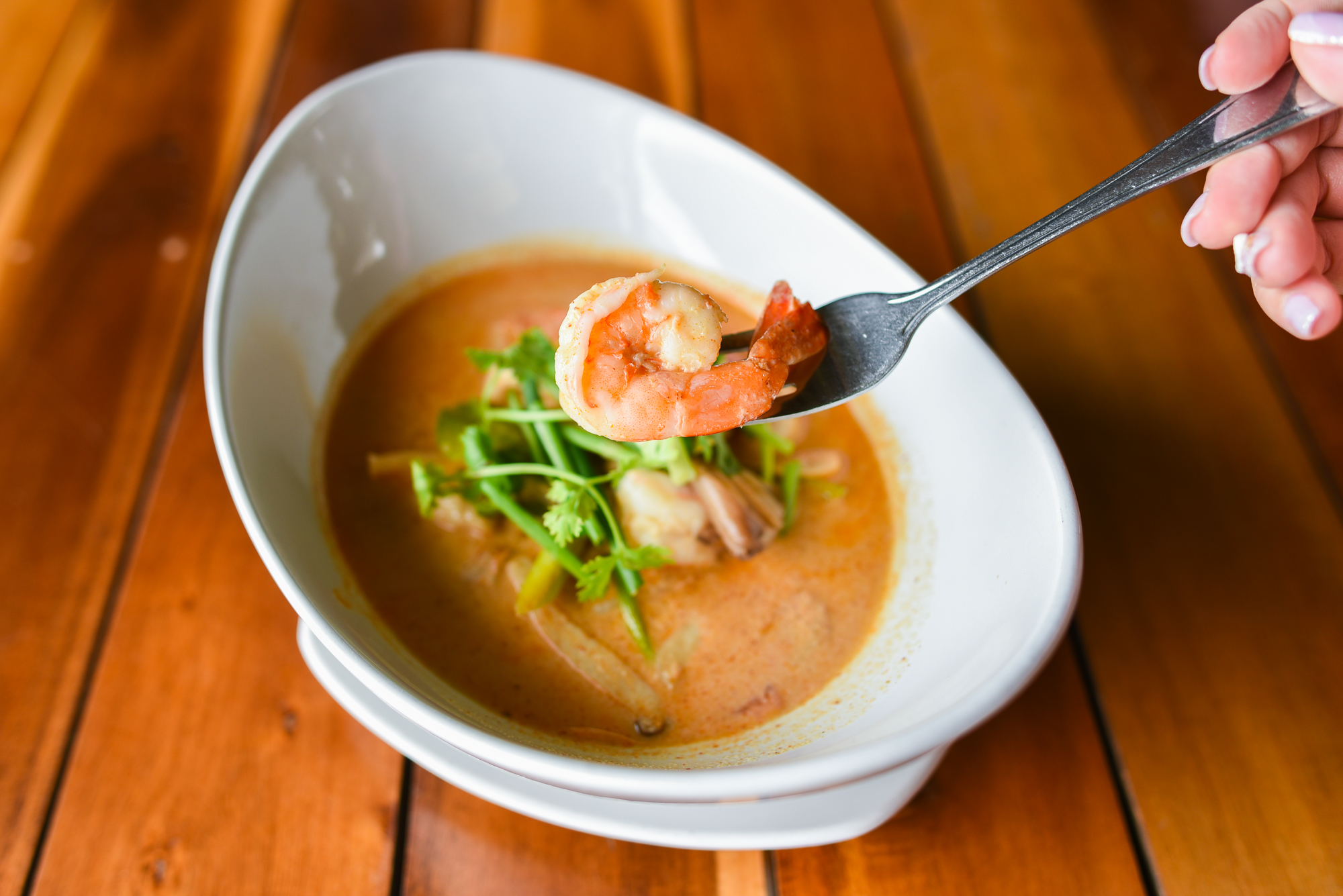 泰式罗望子酱炒大虾,非常local的一道菜,酸酸甜甜的罗望子酱搭配新鲜的大虾,爽口弹牙,配上冰冻的chang啤酒,超赞! 椰奶鸡肉汤,来甲米后逢餐必点,可惜啊,这家做得一般,就连当地人尝过也说不怎么样。 冬荫功,一直以来,这道菜都是极爱的,尤其是来泰国,逢餐必点,可这次到了甲米地区,感觉有点失望,也许是做法不一样吧,尤其是这家,咸酸辣都是极端的口感,真的是难以入口。 香蕉乳酪,甜度和浓度调配得刚刚好,这家餐厅饮品做得非常好,菜式一般,只推荐罗望子酱炒大虾和饮品。 餐厅全年营业,这个服务态度忍不住赞一个,这两天在兰塔岛上吃闭门羹都变得矫情了,难得碰得一个不任性的店家,都快要感动哭了。