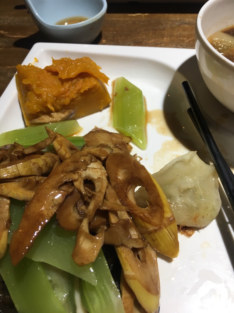 满意拔草!五月来时种草的素食,自己差点忘了还是红扑扑提的。隐藏在大楼的地下一层,才17块的自助感觉不属于这个时代的存在。店员笑脸相迎,布置各种书法和佛文化相关。可以多次取但是千万不要浪费。 最好吃是萝卜丝糕,糖醋土豆块,萝卜豆腐汤,炒笋,总之是各种土豆萝卜豆腐变出花样。青瓜汁,好像是西瓜皮榨汁?超级好喝。 自从在厦门吃了素食自助,就爱上了这种,素肉料理……其实健康也未必,为了好吃有荤菜味道,就免不了高油多盐。不过好吃又可以安慰自己吃的是素还是开心。 没有抱着一颗虔诚的心很是抱歉,只抱着一颗虔诚的胃哈哈。