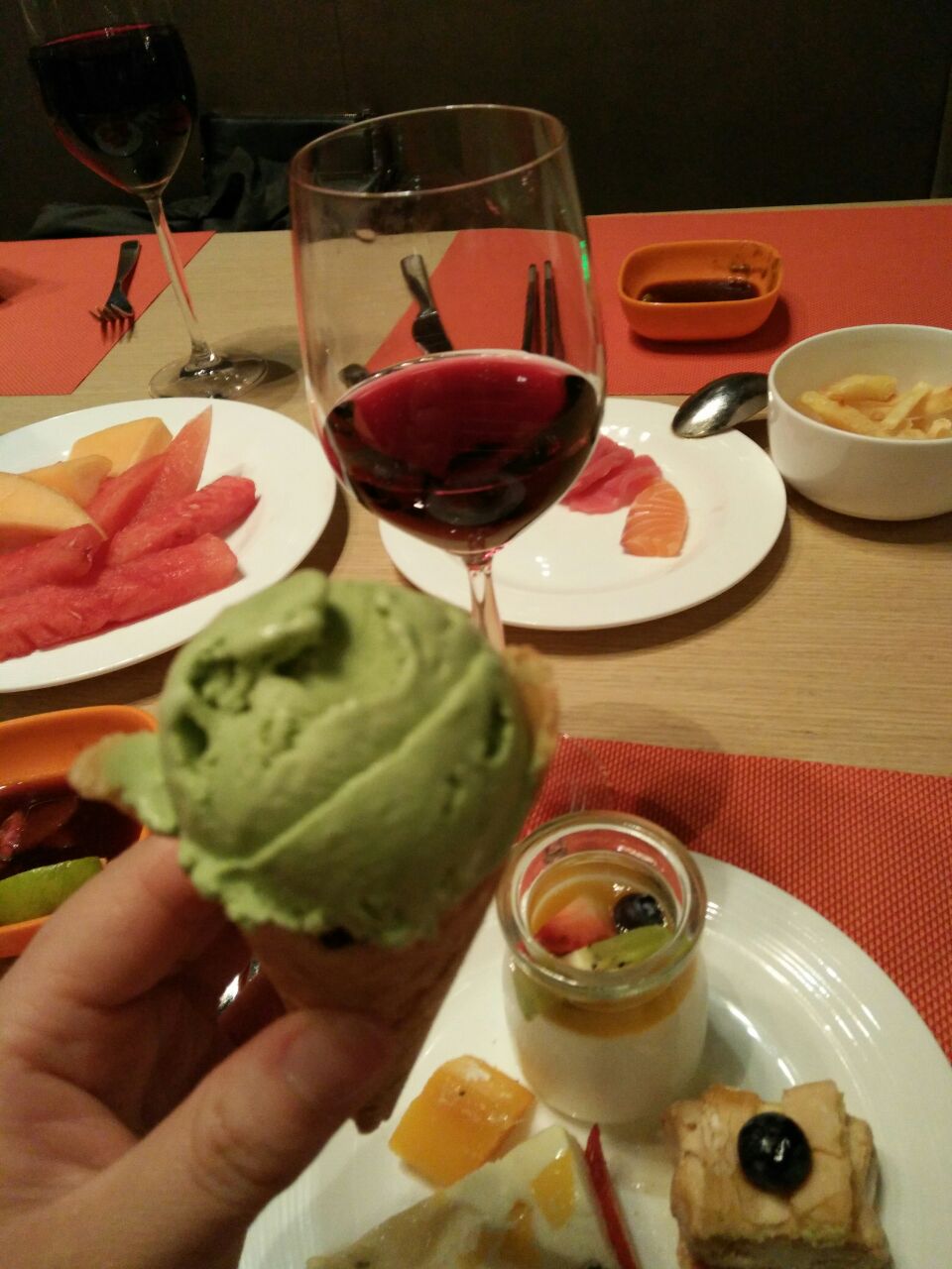圣和府邸酒店负一楼,大门在总统府旁东箭道那条巷子,餐厅旁有个书吧,餐厅环境很好,人不多,还有个好大片区辟出来作儿童区,整体环境真的是称得上高大上。跟环境相比,服务质量只能算作一般吧,因为用餐人数较少,有些餐区服务员都不到位,找不到人。饮料没有鲜榨,只有罐装。总体菜品数量不多,唯一的好处是三文鱼无限量供应,不像有些地方会限量拿,比较麻烦。用餐最后会送一只小龙虾,但是口味做的并不是很好吃,海鲜也并不是很好吃。总体价格不菲,硬件还可以,菜品口味和服务都有待进一步提高。