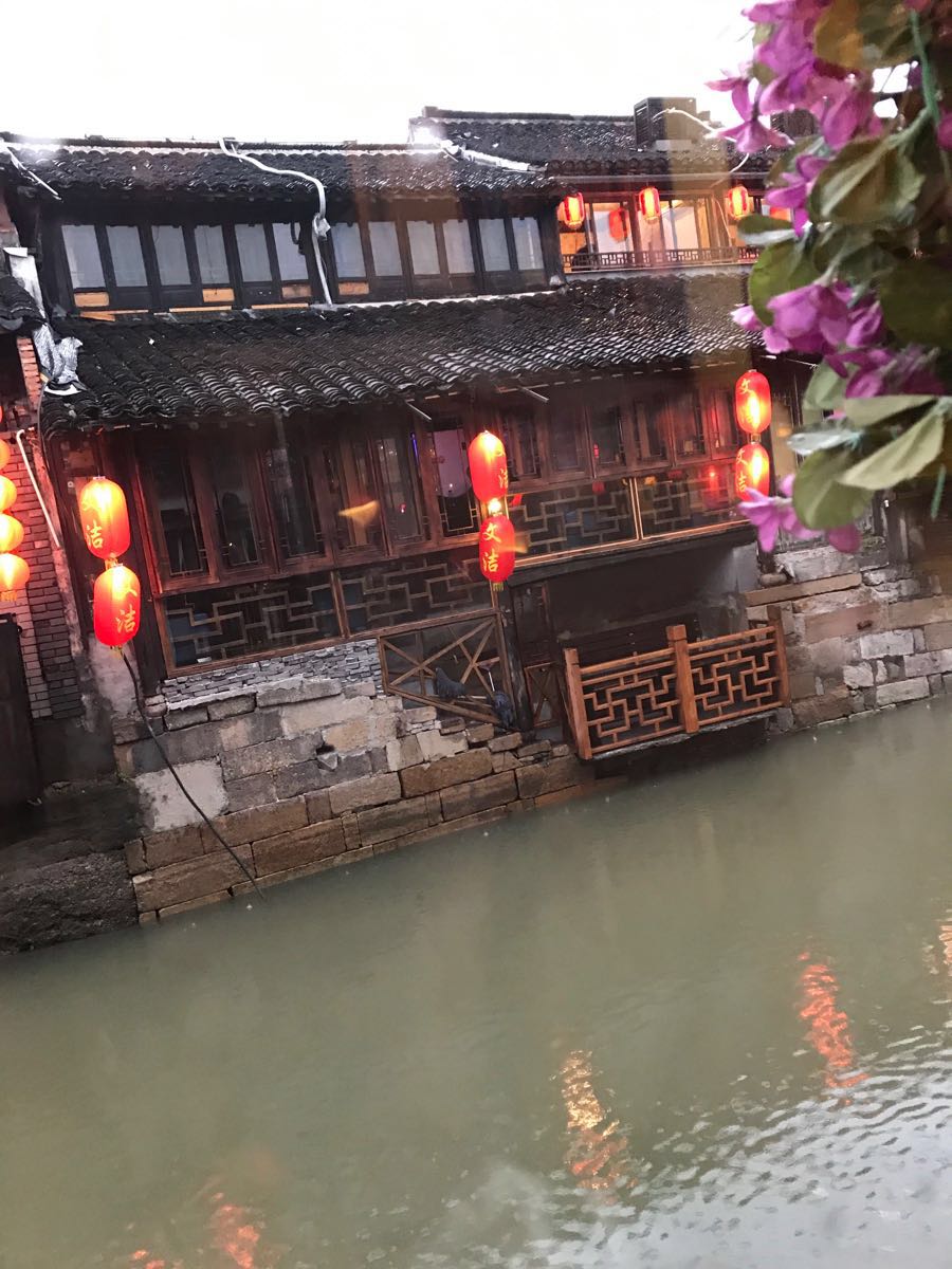 我们选择的是,梦里水乡农家菜靠窗户的位置,吃着独具特色的江浙菜,配点小酒,淅淅沥沥的雨点落在河面,临近傍晚,对面就是一个大酒吧,一静一动的环境,一条河,一扇窗就隔绝了对岸的喧闹,感觉仿佛是自己与世无争,独善其身,饭中偶尔划过的小木船,木船上辛勤守护这条小河的保洁人员,兢兢业业,你可能会享受那顿饭的宁静与舒心,,思考你过去的经历,现在的境遇,以及未来的方向,吃饭拍照绝好的不二之选,这座桥的位置连接了两条街,吃饭跟夜生活