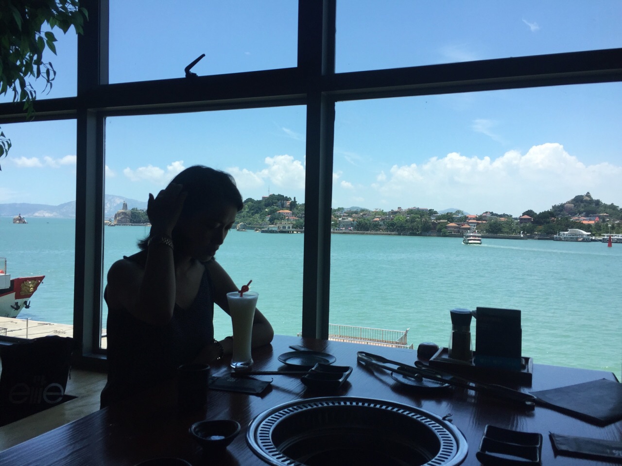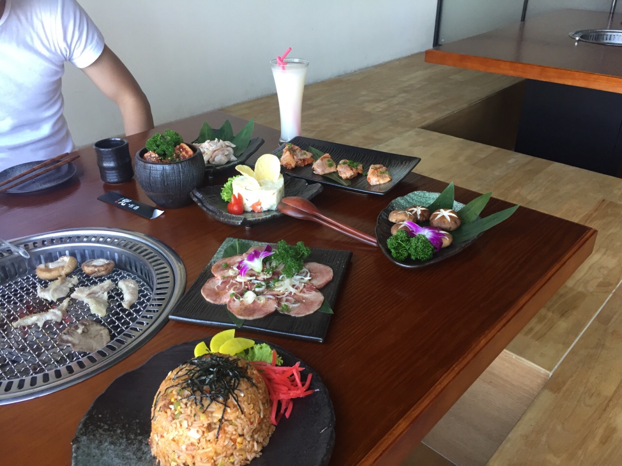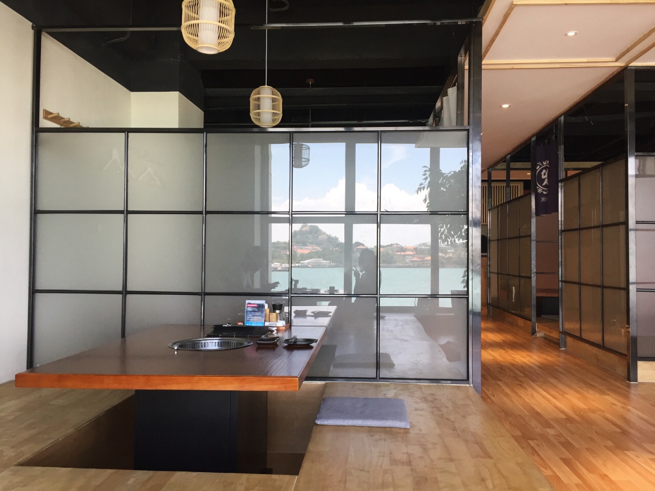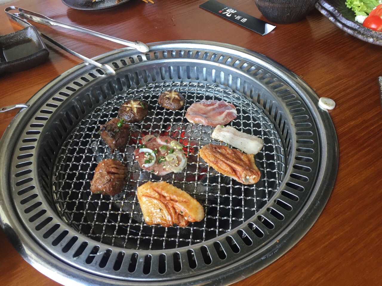 环境真的没话说,无敌海景啊~ 位置在和平码头3楼。 进门要换拖鞋,然后服务员带你到预约的位置去,可能是最早来的,安排了一个最棒的位置哈哈 烤肉的途中还会换铁网,炭火烤的很不错。 点了牛舌,松花五花肉,还有个什么牛肉忘了,土豆泥,鸡翅,香菇,泡菜叉烧饭,2个人吃还是有点撑,最后主食和沙拉都没吃完,饭很大一份也,两个人吃非常够,点一份饭,多点些肉就好。土豆泥是爱心的还插了两个薯片和兔子西红柿!好可爱,给个特写!人均大概200-300吧,看你怎么点。