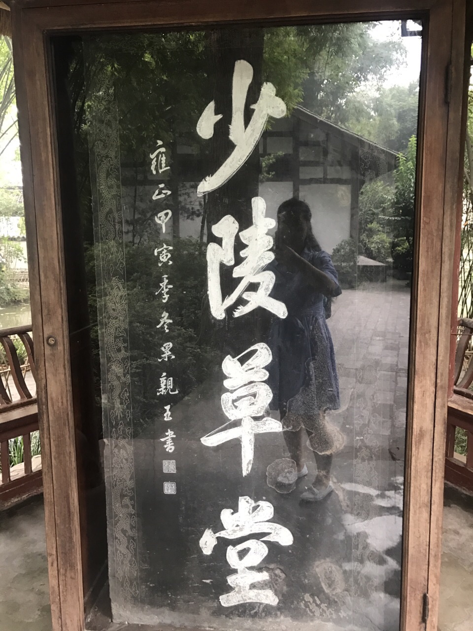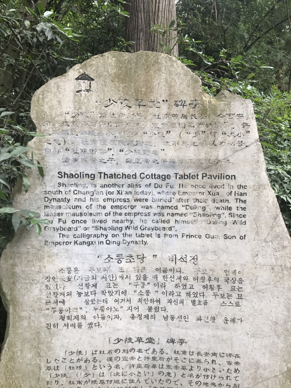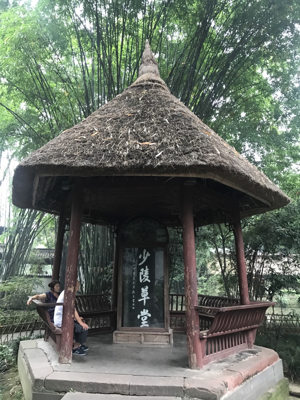 游游问有何亮点?亮点就是这是果亲王写的啊~草庐一座,很符合少陵野老的范儿!石碑黑色,白色行书,大字浓墨,流畅有力。四周刻有龙纹祥云,很有气势。亭子后面一丛修竹,挺拔参天,我去游览时阵雨绵绵,青苔路湿,空气中弥漫土壤和湿茅草气息,相当有意境。大爷大妈们,游客朋友们,不要错过任何一个草堂里的门匾和对联碑文…都是名家大咖啊!