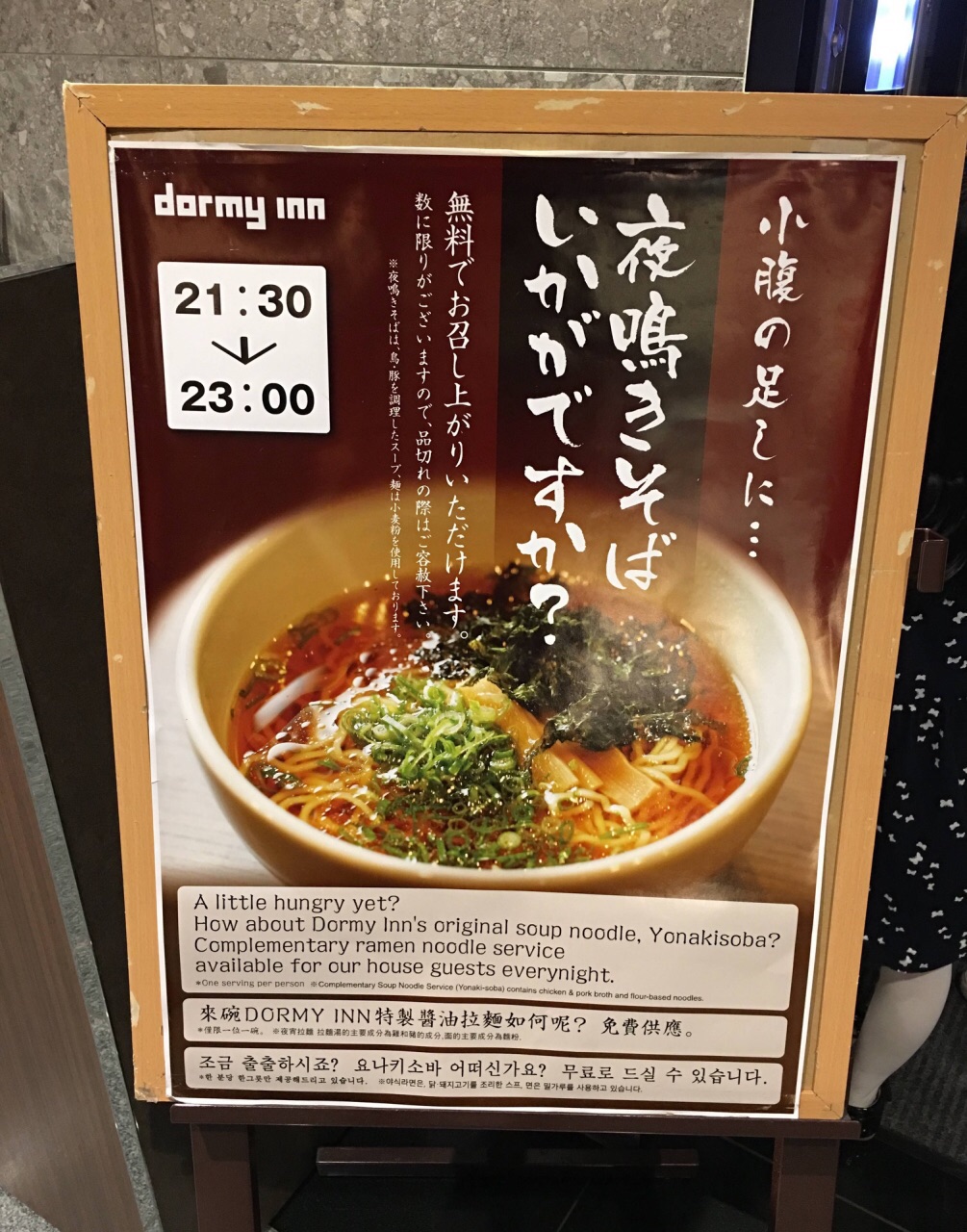 网友2017-06-26DORMY INN 你真是太太太贴心了!晚上泡完温泉肚子饿了吧?来碗酒店特制的酱油拉面如何呢water or tea or coffee ?任君选择!晚上泡完温泉肚子饿了吧?来碗酒店特制的酱油拉面如何呢?也是免费的哦!DORMY INN 你真是太太太贴心了!