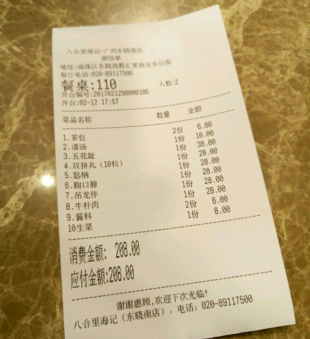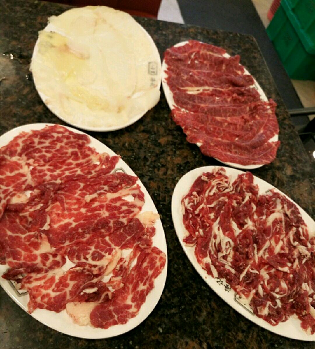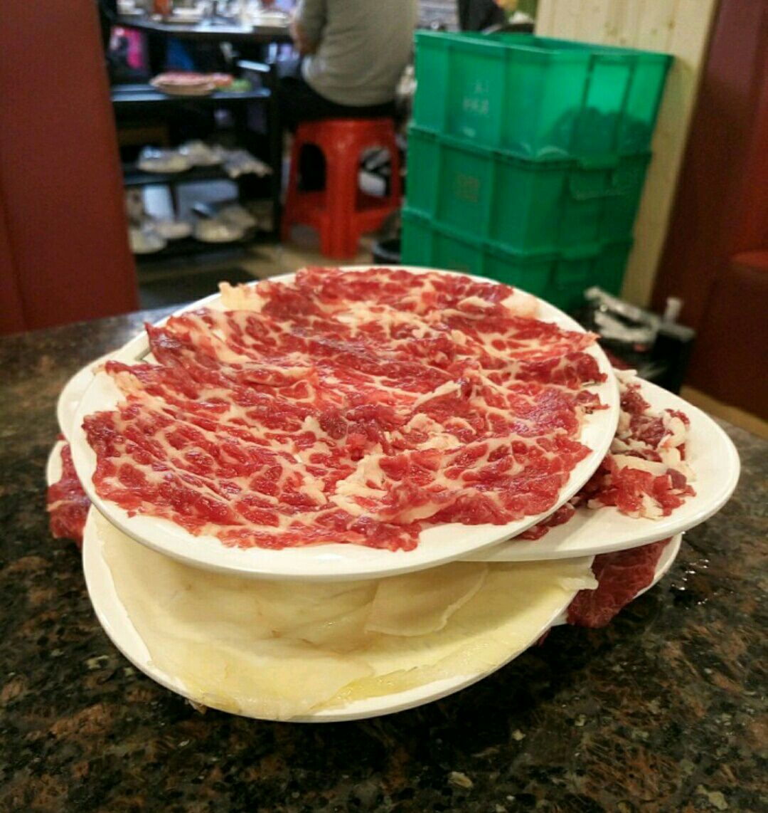五点多在对面新都会看完电影,四点多的时候取了号,排第十,看完电影直接过去,提示前面还有四桌。但也在外面坐了半个多钟才能进去。这里点菜不是给你纸笔自己勾的,而是服务员落单,几环保。有个地方需要改进下,几碟肉一起上的时候,是把碟叠在碟上的,这样感觉不太卫生。我们这么早去吃,居然已经没得点牛舌了,有点失望。牛肉还算新鲜,不过碟头有d细,而且三花趾和五花趾比其他的牛肉火窝店贵,要38蚊一份,不过肉还算爽。其他部位的肉口感都唔错的。
