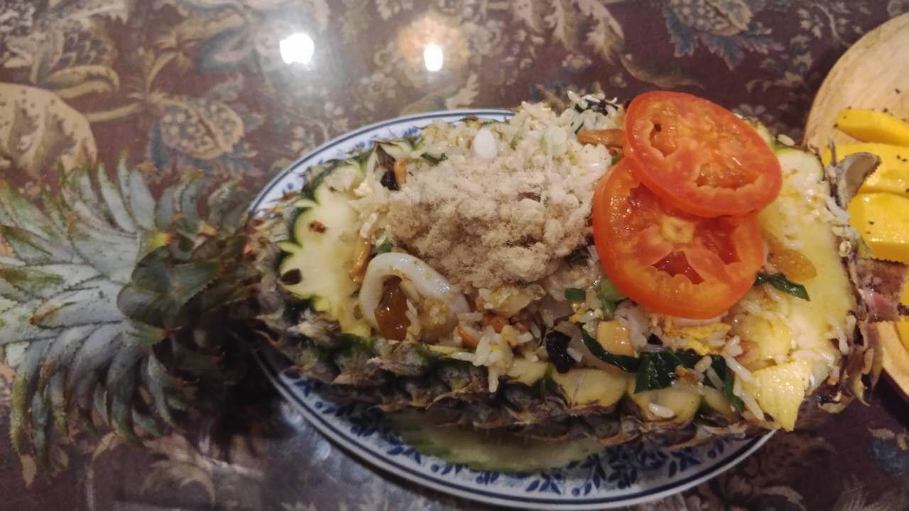 最后一晚在卡伦看日落,不高兴走很多路觅食,就选择酒门口的这家,点评推荐五星的。芒果糯米饭不错,120泰铢,价格可以,菠萝炒饭上面的番茄是坏掉的,服务员就说不要吃,我以为会来换,结果是我想多了,让我们番茄不要吃,其他继续吃。在国外我也忍了。一共四样花了730株。前一天在红洋葱吃,835株,吃了3个shake,还有很多其他东西,性价比还是红洋葱好。