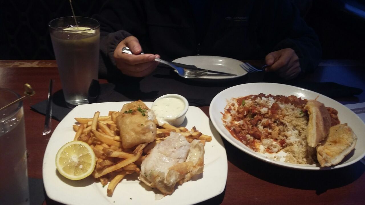 第一餐每人点了份不同的食物,美国特色食物餐及土豆鱼排,好吃,但没吃完打包了,第二天就只要一份餐食刚好口味超好,环境超好,服务超好,份量超足,我们俩人连续两个晚餐在这消费,第一餐每人点了份不同的食物,美国特色食物餐及土豆鱼排,好吃,但没吃完打包了,第二天就只要一份餐食刚好。