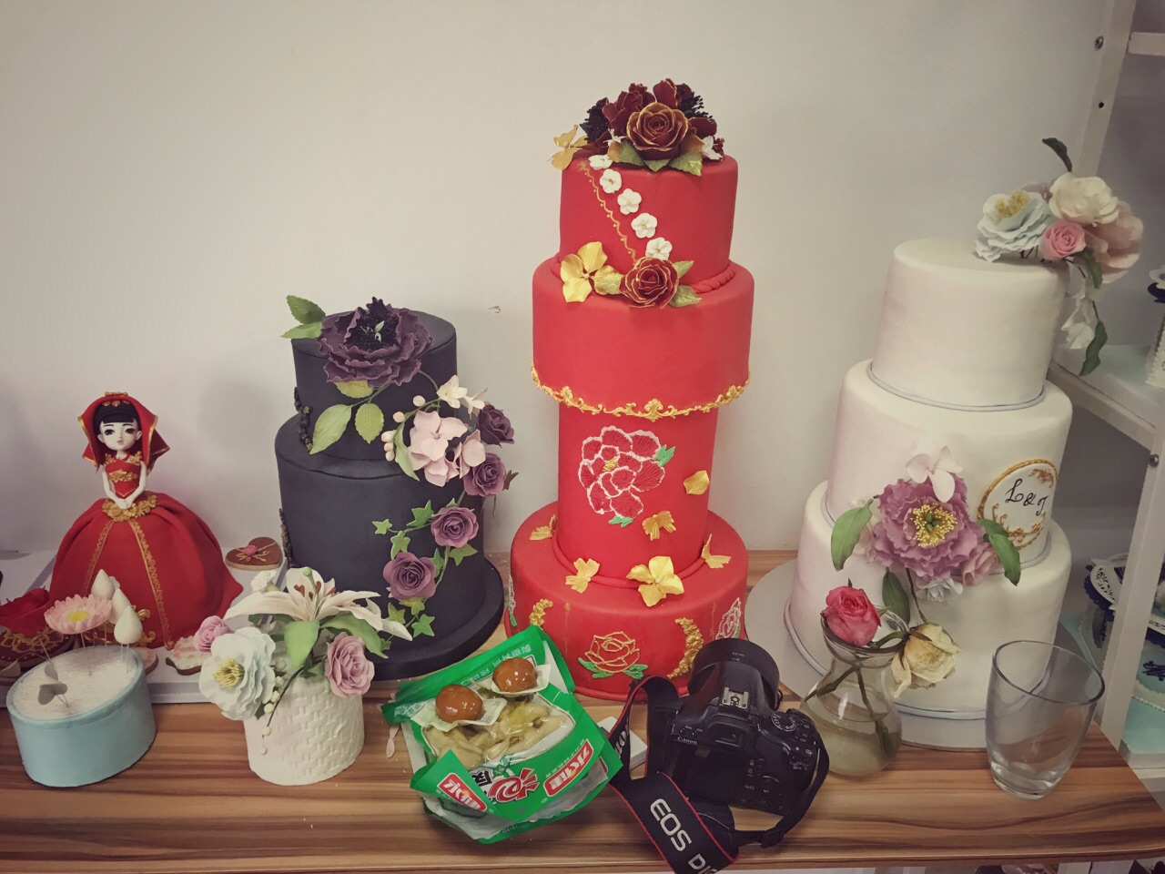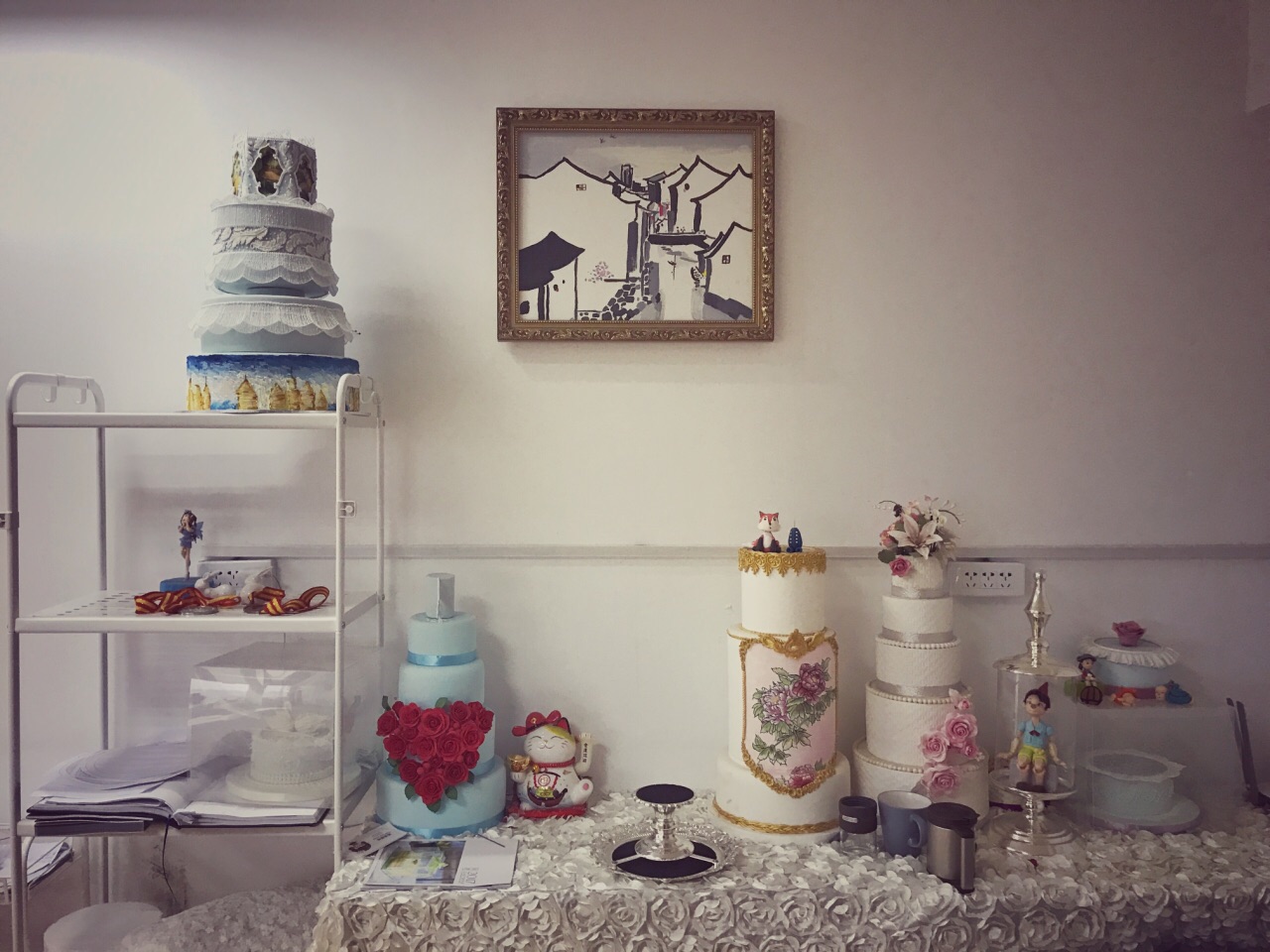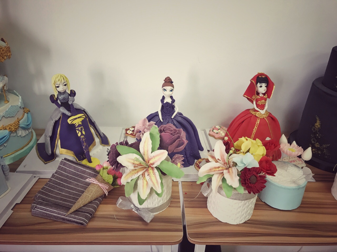 这家蛋糕店一进门便是大大的工作室,透明的玻璃里面的店员正在制作蛋糕。两旁还放着各种模型,颜值杠杠的。感觉翻糖蛋糕还是更适合送人,感觉味道还是比较一般,特别是翻糖皮,感觉不太吃得惯,有种怪怪的胶为,味道也偏甜一些。感觉把糖皮去掉会更好吃一些。中间就是比较普通的蛋糕胚,没有太多的特色,中间加着两三种水果。