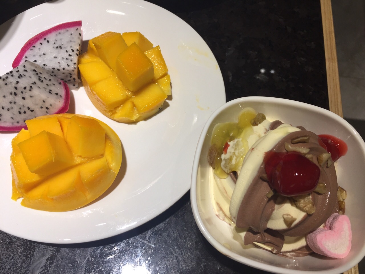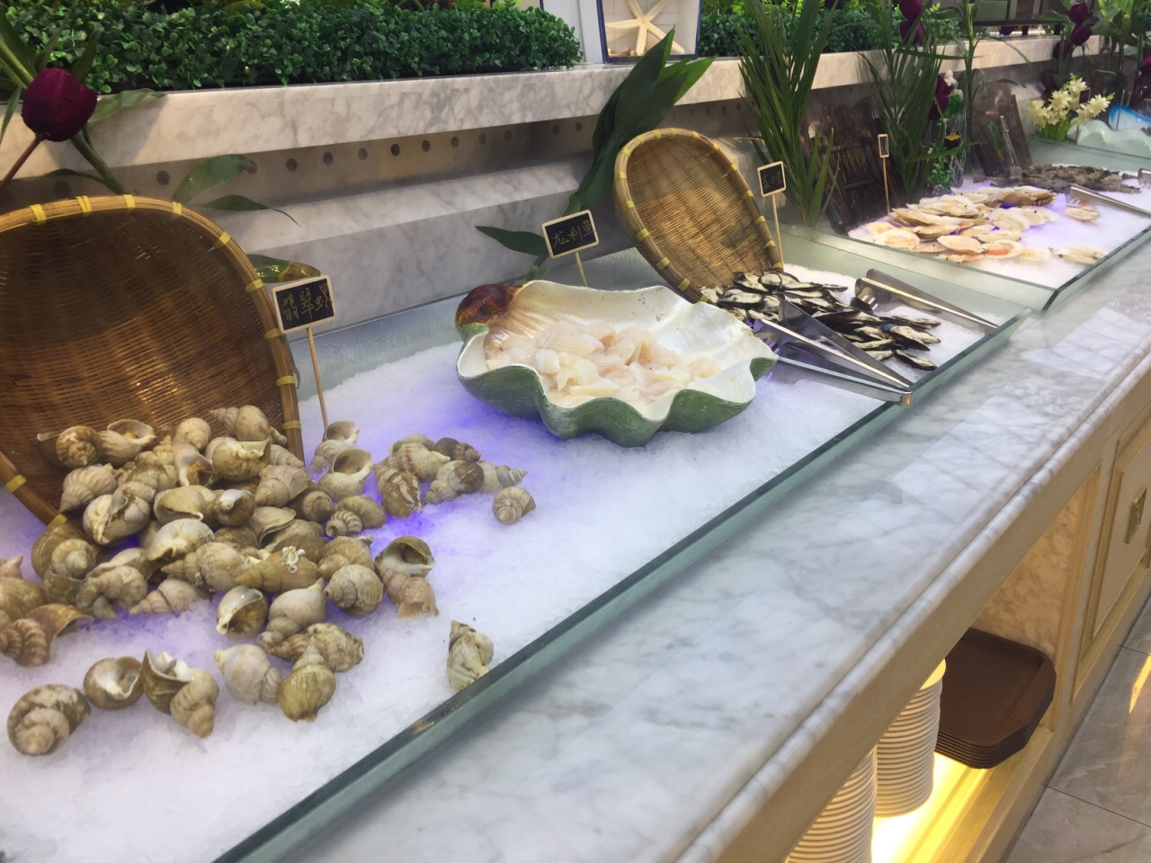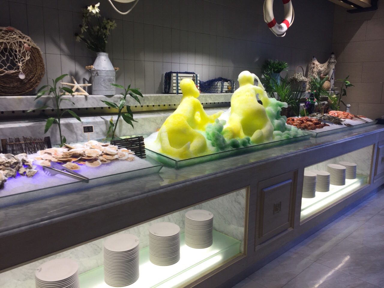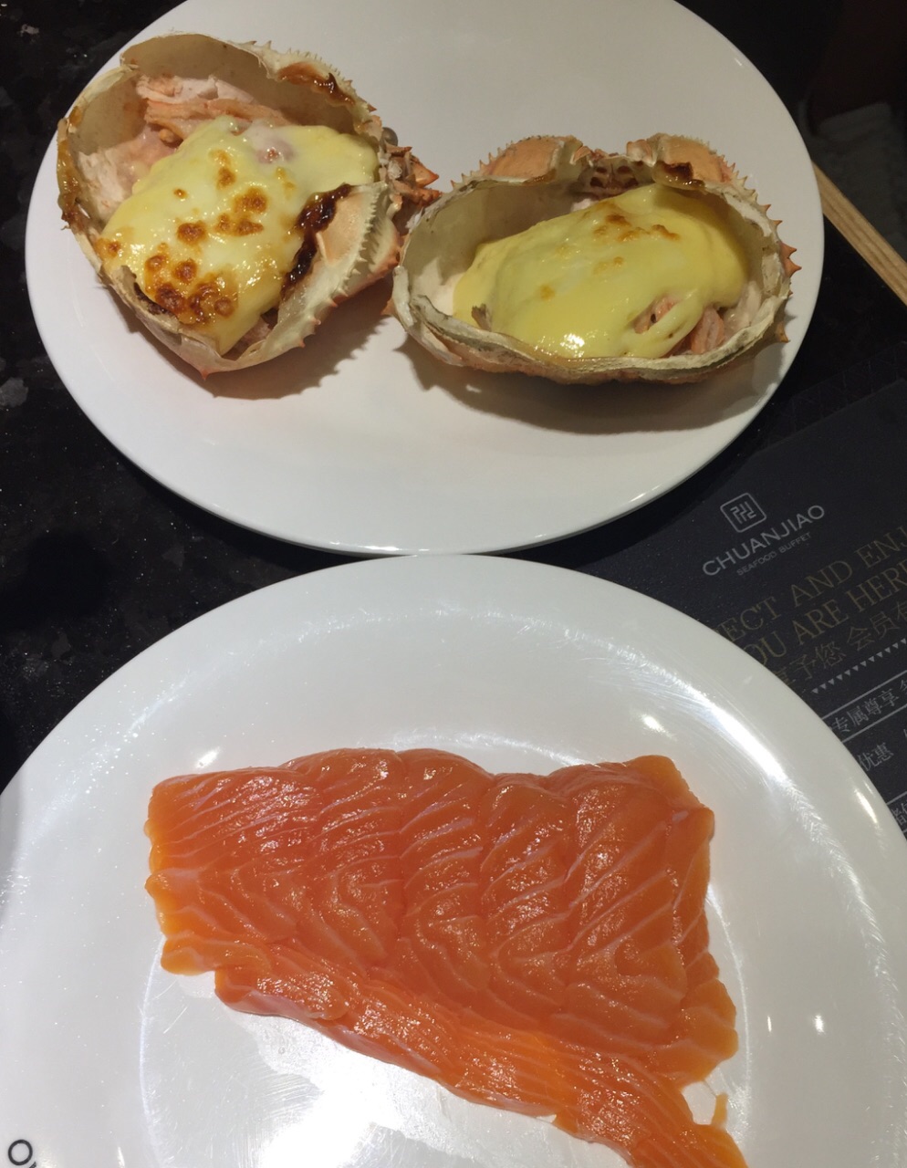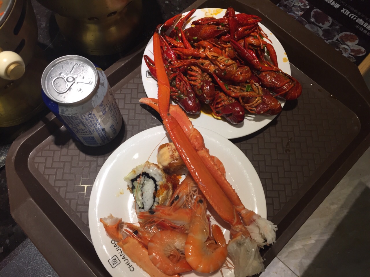 在招行的app上看到这家店参加周三五折的活动,139块钱一个人,果断跟小伙伴一起买了券,晚上过来吃饭。这家店很大,整个二楼都是他们家的。取菜区域分为两块,入口右转的这一片比较大,以各种海鲜,甜品,烧烤,涮菜,点心为主。而另一侧的取菜区域相对比较小,以各种水果,刺身,饮料,冷饮小食为主。两片区域重叠的菜品不多,所以一定都要转到。虽然说的是海鲜自助火锅,不过店家还是以各种虾和贝壳类为主,鱼,蟹等的选择比较少。火锅是那种单人小火锅,汤有两种,海鲜和麻辣的。我选了海鲜锅底,汤底在加入各种贝壳,虾蟹鱼等涮过以后,真是鲜得飞起来!!!因为我跟小伙伴只有两个人,为了能吃到更多的品种,我们很多菜品都只取了一份,然后分着吃。这家店的服务也很好,收盘子,倒垃圾,加汤都非常勤快,除了烧烤区,因为是现烤的,所以需要排队等待以外,其他地方都是随便拿。另外每张桌子上都会根据人数,送一份刺身拼盘,不过品质当然没有办法跟日料店的比,所以刺身类我基本上都放到锅里烫熟了再吃。以139块钱一个人的标准而言,这家店真是性价比超赞的!!!而以原价278块钱的标准来看,这家店就只能算普通了。