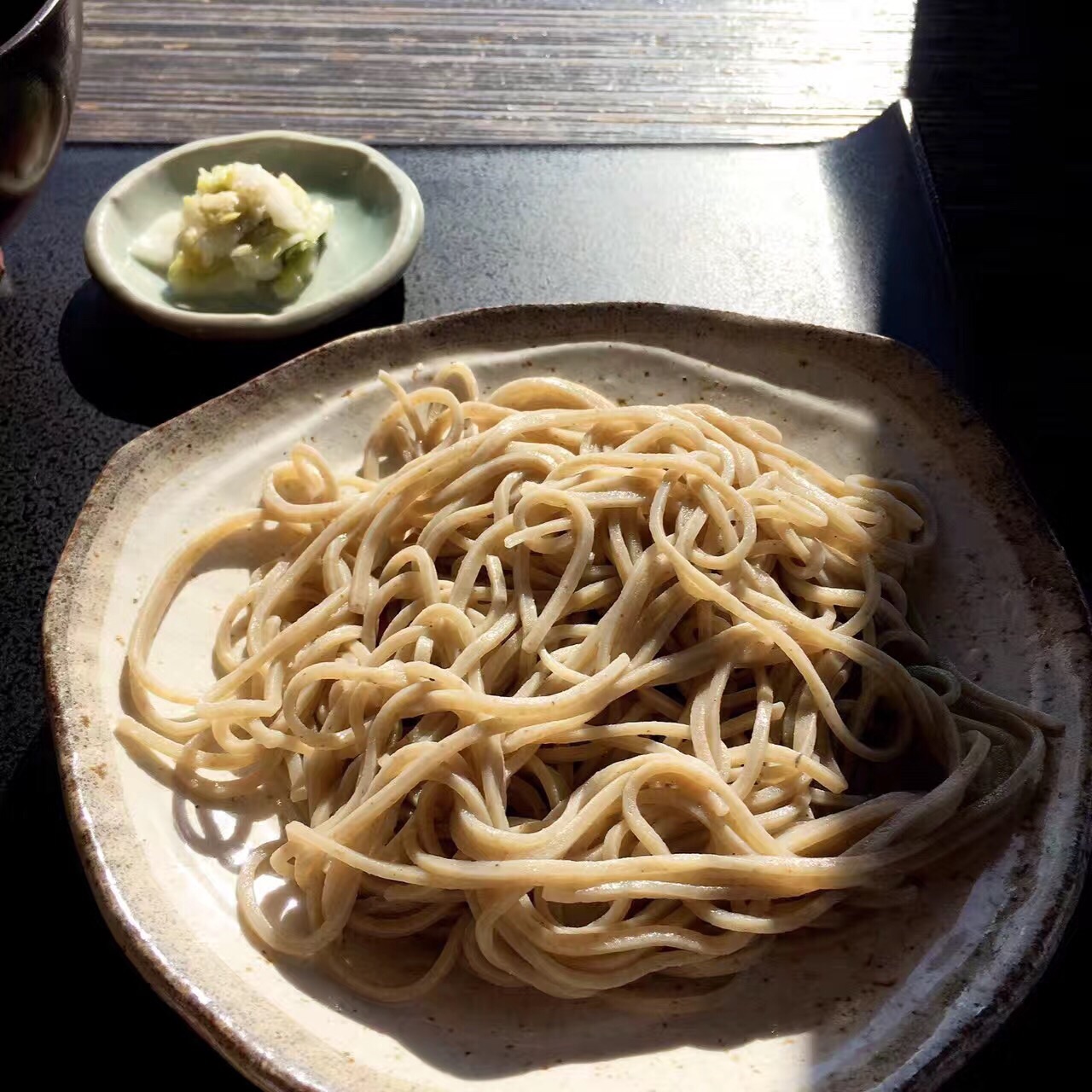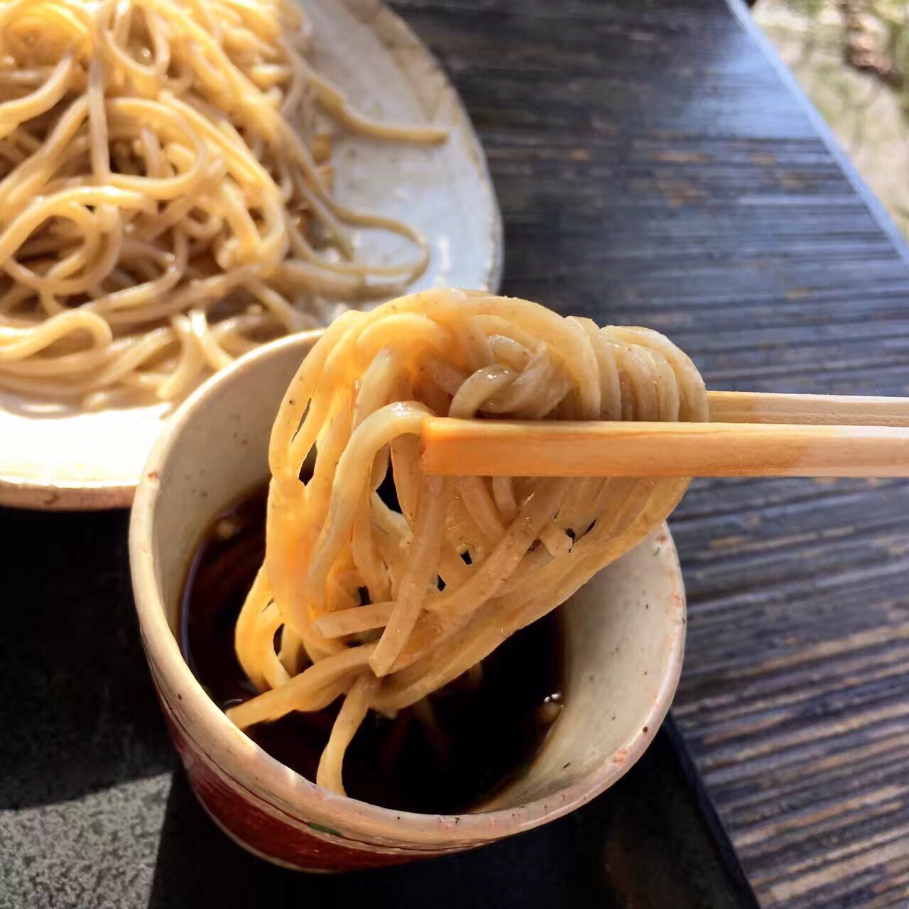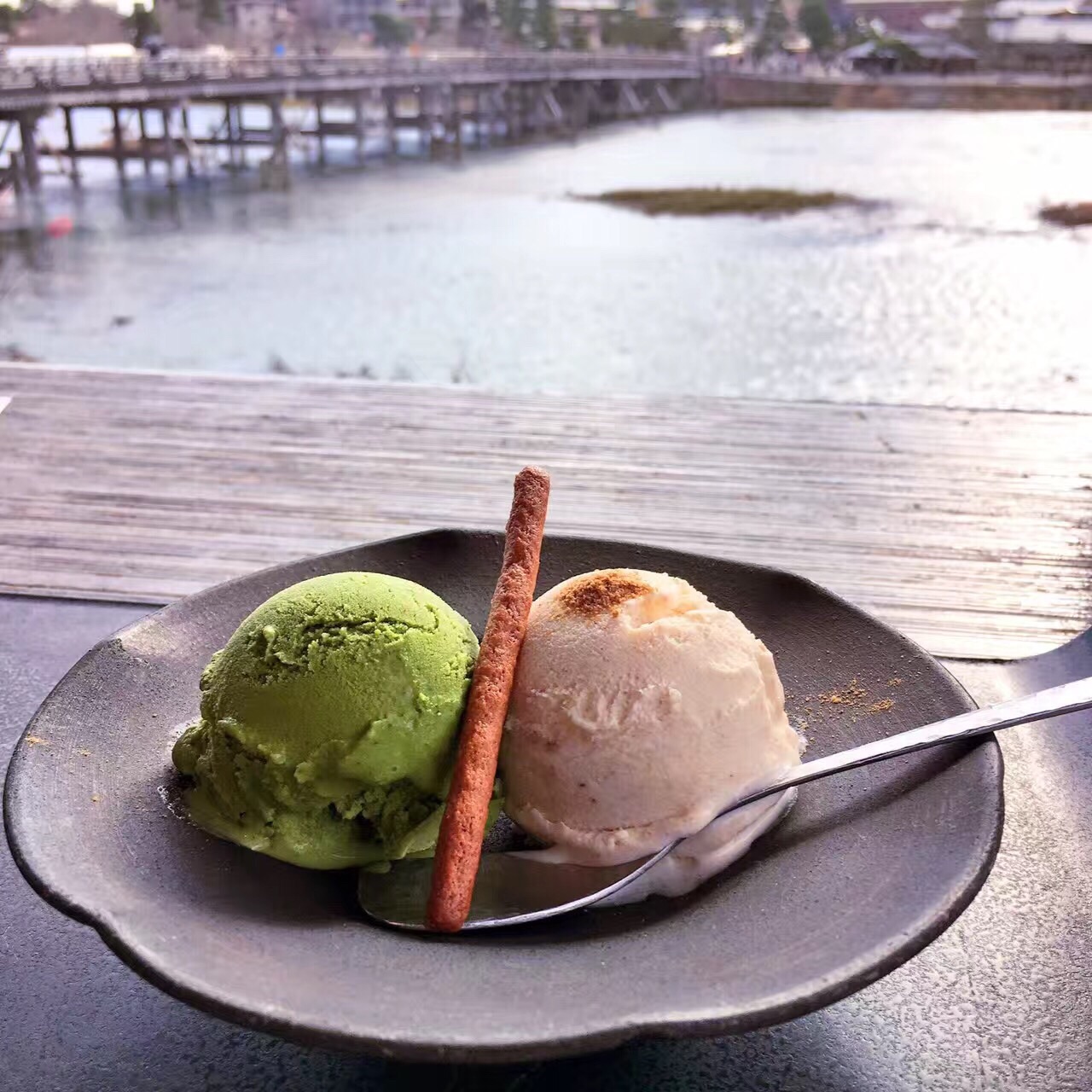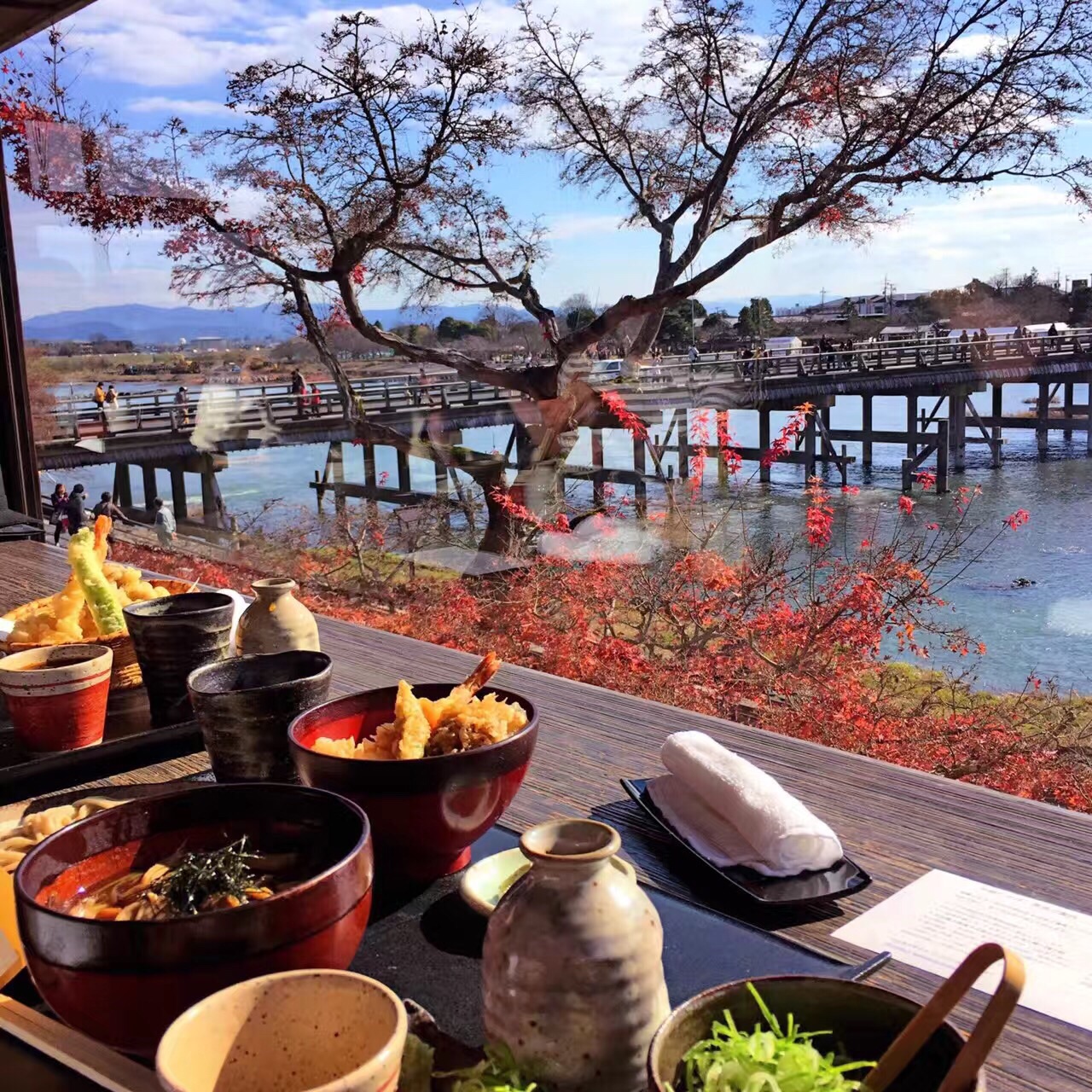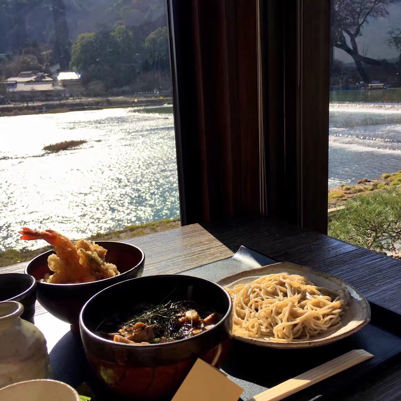 岚山美景+素雅荞麦 よねむら是京都很有名的一家手工荞麦面店,清水寺店的环境同样优美。位于岚山的这家店,真的是观赏岚山美景不二之选。坐在窗边,可以看到来往的行人和帅气阳光的人力车小哥。还有桂川上徜徉游荡的木舟,吃饭时这种回归自然的好心情,让美食变得更美味。 推荐最朴素的十成荞麦,面香特别纯粹,蘸上配有青葱和山葵的汤汁,味道清爽不拖泥带水。【预约】需要提前预约,否则樱花季和红叶季 没有位置。而且人多的时候,不能预约靠窗位置。