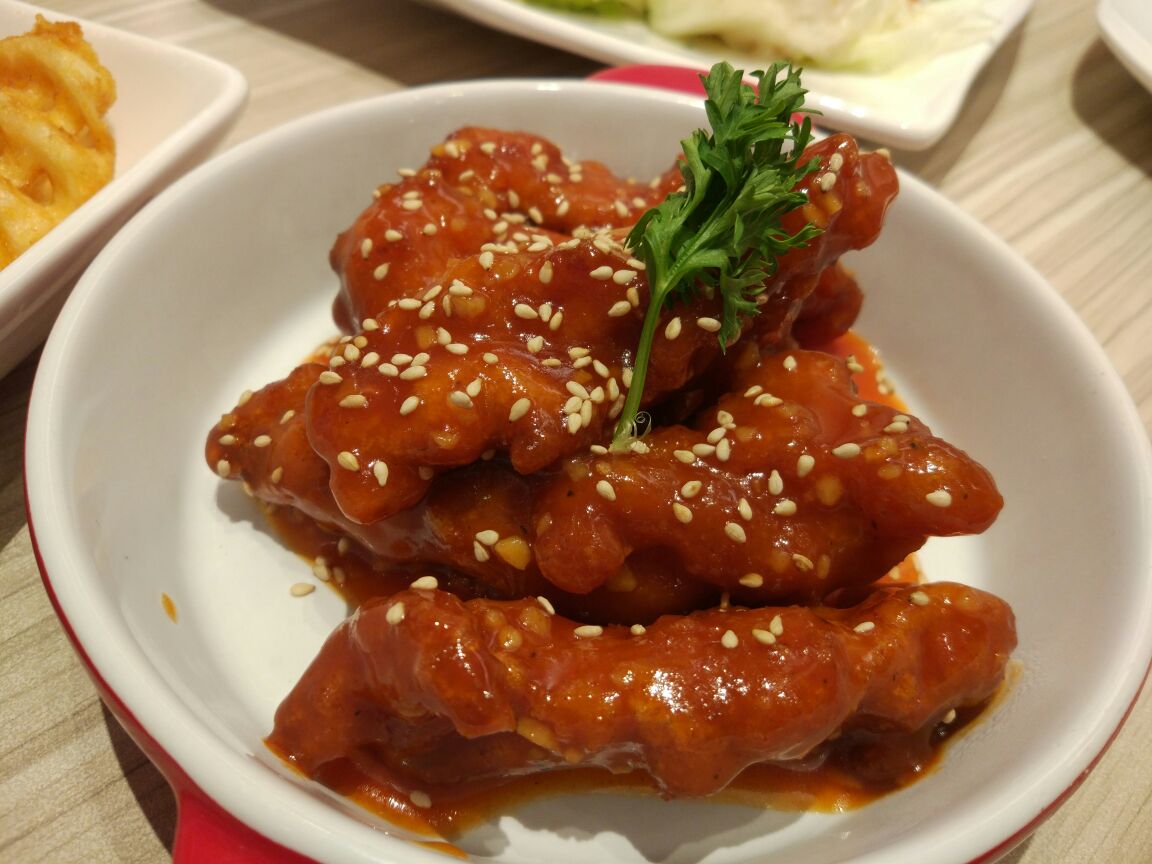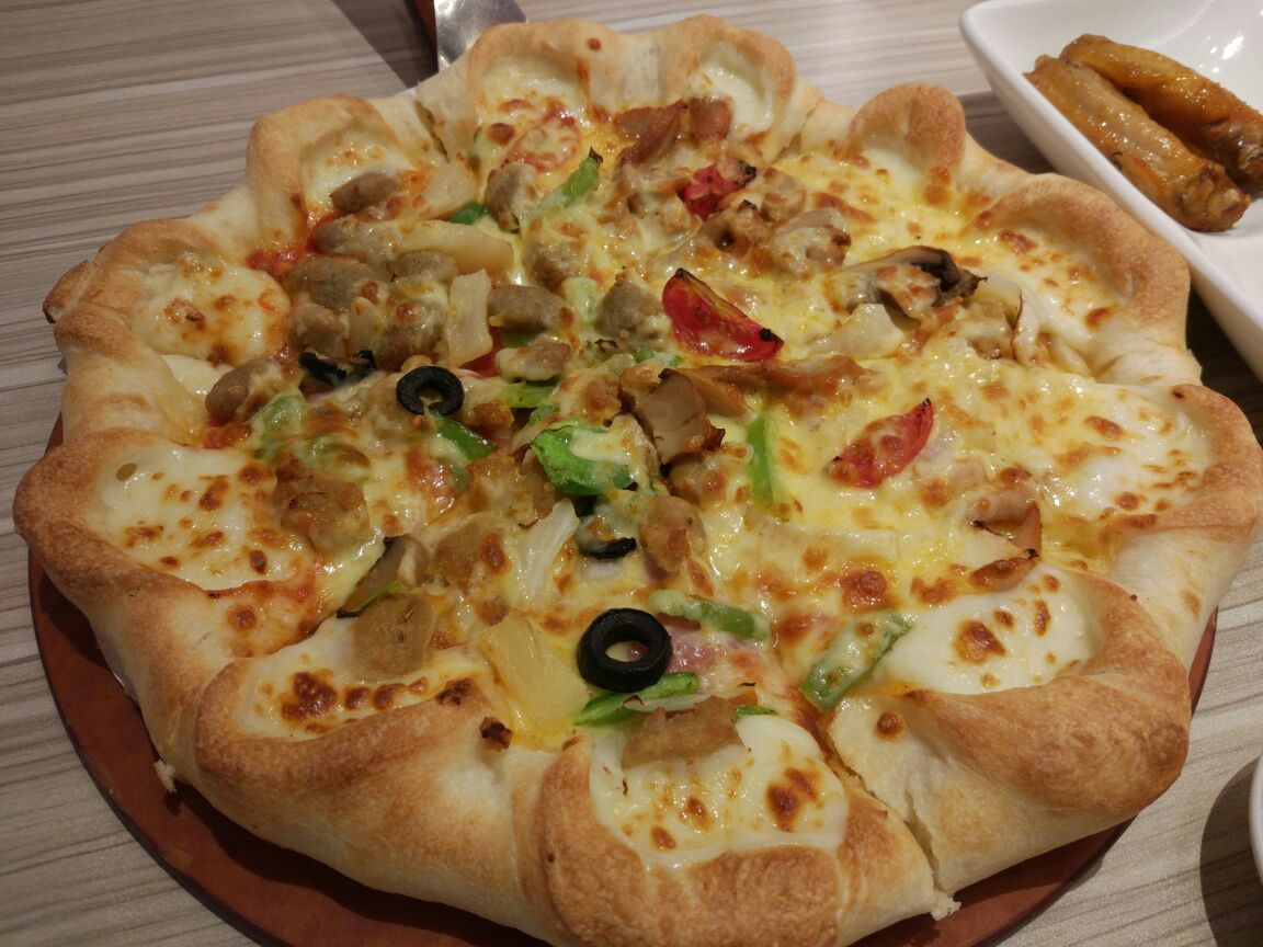 补个作业吧,还是之前和同事小坐,来单位附近的必胜客,中午吃饭的人还比较多,最好是先有人过来占个位子,这样会更稳妥些。 芝心披萨,我们的最爱,卷边里有满满的芝士,趁热吃,还能拉出丝儿~忘记比萨叫什么名字了,反正上面的料很足。土豆沙拉我喜欢,小吃拼盘的薯格,鸡翅,非常好吃。