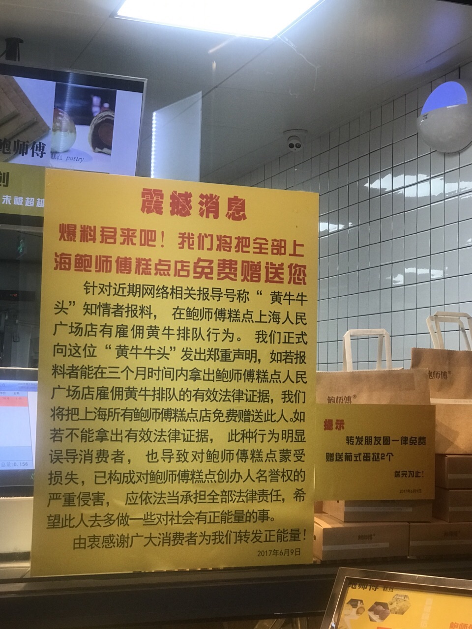 久仰鲍师傅大名,也一直经过江苏路这家鲍师傅,一直怀疑真伪,因为外面山寨的太多了。今夜再起骑车路过,特来一探究竟,看照片和布告,应该是真鲍师傅。买了两个海苔肉松小贝,回家尝了尝,跟苹果花园的其实都差不多,谈不上好吃难吃,反正适合自己的口味就是好吃。公告栏也写得很诚恳,作为小老百姓,转发朋友送两个蛋挞的促销还是挺有诱惑力的。