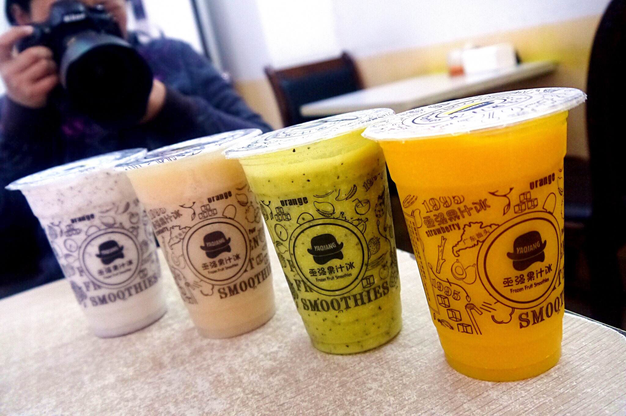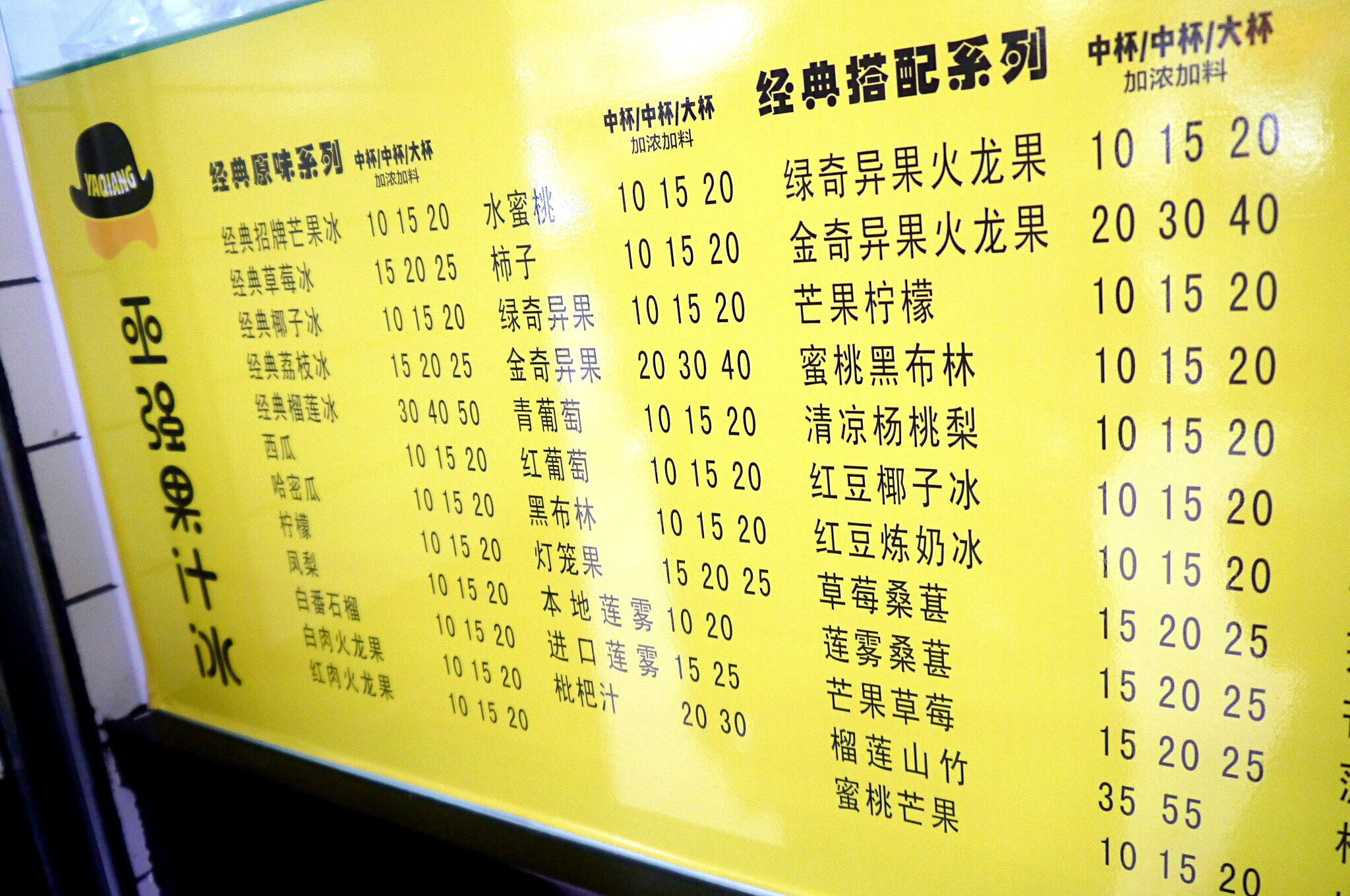 用户体验实在是好 就连亚强果汁冰都没有排队! 事先做好了排1~2个小时的准备 到了真心泪牛满面 其实技术不复杂 不过是新鲜水果 冰块 白糖加搅拌机 果汁冰在于果肉的浓郁和顺滑 比一般果汁浓稠很多 也更有风味 口味还分普通和特浓 特浓就是水果多一些 他家胜在水果新鲜 搭配新颖 价格合理 口感醇厚 夏天来一杯沁人心脾 一人一杯 颜色各不同呢 芒果很新鲜 椰汁清甜 榴莲也很浓郁 山竹百香果最贵 但酸酸甜甜最好喝 总体而言 新鲜的味道是不会欺骗味觉的