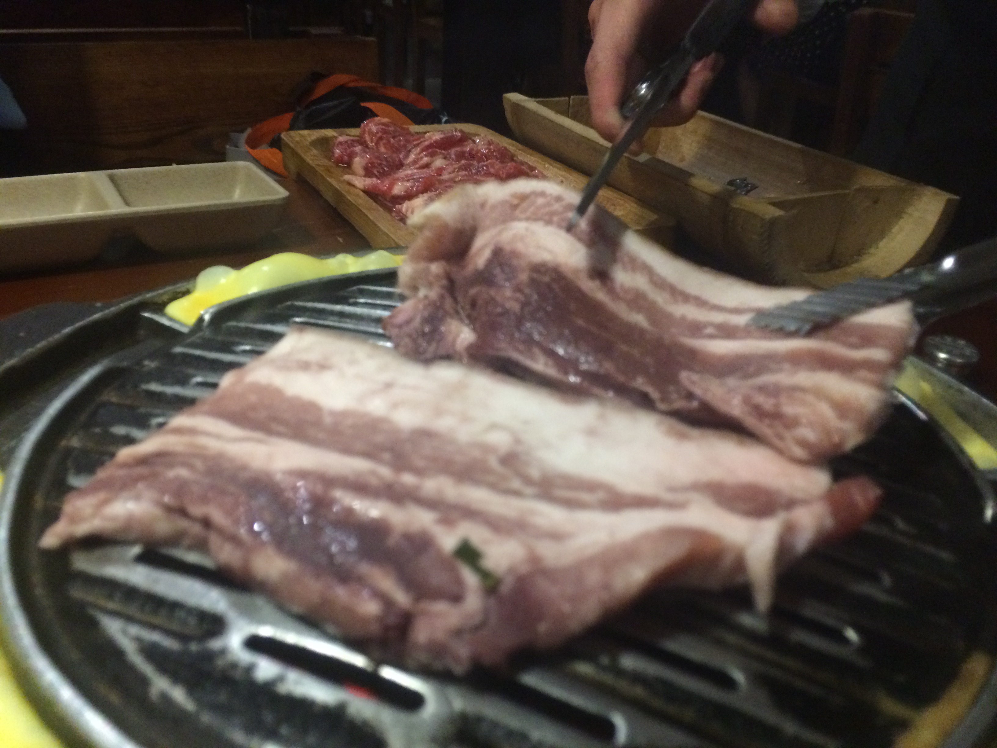 餐厅位于汉街国际总部C座对面,主打韩国风味。推荐辣五花肉、梅子肉、牛排肉。餐厅一桌一炉,炉子上有一个抽烟机。食材都很新鲜,五花肉肥瘦搭配,肉质Q弹不柴,搭配有蘸酱和粗盐。餐前还会上很多小配菜。大酱汤味道很足,感觉一碗汤就可以吃掉一碗饭。还有各种炒年糕和拌饭,味道都很好,值得推荐。