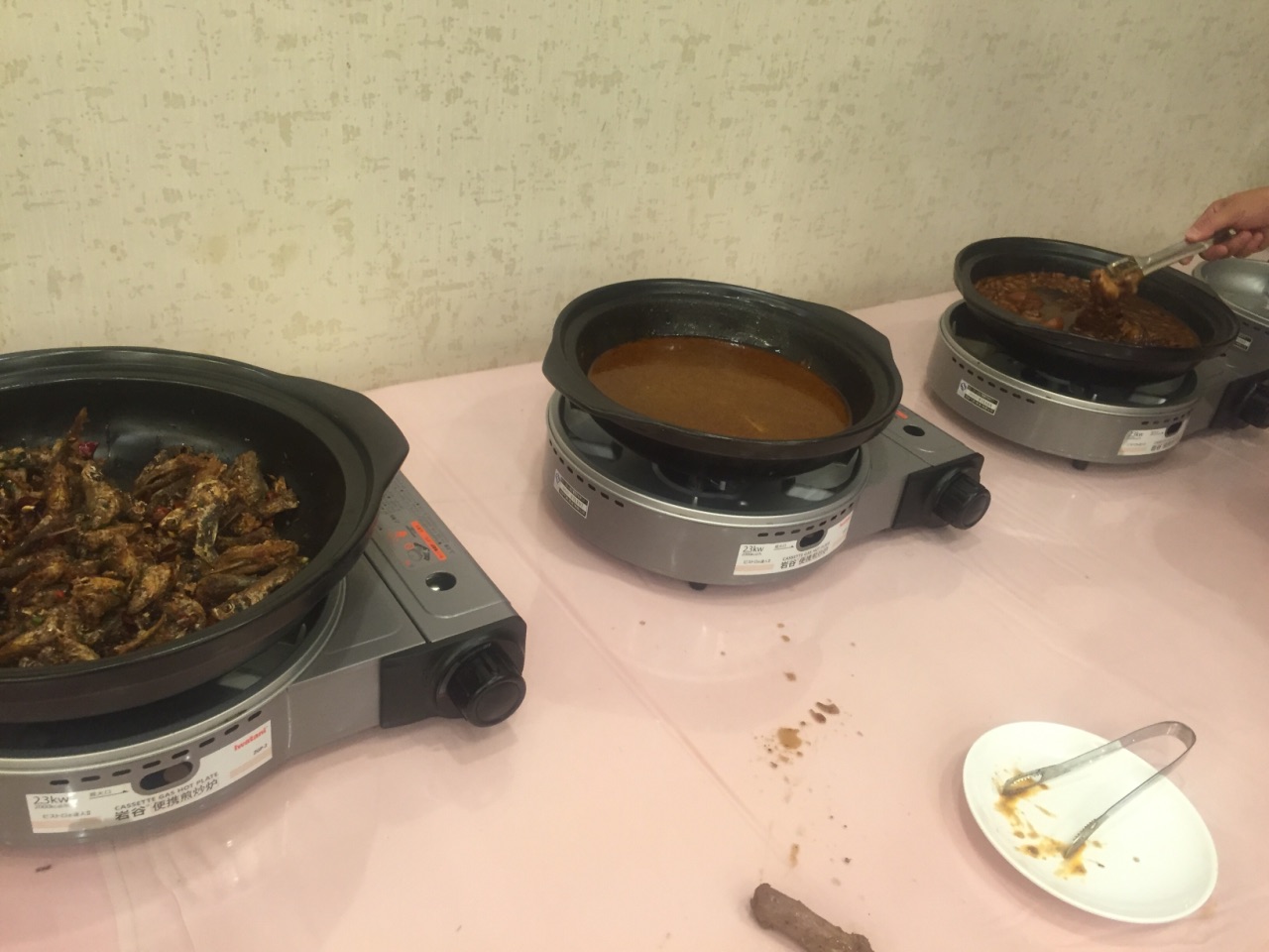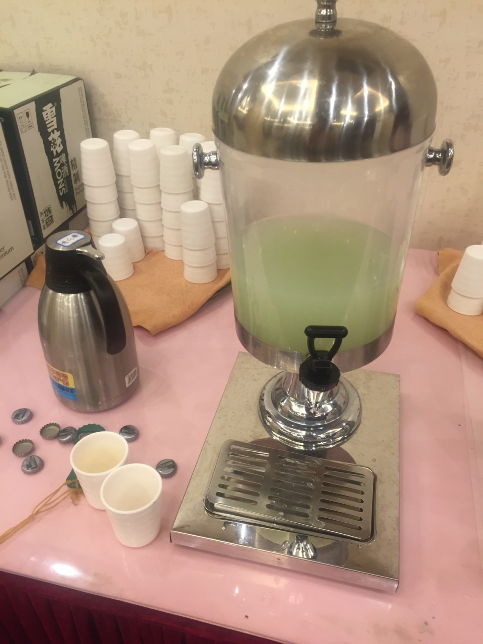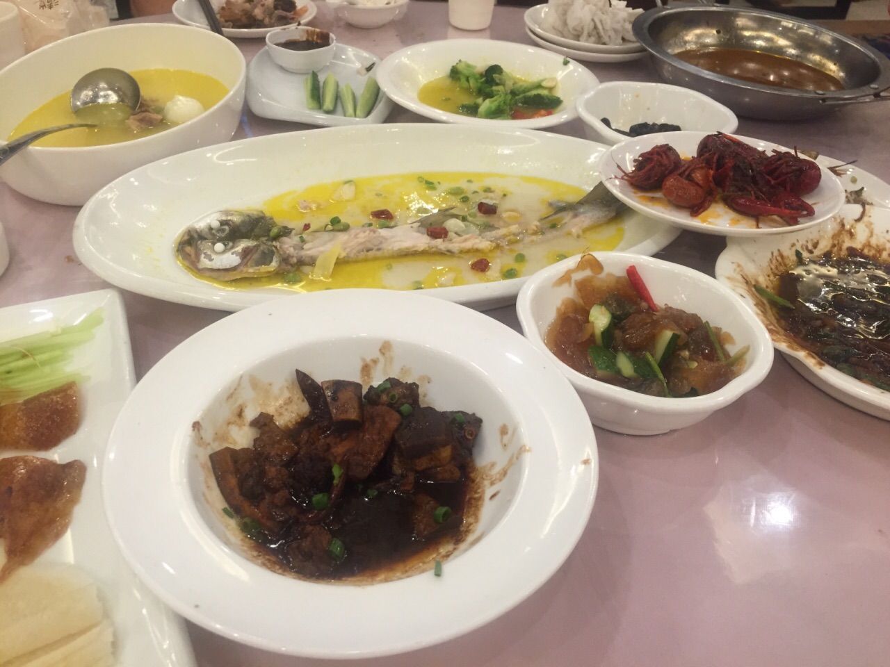 周末回家看父母,天太热,老爸不想下厨,老妈说我们去对面的时代大酒店吃自助餐吧。 酒店跟小区一条马路之隔,走过去5分钟。自助餐很便宜,42块钱一个人,是用点菜形式的自助,在点饭处看图片点菜,点完后回座位等着上菜。 啤酒,菊花茶,冲泡的饮料含在餐费内,猪蹄黄豆,小龙虾,鸭头等在餐台上自己去拿,但是空了不会再补。 4个人点了10来个菜,菜量不大,质量也一般,盐水虾个头好小,白条鱼土腥味重,牛肉很咸,鱼圆土鸡汤味精放多了,烤鸭没几片肉,烂糊鳝丝味道还不错。 服务员都是大姐,态度也不大好。