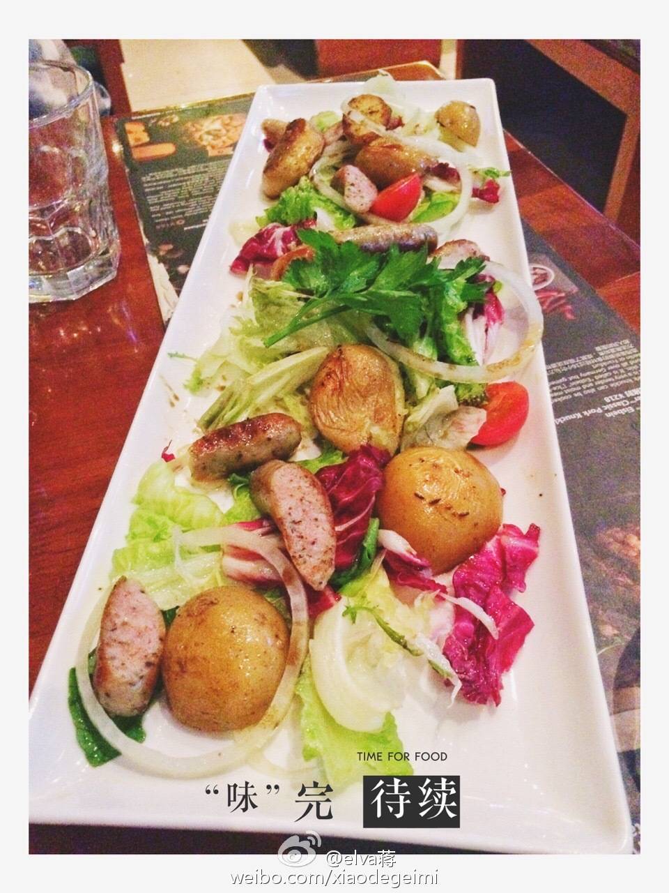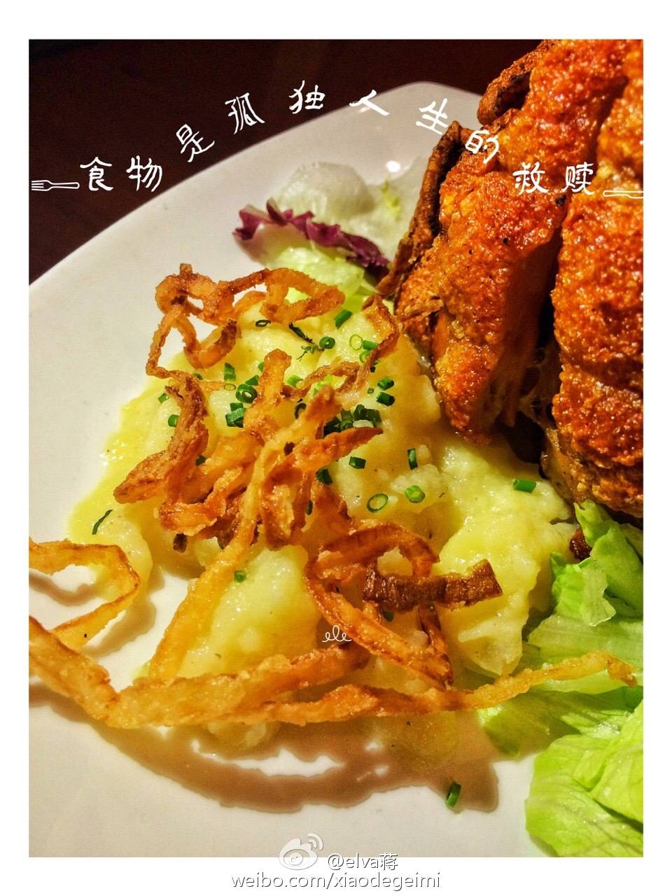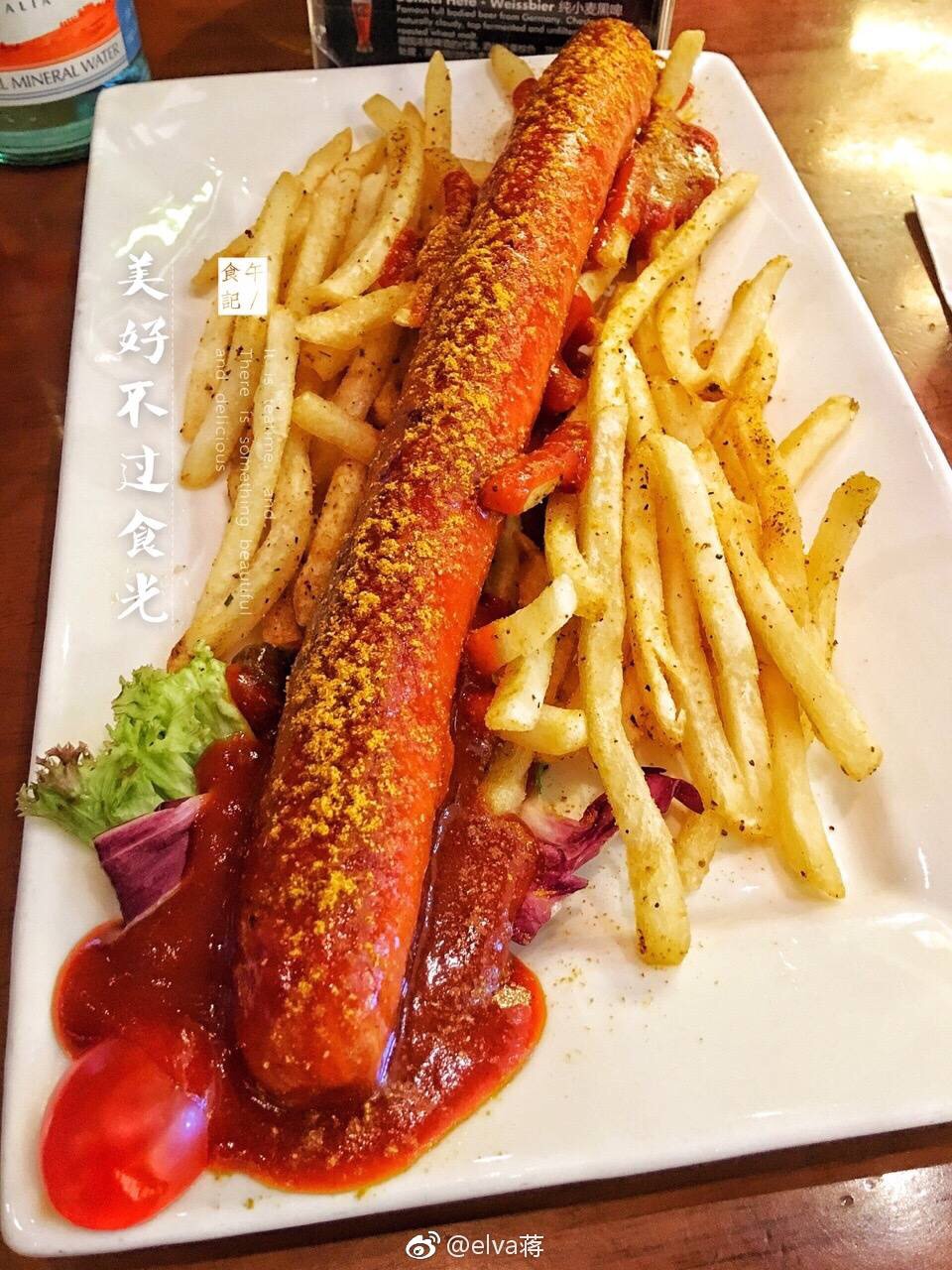 #跟着elva蒋吃美食# 某人心心念的德国猪肘,可惜比想象中来的失望了~ 猪肘皮像在吃猪油渣一样的口感~ 虽然搭配的酸椰丝跟土豆还有腌黄瓜解腻了,但搭配的猪肘酱总有种说不说怪怪的口感~ 肉质还有一股淡淡的猪骚味~是的,是猪骚味~我妹说的,我也觉得!! 咖喱香肠有一股中药味在,肠仔味道还可以,薯条上淋的番茄酱就有点乱,还是觉得自己蘸着吃会更好~ 额外加的一份纽伦堡香肠色拉来救场,蔬菜也帮助解腻不少,额外还跟服务员拿了柠檬去调下味~ 三个人才勉强吃了一半~剩下的打包带走,店员说需要收费,OK,没问题,但很奇葩的是包装盒收了我费用,连包装袋(一个很普通的纸袋)也还额外收费,第一次遇到连打包都可以收费两次的情况~