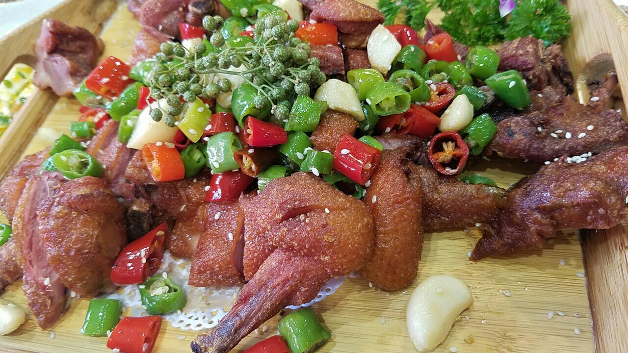 这家店生意很红火啊,晚上才到饭点就已经坐满了人。虽说名字叫农家菜,但仲夏夜最爱的还是小龙虾+烧烤组合。 小龙虾:点了十三香和黄焖2个种口味,虾的个头虽然不是很大的那种,但已经个个有虾黄了,虾肉也紧致饱满。现在点小龙虾还配一份炒花蛤,哈哈,过过小酒也是很赞的呢。 蒜泥烤生蚝:生蚝是现开现烤的,很新鲜,味道也不错。 金牌秘制鸭:一整只鸭子,味道有点像香酥鸭,外脆里嫩。