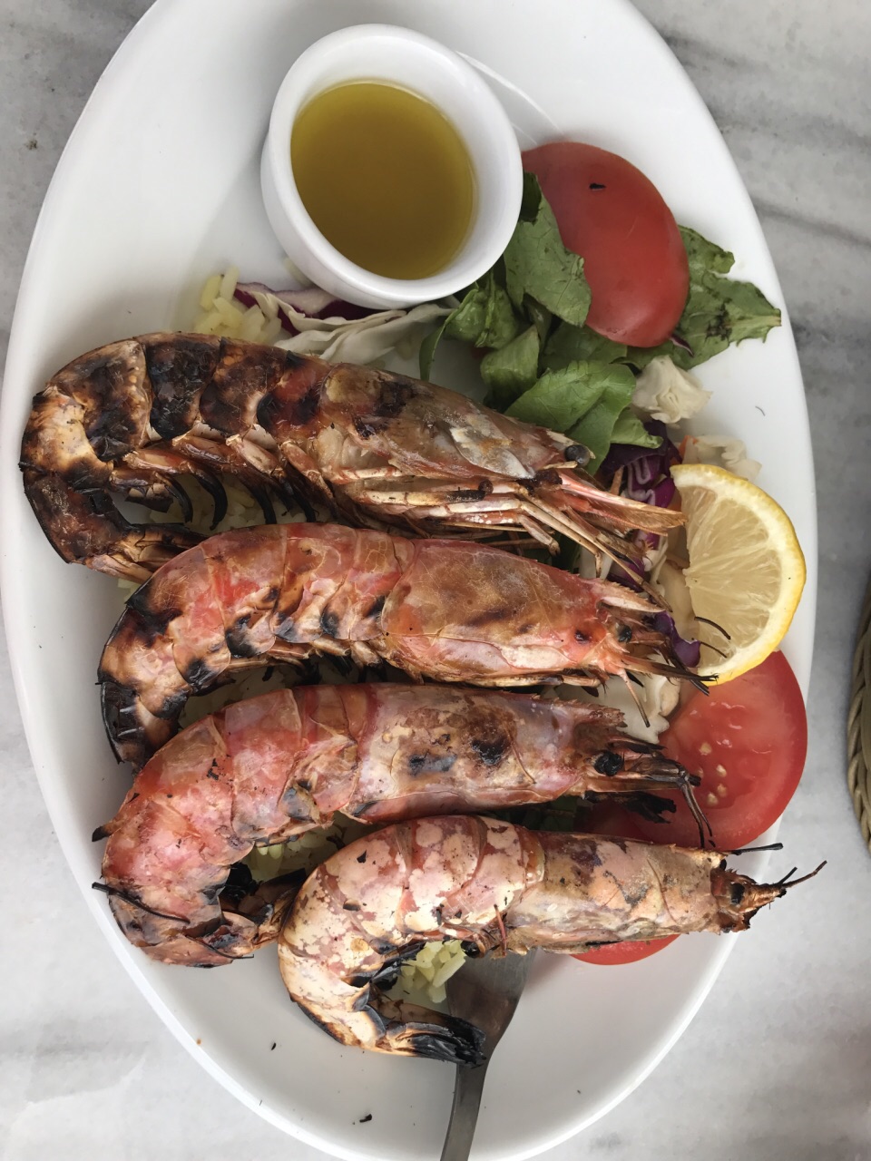 东西很好吃,看海的位置也比较多,环境挺好的,然后我们点的烤虾饭还有一个茄子和肉做的菜,特别推荐这个茄子的,超级好吃,是这里真正的特色菜,中国人喜欢的那种口味。烤虾下面的米饭,这里的饭都有隔夜的感觉,还加柠檬哈哈。但是虾很好吃。这几天吃的店用的最少的的一家,两个人40欧