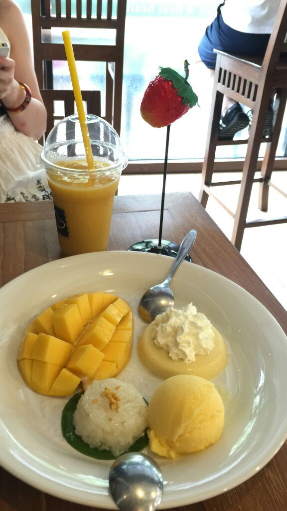 这家在三王纪念碑旁,餐厅还挺大的,环境很好有两层,芒果糯米饭,芒果沙冰,价格和tango差不多清迈是产芒果的地方,小镇也有很多以芒果为主题的餐厅。这家在三王纪念碑旁,餐厅还挺大的,环境很好有两层,芒果糯米饭,芒果沙冰,价格和tango差不多。
