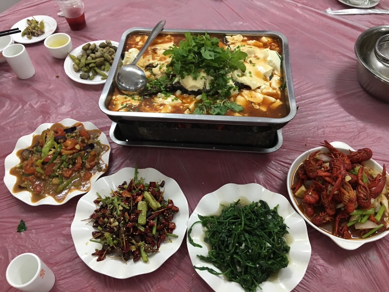 在荔波的第三晚,本来想再换一家旁边的老马家,不过去的时候比较晚没有空位了,而且服务员看上去也不热情,因此还是选择了这家,点了不同的菜换换口味。这次我们坐在了二楼的空调间,挑了一条2.7斤左右的喀斯特洞鱼,长的和鲶鱼类似,68元一斤,在182元左右。尝下来,鱼骨头比较少,肉比较厚实。几顿的鱼吃下来感觉还是小七孔青鱼最好吃。野菜失误了,忘记下去挑,结果上来的野菜没有上次自己挑的好吃,有点苦。牙签牛肉还可以,量多,也很香,还有芹菜当配菜。茄子的味道一般,卖相也有点差。龙虾的味道还行,一下就解决光了。这次还送了一盘花生和毛豆,我特意问了服务员,说上次我们吃饭怎么没送呢?服务员说可能忙的忘记送了吧,好吧,其实送不送倒也无所谓啦。不过朋友们吃之前可以先问问,送不送花生和毛豆,送嚒就算多了一道菜随便吃吃也是蛮好的。