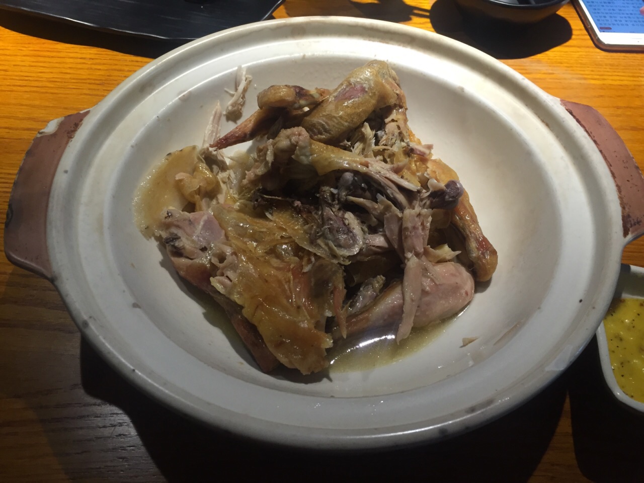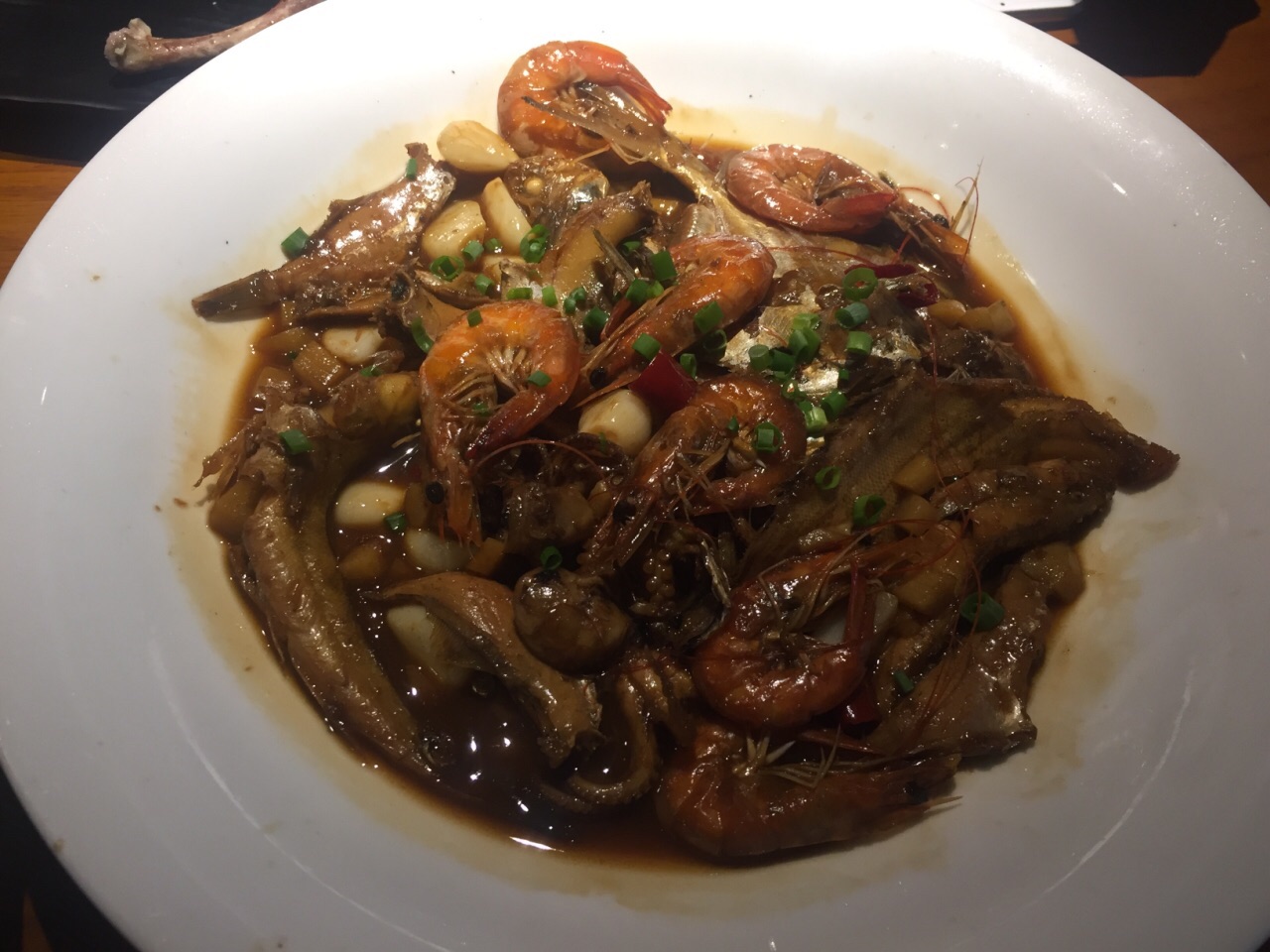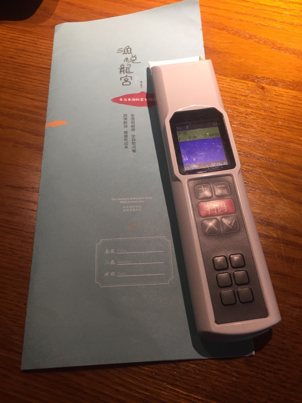 在大众点评517活动中兑换了一份龙宫飘香鸡,在即将到期的时候赶紧过来吃掉。 这家店在杭大路上,开了好些年了,之前叫龙宫大酒店,现在改名了。吃饭可以免费停车,门口保安会指引的。 店里很大,还有2楼,环境不错,但是中午吃饭时间没几桌客人。点单方式很特别,用扫码器扫菜码点菜。上菜很快,龙宫飘香鸡端上来是温的,应该不是现做的,跟外婆家的茶香鸡的造型和味道都很像,区别在于多配了份芝士酱,但是鸡肉蘸芝士酱不好吃,还是蘸里面的汤汁好吃。红烧杂鱼烧的好咸,里面有长靴,小黄鱼,豆腐鱼等,还有鱿鱼仔和虾。芋艿烧的很酥烂好吃,又入味。 菜量比较大,两个人,三个菜加上两碗饭,吃的很饱了。