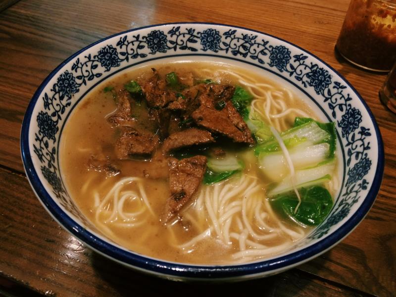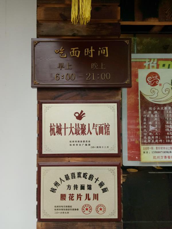 在江干区这边解决午餐,选了这家号称杭帮面代表性面馆的——方传面馆,话又说回来了,作为地道杭州人,其实很少正经八百的去吃杭帮面。 门口挂着各种奖牌,“杭城十大最聚人气面馆”“杭州人最喜欢的十碗面”“杭帮面代表性面馆”N多奖牌招牌等,不一而足。然而我心里却有点发虚了,自家知道自家事,这么折腾的装X,一般都是靠着名气吃饭的,期待值顿时降了一半。 点了一碗猪肝面(汤面),店里人生还是挺好的,周围公司多,大多都会选择来这儿解决午餐。价格不便宜,都是30上下的价格。人一多,服务员也忙不过来,凳子桌子都偏油腻,上面的速度也挺慢,不过这种都是小事儿,面条好吃一切都不是问题。 然而我既没猜到开头也没猜到结尾,猪肝面端上来也是一脸懵逼。先说说猪肝,老的不像样子了,别说没有猪肝的那种柔嫩感,部分都已经爆到碳化了,也是无奈。 面条就是一般的机器面、汤则是普通面汤,杭帮面一般都这样,没啥好说的,没有油渣添加,面的分量比我想象中的要少很多。唯一不算缺点的,应该就是面汤不油腻吧。 这种吃过一次就算了,下次肯定不会来,毕竟名气不能当饭吃,何况价格也不便宜。顺带一提,明明店里顾客不少,表面上看似乎都忙不过来,但是吃完面走出来,却能看到厨师和帮工在门外面抽烟,也是蛋疼。