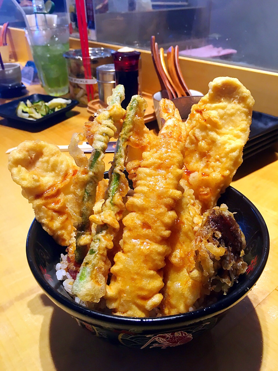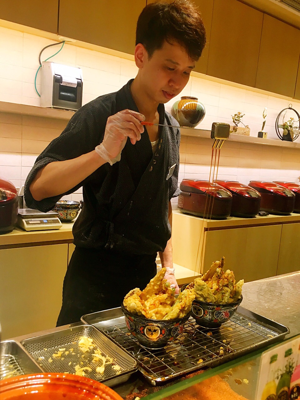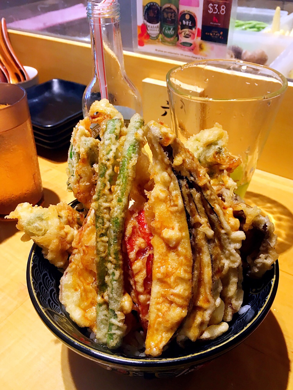 新加坡最好吃的天妇罗(之一),性价比最高的天妇罗(没有之一)。 ✔️蔬菜丼12.9新币,有南瓜、香菇、茄子、莲藕等8片天妇罗。特殊丼13.9新币,有2片炸鸡、2片炸虾、1个半熟蛋和4片蔬菜天妇罗。总的来说是蔬菜丼更好吃,鸡肉炸的太老,炸虾也一般,不如蔬菜天妇罗出彩。最喜欢的是番薯天妇罗。 ✔️每个丼都有味增汤和茶碗蒸,桌上还有腌制过的蔬菜凉菜随便吃。茶碗蒸很滑很嫩很特别。 ✖️绿茶可乐3.8新币,几乎没有绿茶味,就是很普通的碳酸饮料,卖这个价格真的太过分了。强烈不建议点。 ✖️因为是现炸,操作台就在面前,有油烟味。一整碗炸物吃着很腻,最后我并没有吃完,但是同行的小伙伴们吃的很开心。 这家店只收现金,平时很多人排队,建议在营业时间前就到那边提前排队。