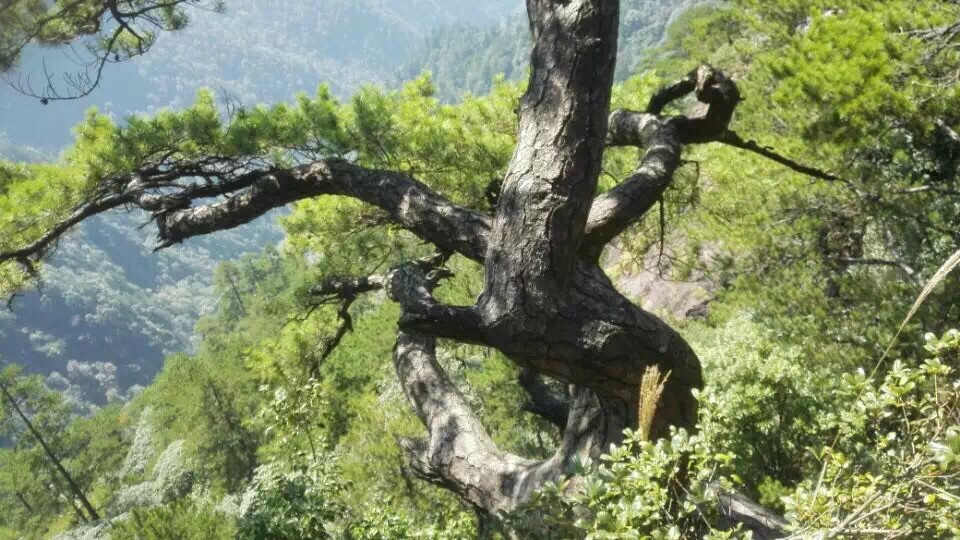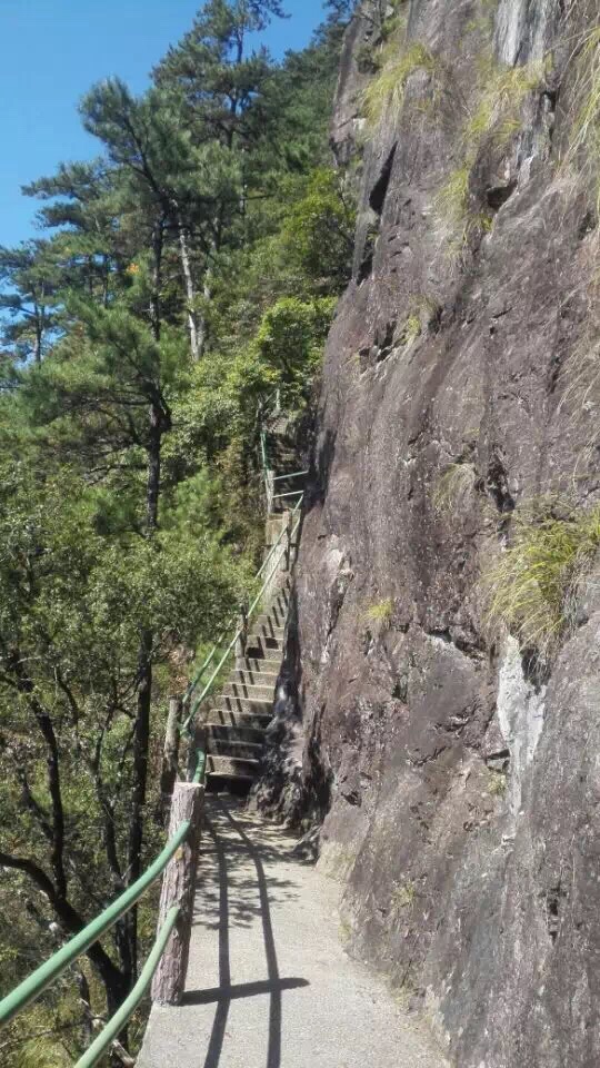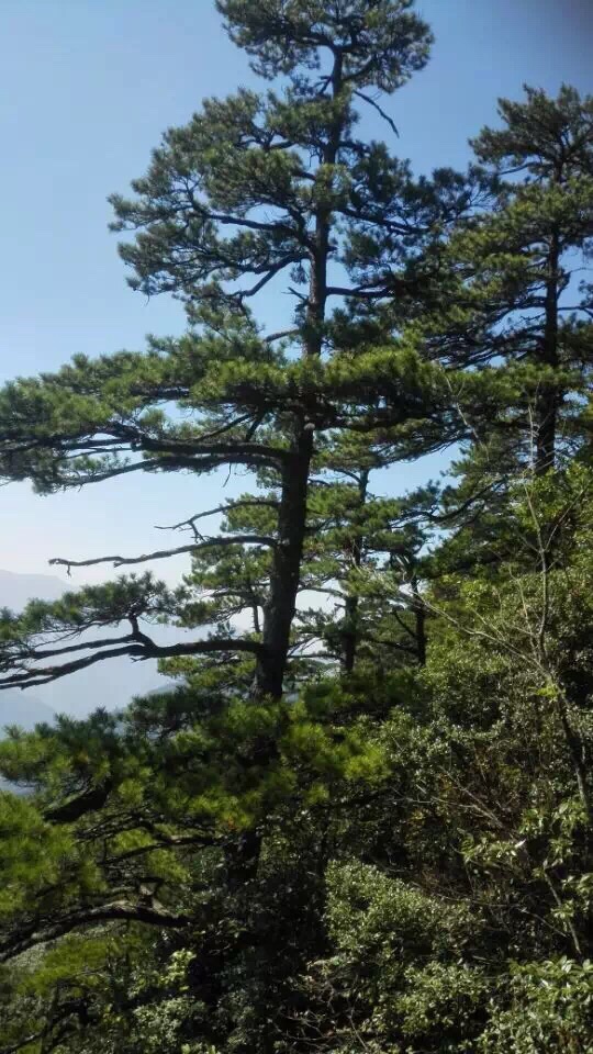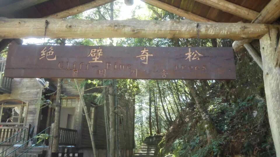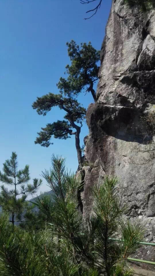 一棵棵奇松在绝壁上裂石而出,亭亭如盖,煞是壮观。游人处处涉奇惊险,美不可言。可见千仞石壁,矗立苍穹