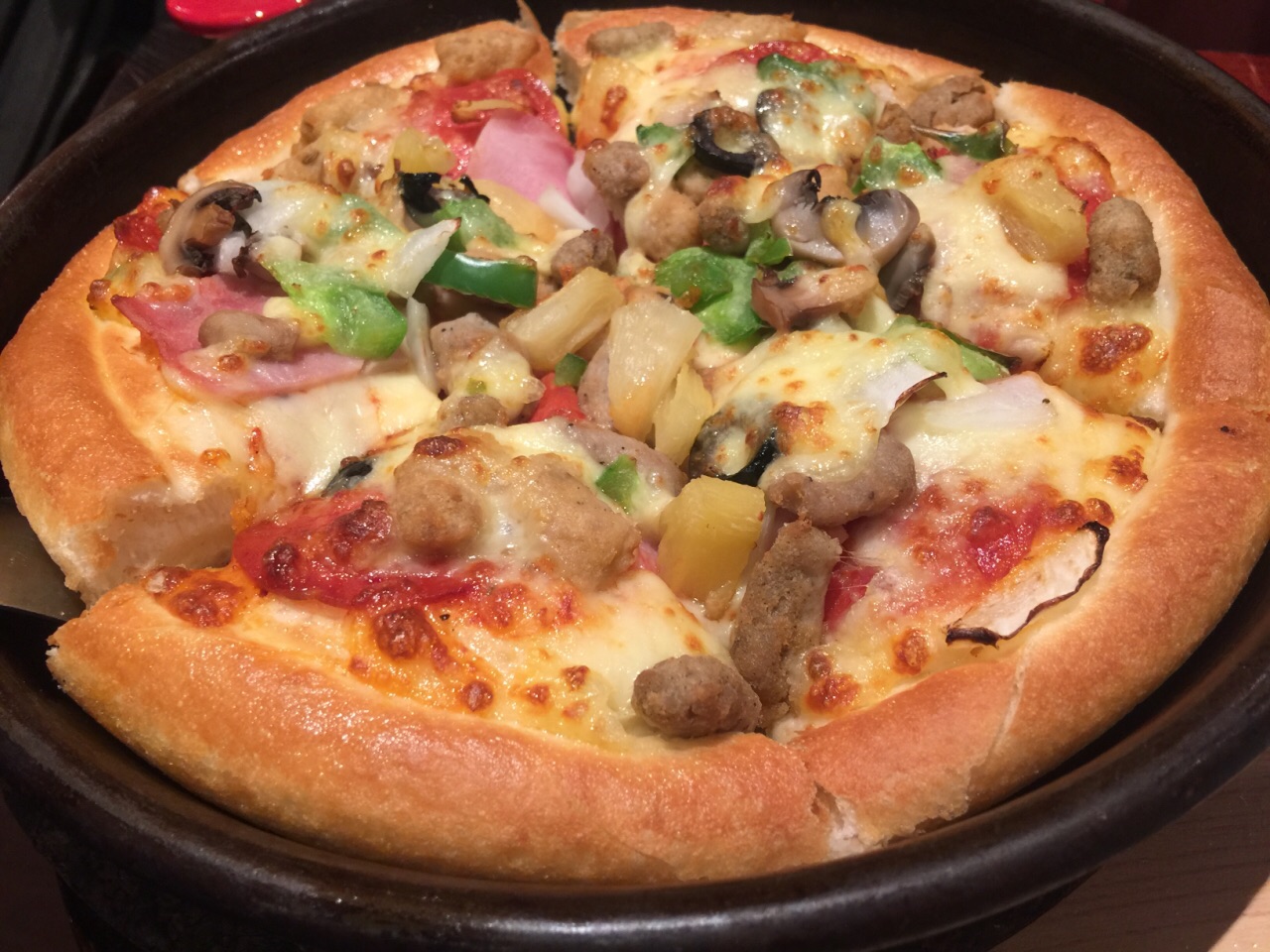 在长白山旅游几天,除了吃酒店提供的自助早餐外,几乎中午晚餐顿顿都在吃东北菜,小鸡炖蘑菇、大拉皮、杀猪菜、乱炖,白菜猪肉水饺,连续吃了好几天,已是吃得不要不要的,好不容易在万达小镇上看到必胜客的熟悉店标,亲切感犹然而生,生意很兴隆,好不容易找到一个门口座位入坐,点了248的套餐,包括了前菜主食小点饮料甜品,省钱又省心,再加了10元钱可以点个超级大容量的水果茶,披萨一如既往的水准,黑椒牛排和鸡翅都很好吃,下载个东北必胜客APP注册一下还送了一对鸡翅,红丝绒蛋糕口感平平,不够香浓幼滑,东北大婶服务很热情,由于套餐内已包含了三杯饮料 ,加的水果茶只能打包带走了,服务员给分了两杯装,清新爽口,超级合算。