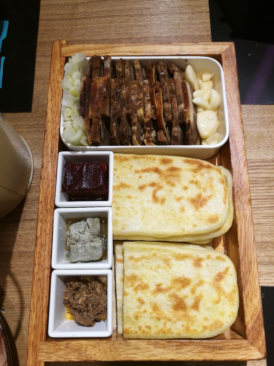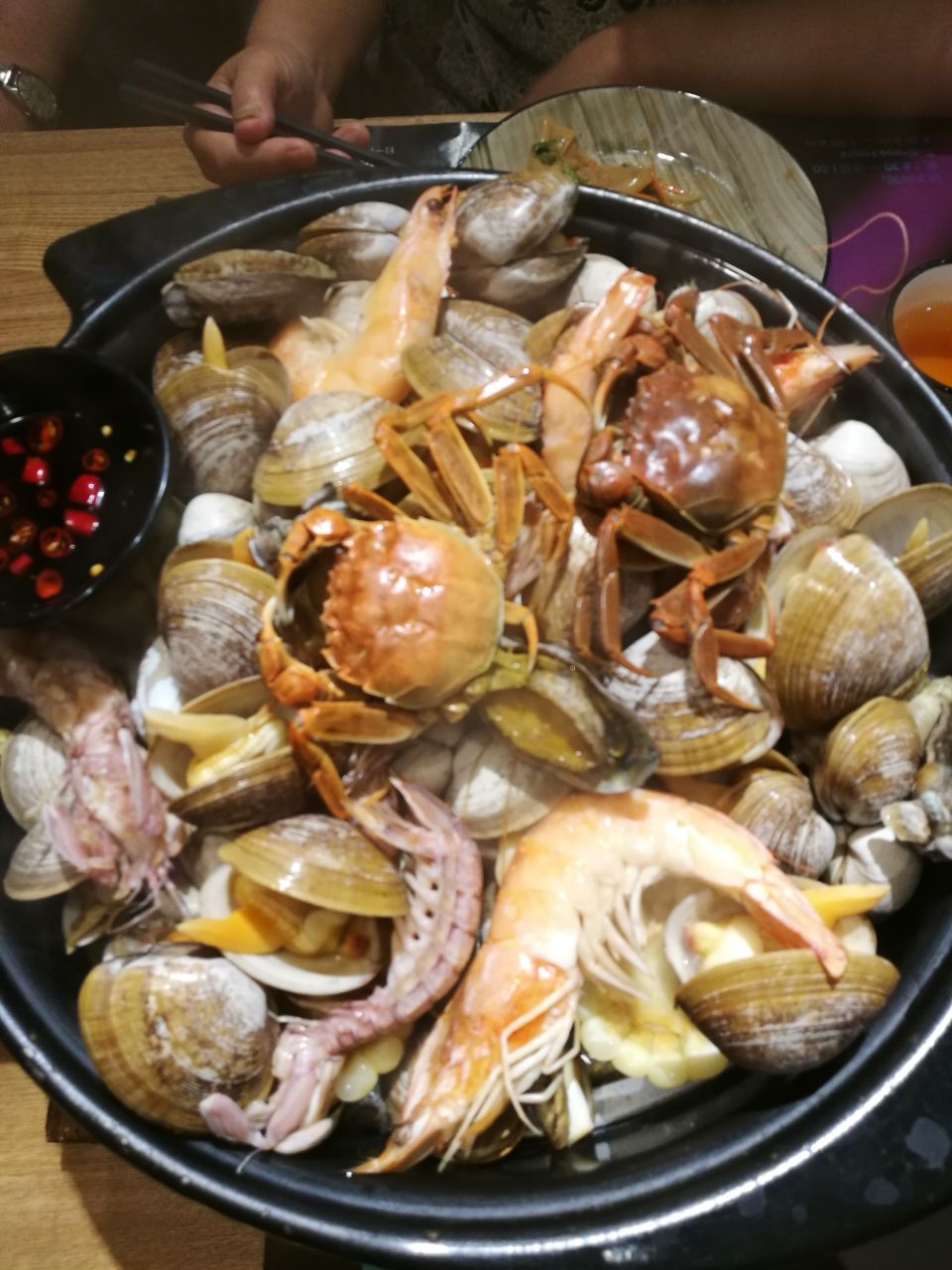 【四季餐厅】 周末带着爸妈去文化中心,也让他们看看天津博物馆的展览,路过体北,顺便再来了一趟四季餐厅,上次吃的时间不长,这次过来二刷。 周末中午依然是客满,不过我们幸运的拿了个2号,前面还有一个1号。门口的吧台随便坐,餐厅准备了水果和柠檬水,为等待的顾客解解渴。 ·鸡丝拉皮·28 一大盘切得很细的胡萝卜丝和黄瓜丝的上面堆着一团大拉皮,还没拍照,小服务员已经拿着勺子叮当五六一通搅和,好!颜值没了,味道却出来了,这大拉皮配上调好的芝麻酱,太香了,所有人都爱吃,满分推荐! ·海鲜霸王锅·80 上菜太快了,一人刚吃了一口拉皮,服务员就端来了一个大脸盆,重头戏上演!蒸盘上堆满了各式的海鲜,下面是蛏子和大青蛤,上面有几只鲍鱼,三只大虾,几只小皮皮虾,两只小螃蟹。老爸最爱吃海鲜,看到这个大海鲜锅,终于开始露出了笑容。 ·芝士焗黄金瓜·29 我是真心佩服这里的厨房,上菜也忒快了,南瓜切成小块,上面裹上芝士,来上一勺南瓜,可以拉出长长的丝,芝士的香,南瓜的甜,最佳组合,多吃点没坏处,给五星好评。 ·津门老味道·56 又一道重头戏出场,木头托盘,一小盘切好的头肉,咸淡适中,入口软嫩,肉香四溢,一盘口袋饼,烙得也是层多皮酥,臭豆腐,酱豆腐,虾酱都是天津重口味的调料,配菜是葱丝和蒜泥。放足配料,这味道可是太香了! ·板筋牛心菜·18 这算是一道普通的解腻菜,菜炒得味道不错,牛板筋切得像纸一般薄,也是很香。