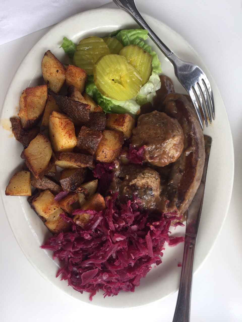 美食餐厅里面无外乎吃汉堡或者是烤鸡,还有牛排。烤切成一块块,吃起来也挺方便的,特别是配菜一种红色的白菜,吃起来酸酸甜甜的,非常的下饭