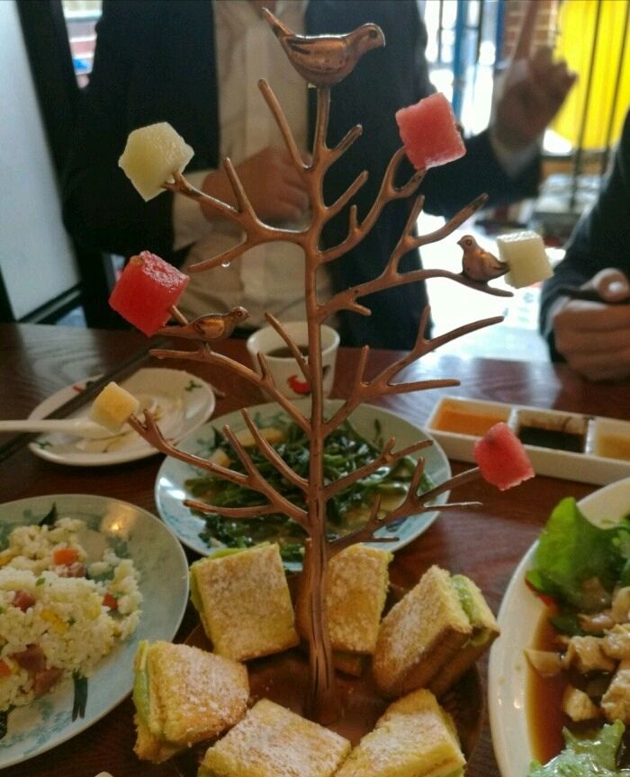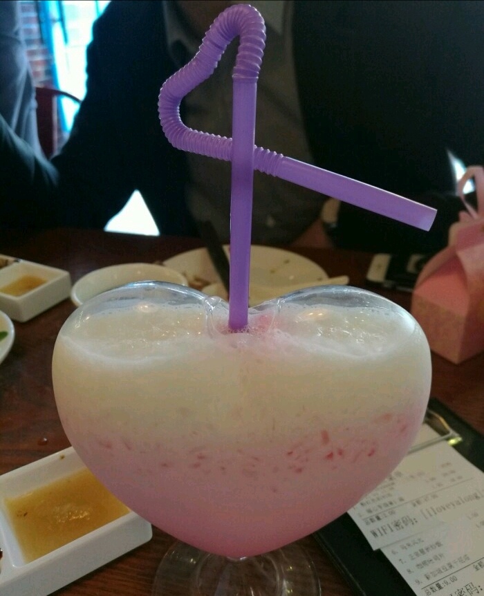 还是跟合算的 菜量也蛮大的 店堂不大 但是生意很好啊 服务员蛮忙的 所以服务上面还是有点欠缺的 一直都没给我们上小碗 说了好多次才上了 又加了一个甜品 还有推荐菜里面的粉红色的初恋 真的长的很美啊 海南鸡的鸡味道一般 但是酱汁还是不错的 而且四个人给了四份酱汁 这点很方便很贴心呢