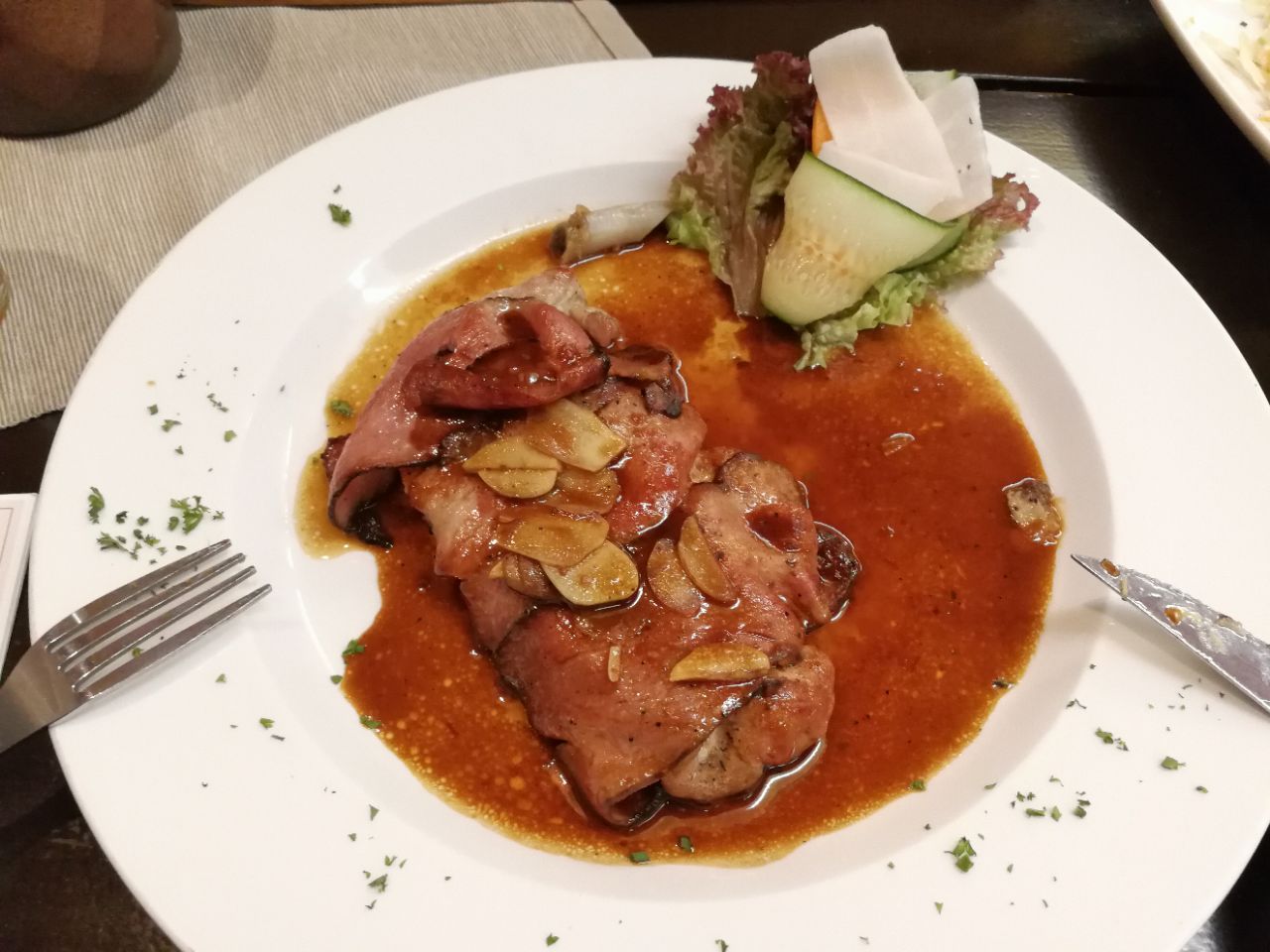 点了一份烤排骨、一份猪颈肉、一份沙拉,猪颈肉一般,烤排的分量超大,味道还算不错,关键是便宜。这里的烤猪肘180多克朗,而前一天我在老广场附近的餐厅同样的烤猪肘可是要590克朗。周围是居民区,旁边走几步有一家小士多店,一瓶500ml的矿泉水10克朗(景区40克朗)。餐厅附近有电车站,从老广场过来还算方便。