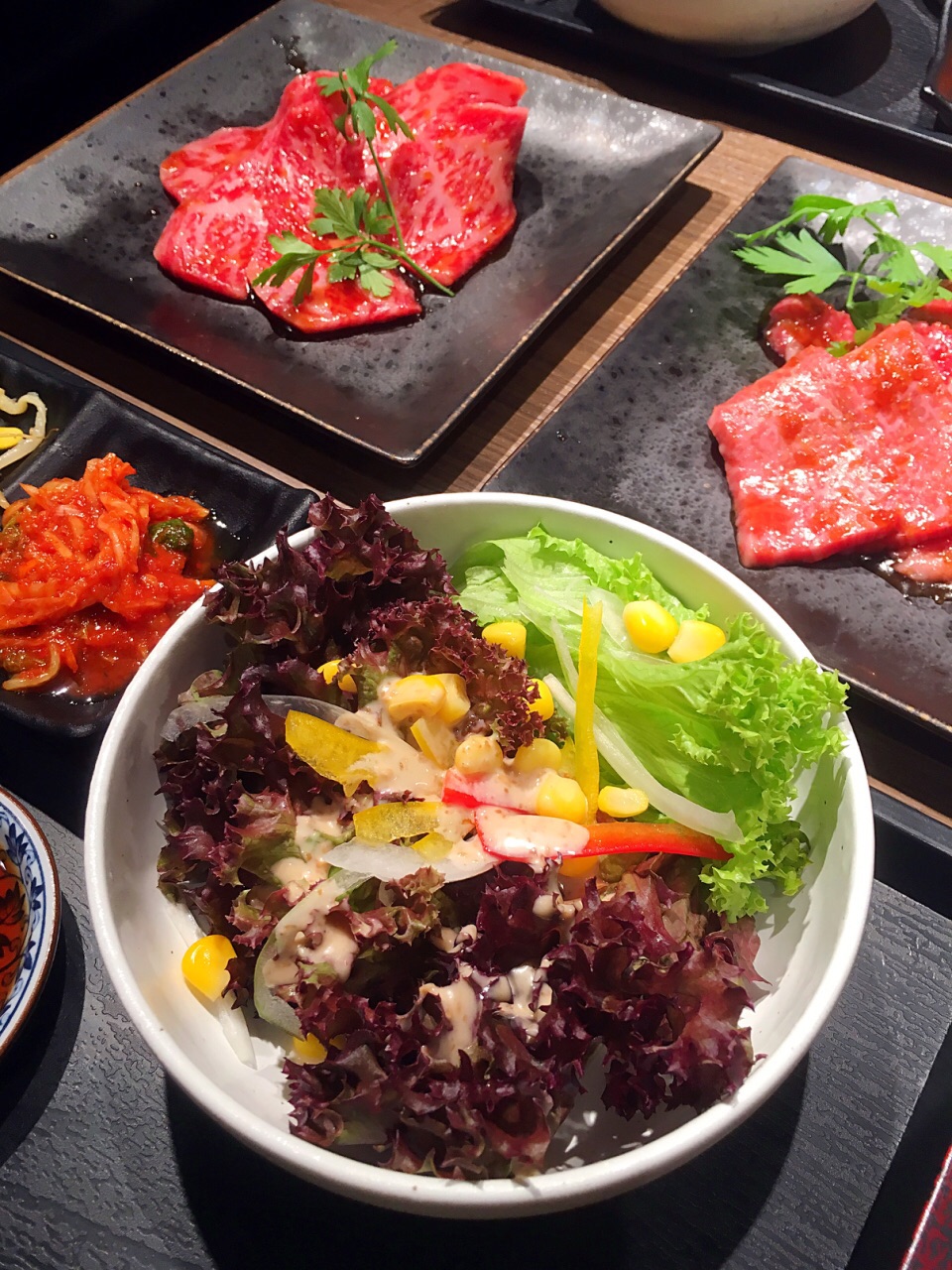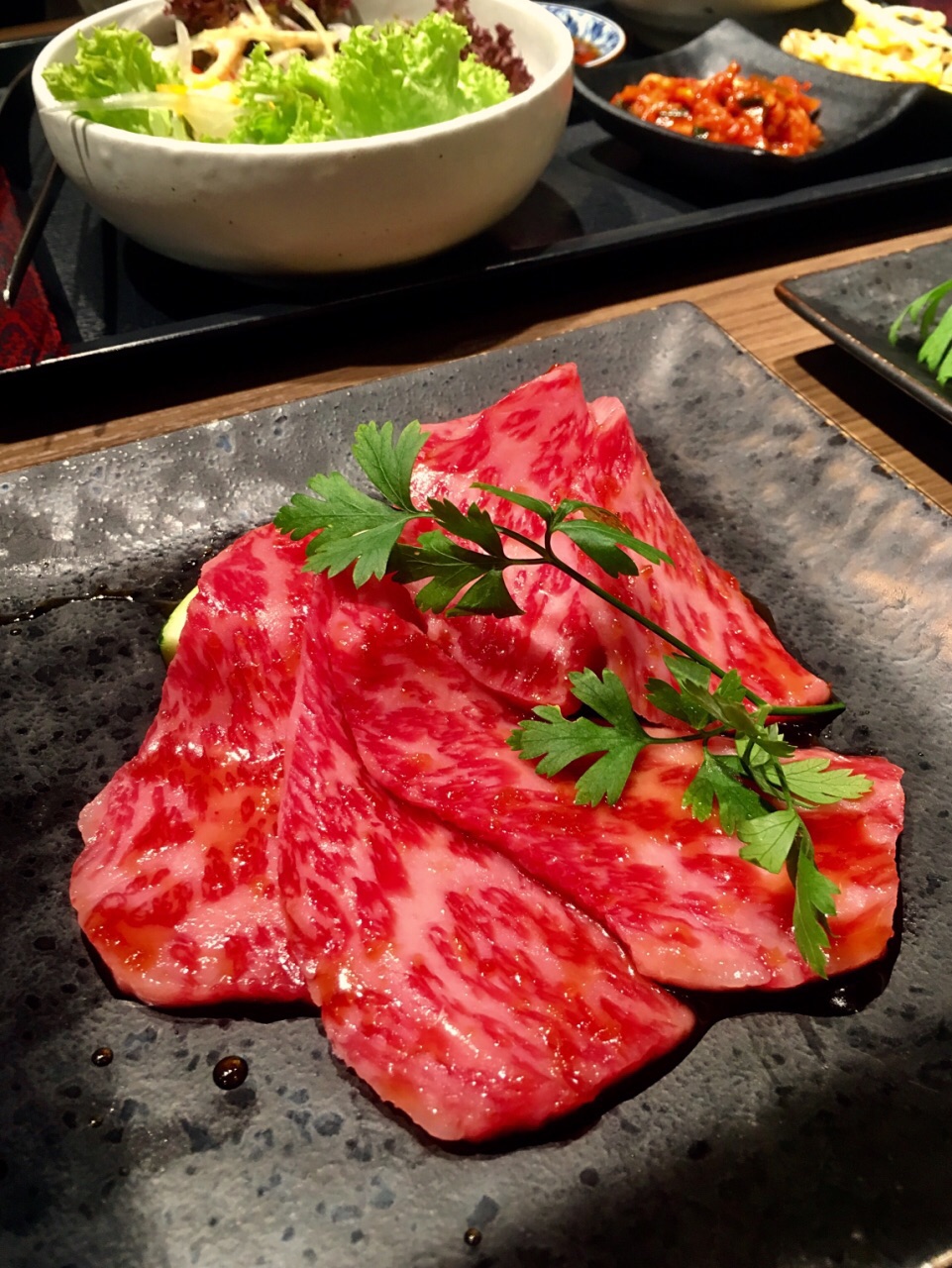 一分价钱一分货。36.9的套餐的和牛的质量比24.9的套餐和牛的质量好一个等级,前者是满满都是漂亮的油花的A4、A5,后者是一般的A3. 套餐给的肉只有五六片,但是挺大的,油渍渍的和牛烤肉吃下去,差不多五六片就正好,再多吃就要觉得腻了。吃完饭还有一杯热热的大麦茶来帮助解腻。