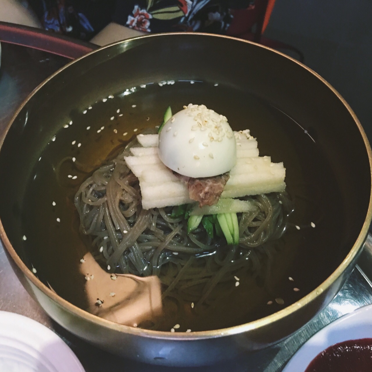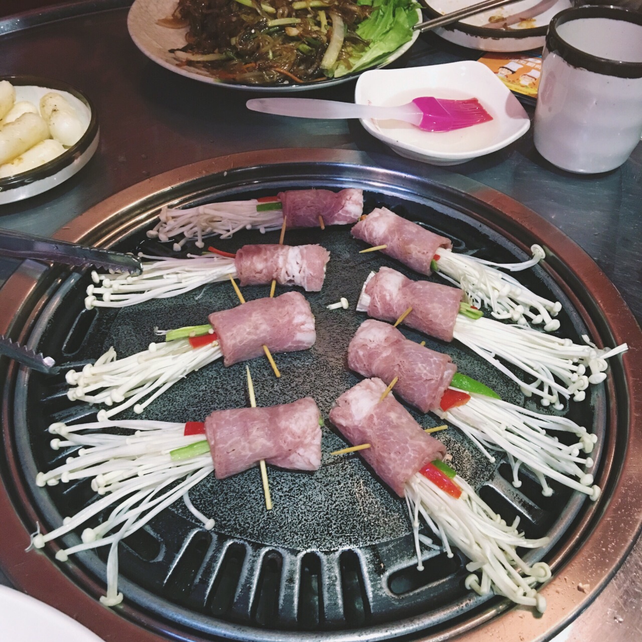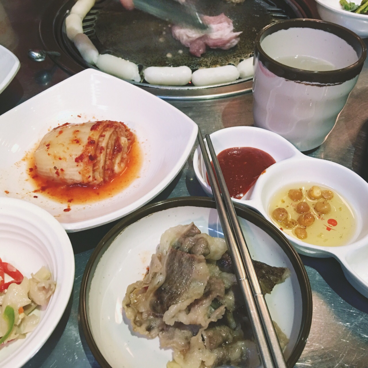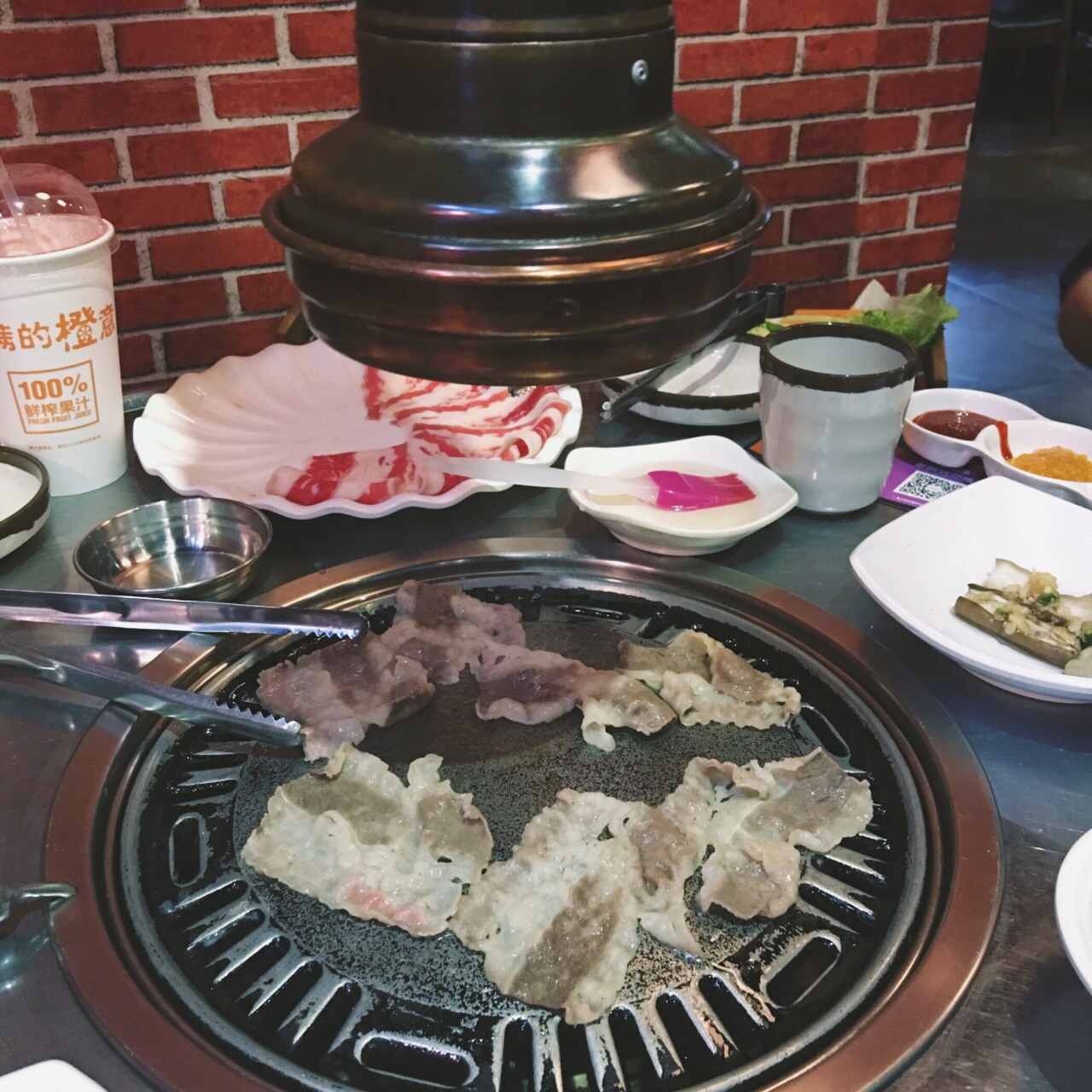 这家烤肉味道不错,换烤盘收盘子的速度也特别能跟上。我们选的是小圆桌,上面有个可以收缩的烟囱,吸烟效果不错,还蛮有感觉的。烤肉酱是自助的那种,送的小菜泡菜什么的也很好吃。还有免费的南瓜汤,我喝了整整五碗,喝回本了